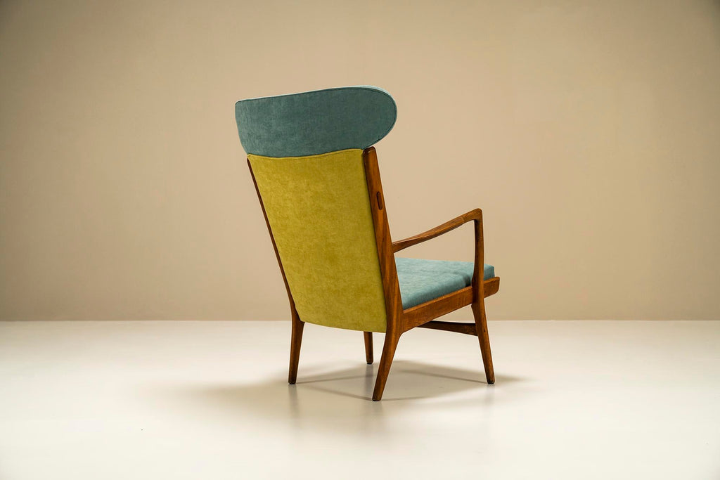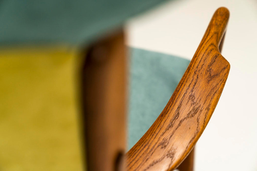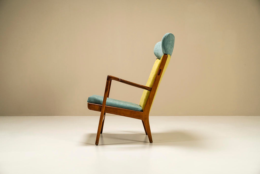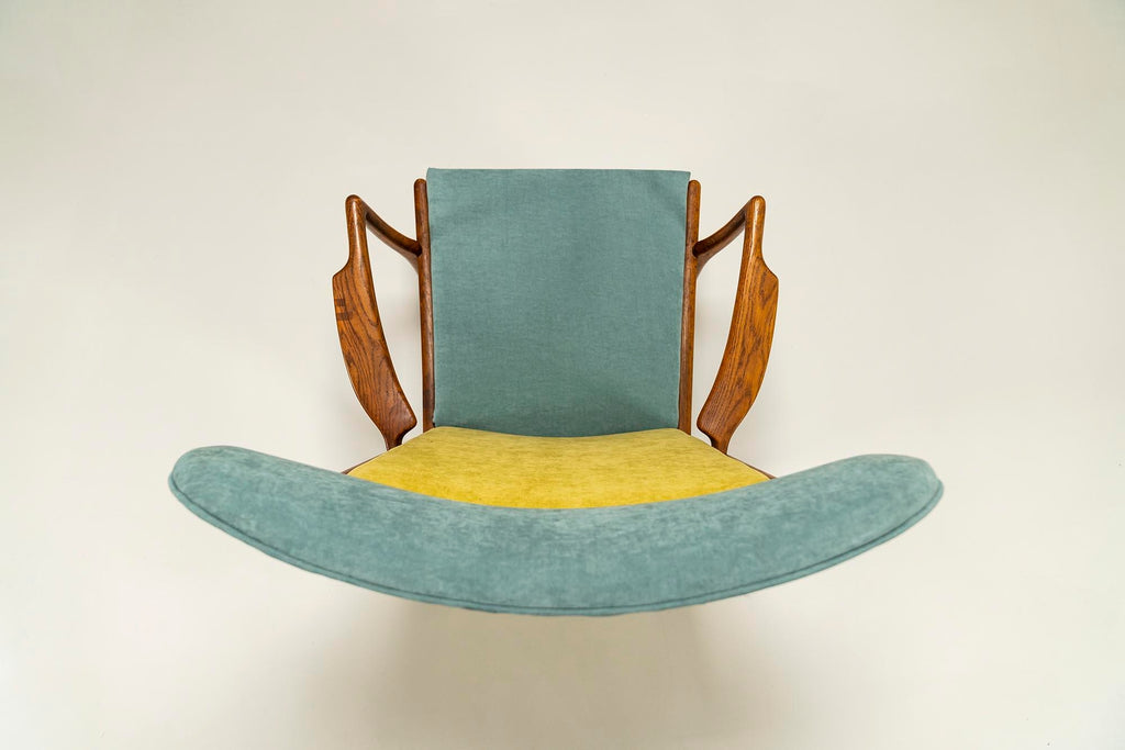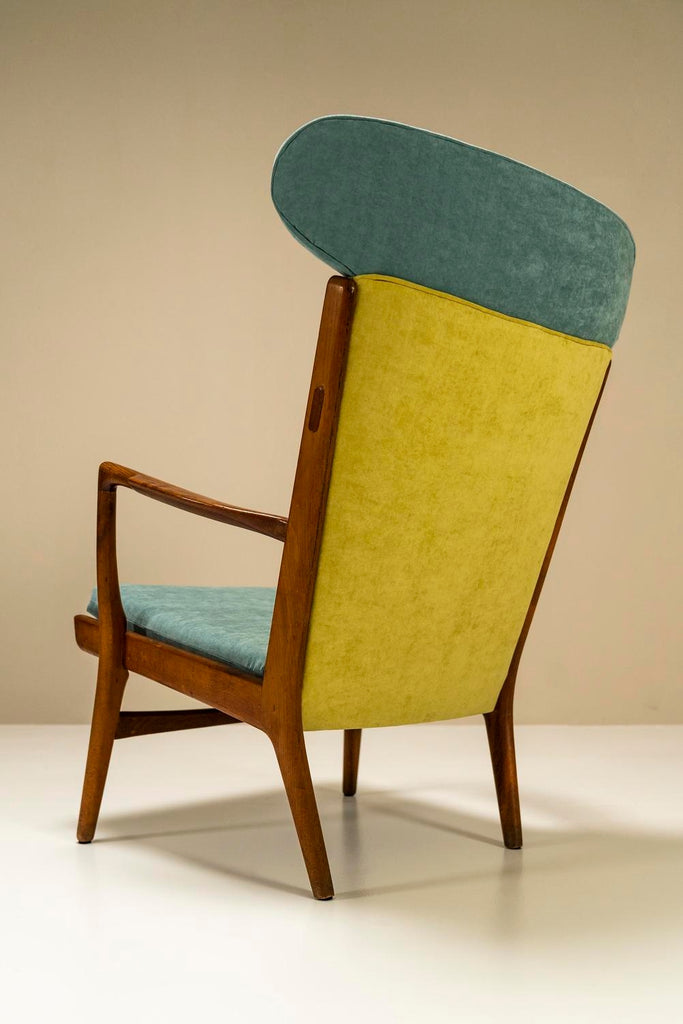 Hans Wegner는 덴마크의 위대한 디자인 거장 중 한 명이며 이 희귀한 AP-15 윙백 라운지 의자는 그의 클래스의 한 예입니다. 티크 프레임은 덴마크 목공의 마스터 클래스입니다. 바닥이 둥글게 처리된 앞다리는 유기적인 움직임으로 위쪽으로 움직이며 아름다운 목재 연결을 통해 팔걸이와 완벽하게 연결됩니다. 그것은 둥근 모양에서 직사각형 부분으로 갔다가 다시 돌아갑니다. 팔걸이는 매우 인체공학적으로 설계되었으며 팔걸이에 올려놓았을 때 팔이 완전히 편안해집니다. Wegner의 많은 디자인과 마찬가지로 뒷다리는 앞다리보다 더 가깝습니다. 그 결과 최대한의 편안함을 제공하기 위해 뒤로 약간 기울어지는 매우 견고한 의자가 탄생했습니다. 우리는 아름다운 파티나를 지적할 기회를 갖고 싶습니다. 짙은 갈색 티크는 액센트와 다양한 색조로 아름답게 숙성되었습니다. 이 라운지 의자의 좌석 공간은 정말 놀랍습니다. 8개의 오리지널 압축 스프링이 넓은 좌석을 지탱하고 넉넉한 등받이가 이 의자에 앉는 사람을 감싸 안아줍니다. 게다가 커다란 날개가 항상 머리를 받쳐줍니다. 의자는 대담한 투톤 라이트 블루와 부드러운 옐로우 벨루어로 다시 천을 씌워 AP-15의 외관을 독특하게 만듭니다. 프레임에 군데군데 요철이 있어 상태 양호합니다. 오래된 수분 얼룩과 변색이 여기에 속합니다. 눈에 띄는 외관에는 영향을 미치지 않습니다.