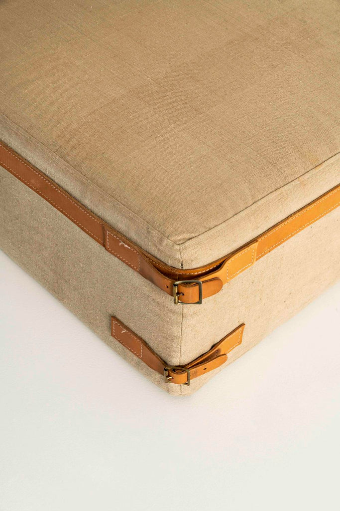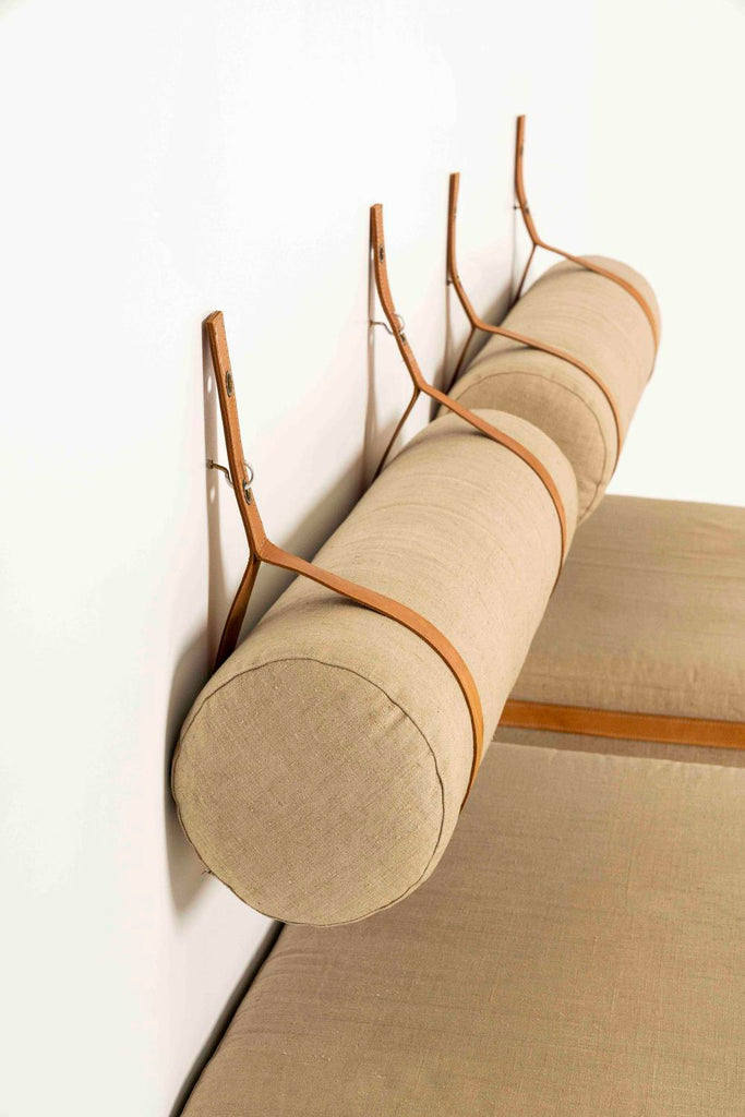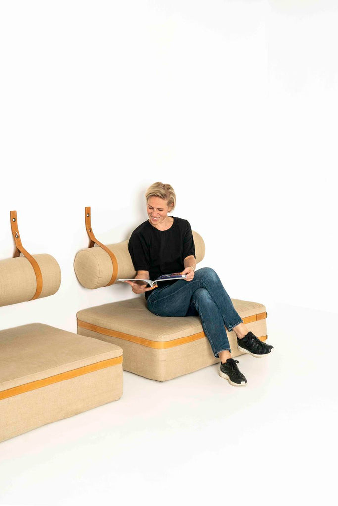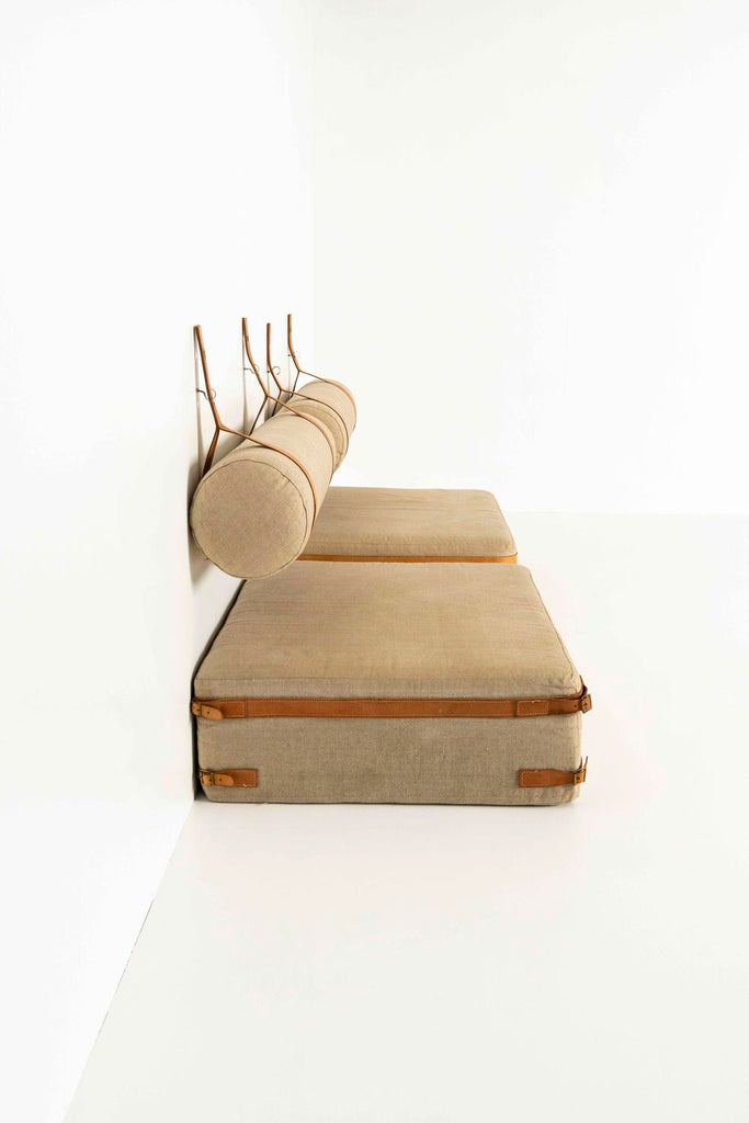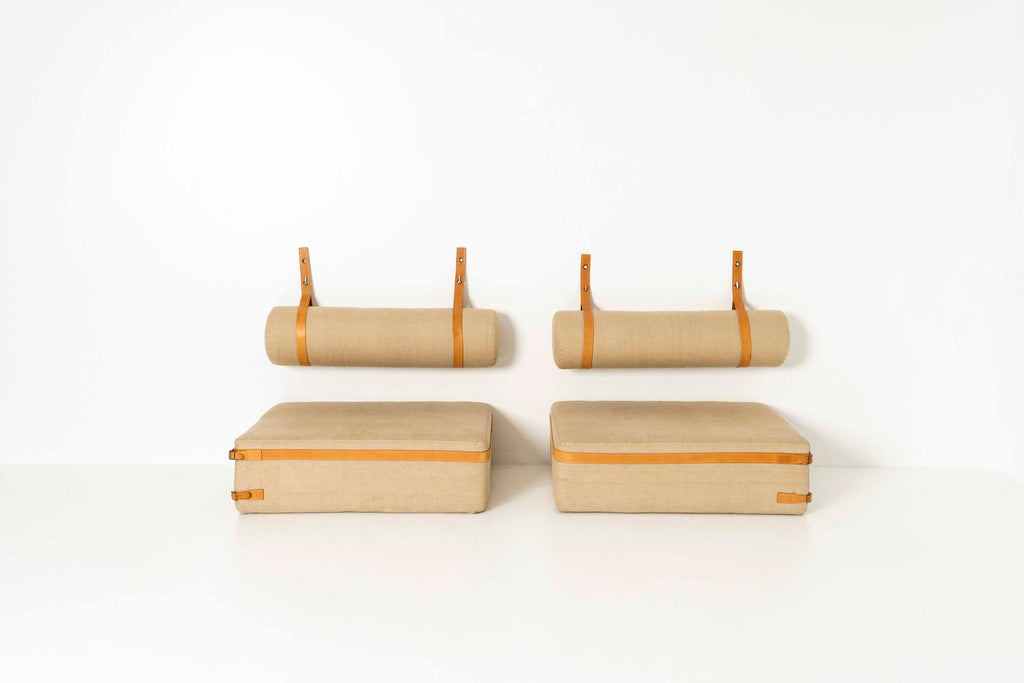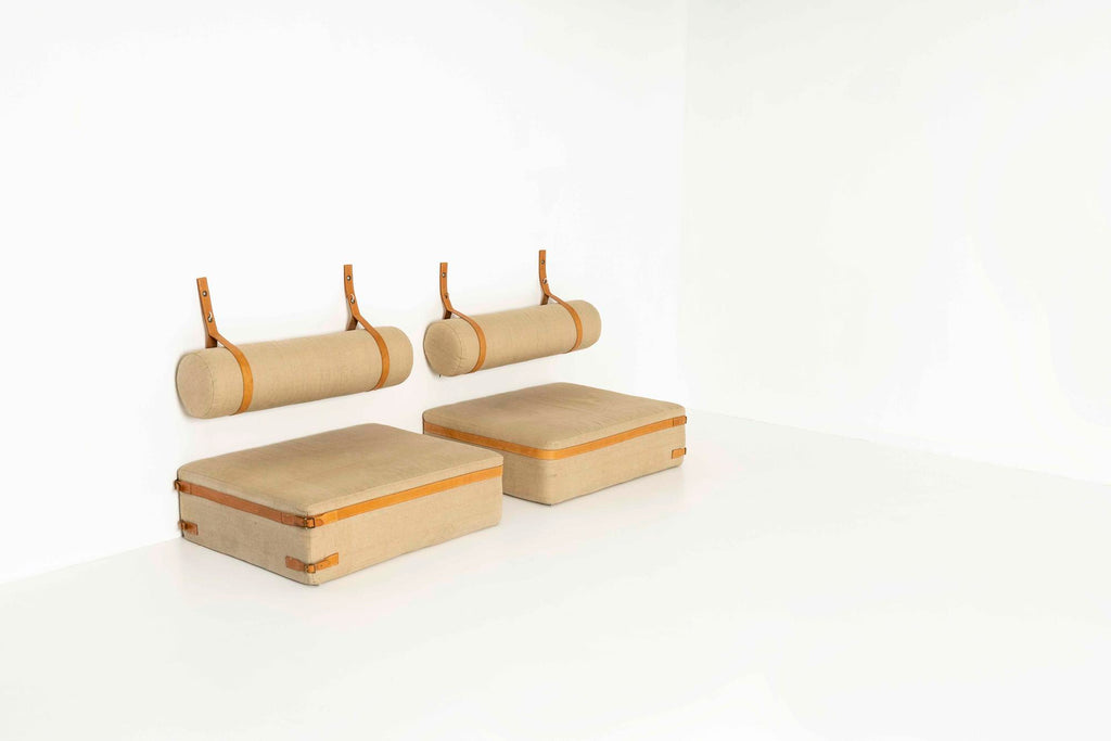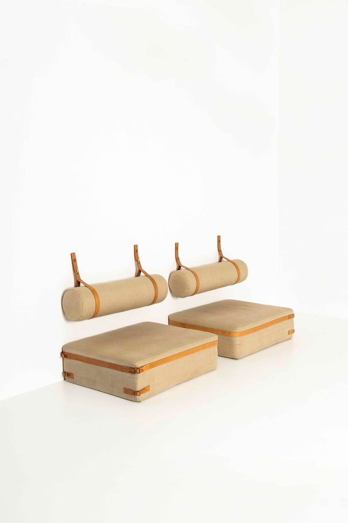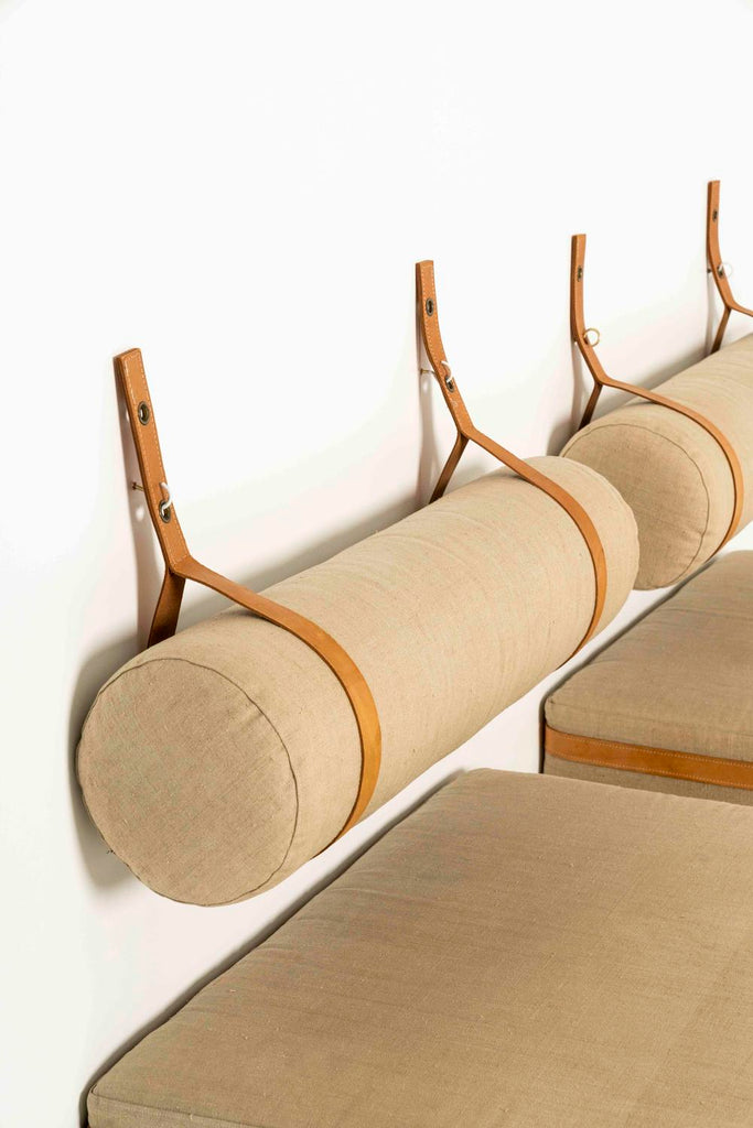패브릭과 가죽 스트랩의 이탈리안 빈티지 모듈러 라운지 소파. 이 세트는 베이지 색상 패브릭과 코냑 가죽 스트랩의 두 가지 시트 요소로 구성되어 있습니다. 동일한 가죽 스트랩을 사용하여 두 개의 둥근 등받이 요소를 벽에 장착할 수 있습니다. 장난기 넘치고 현대적인 사파리 분위기의 멋진 작품입니다.