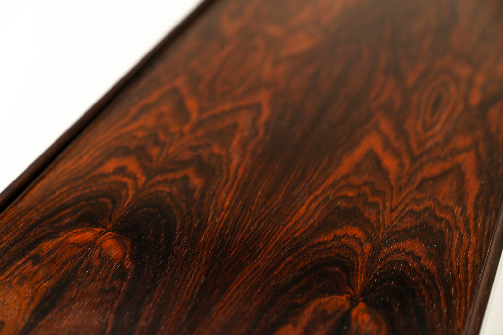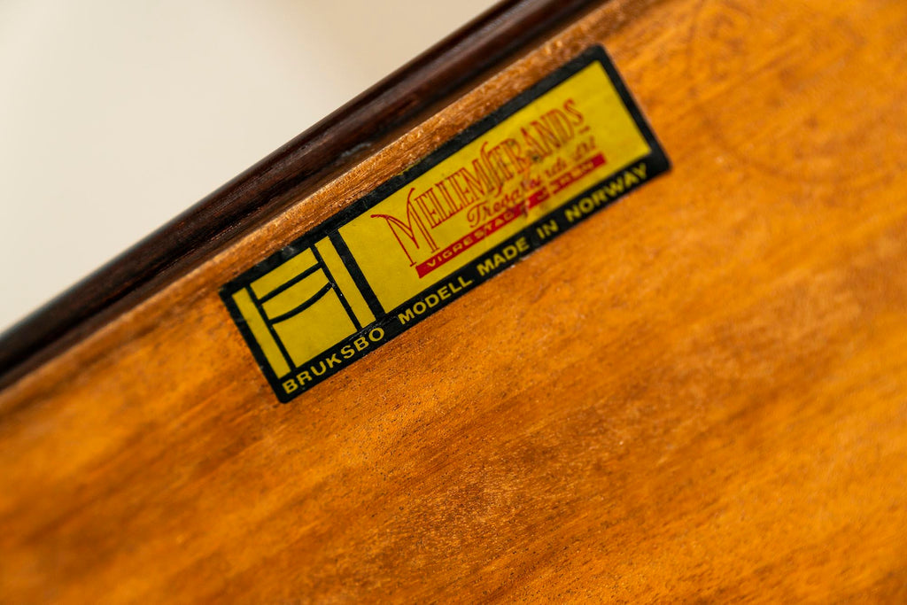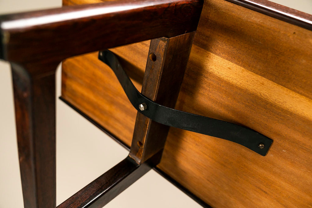 우리는 Tørbjorn Afdal이 디자인한 이 Krobo 벤치를 왕실의 고전이라고 부를 수 있습니다. 그의 이름은 Jackie O와 일본 천황이 그의 가구를 구입한 후 더 널리 알려졌으며 오늘날까지도 여전히 웅장함을 지닌 인테리어의 필수품입니다. 우아함은 단순함과 완전히 아름다운 비율에 있습니다. 시트 측면의 가장자리는 똑바로 세워져 있을 뿐만 아니라 바닥에서 약간 더 돌출되어 있고 끝 부분이 없습니다. 다리도 극도의 기교감으로 디자인되어 있고, 곡선으로 인해 중간 바닥에서 불과 1센티미터만 들어 올려져 있습니다. 벤치 하단에는 세 지점에서 다리를 좌석 공간에 연결하는 두 개의 금속 브래킷이 있습니다. 그 결과 전례 없는 견고성과 향상된 내하중 용량을 제공합니다. 이 특정 벤치를 특별하게 만드는 것은 로즈우드입니다. 푸른 녹은 정말 환상적이지만 진정한 아름다움은 시트의 불꽃 그림에 있습니다. 양쪽 끝에서 그림은 극적이며 가운데로 갈수록 차분해집니다. 이것은 진정한 스펙터클을 만들어 내므로 이 디자인의 강점인 모든 겸손함 속에서 주목을 받습니다. 이 벤치의 상태는 합판에 약간의 가벼운 균열이 흩어져 있어 좋습니다. 베니어의 한쪽에는 과거의 습기 손상으로 인해 약간의 돌출이 있습니다. 벤치는 밑면에 Bruksbo 스티커와 스탬프로 표시되어 있습니다.