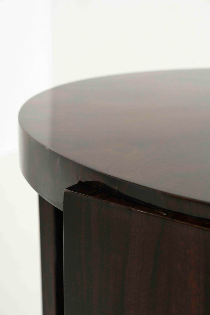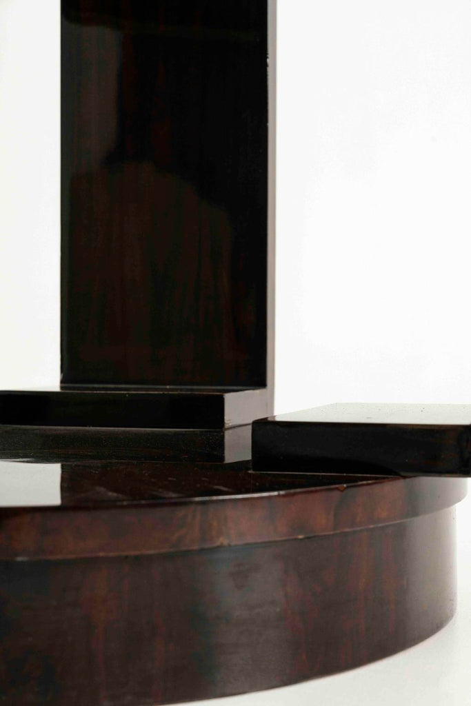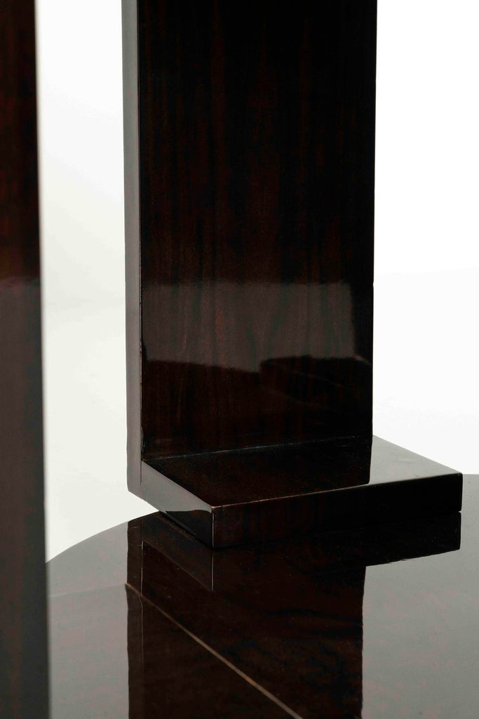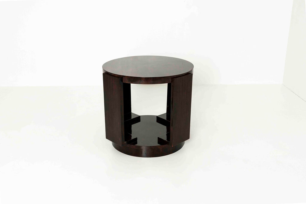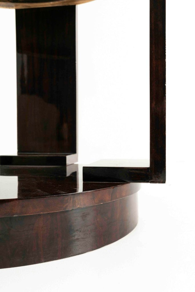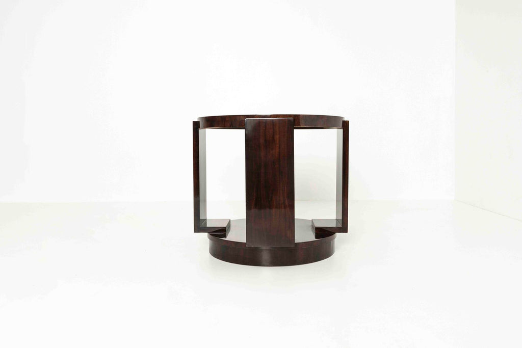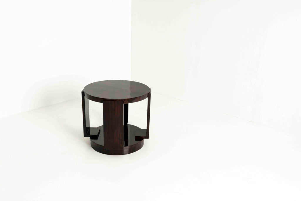 1930년대 프랑스의 멋진 짙은 갈색 옻칠 아르데코 커피 테이블. 이 둥근 커피 테이블은 매우 눈에 띄는 연결로 위에서 아래로 이어지는 4개의 다리가 있는 멋진 디자인을 가지고 있습니다.