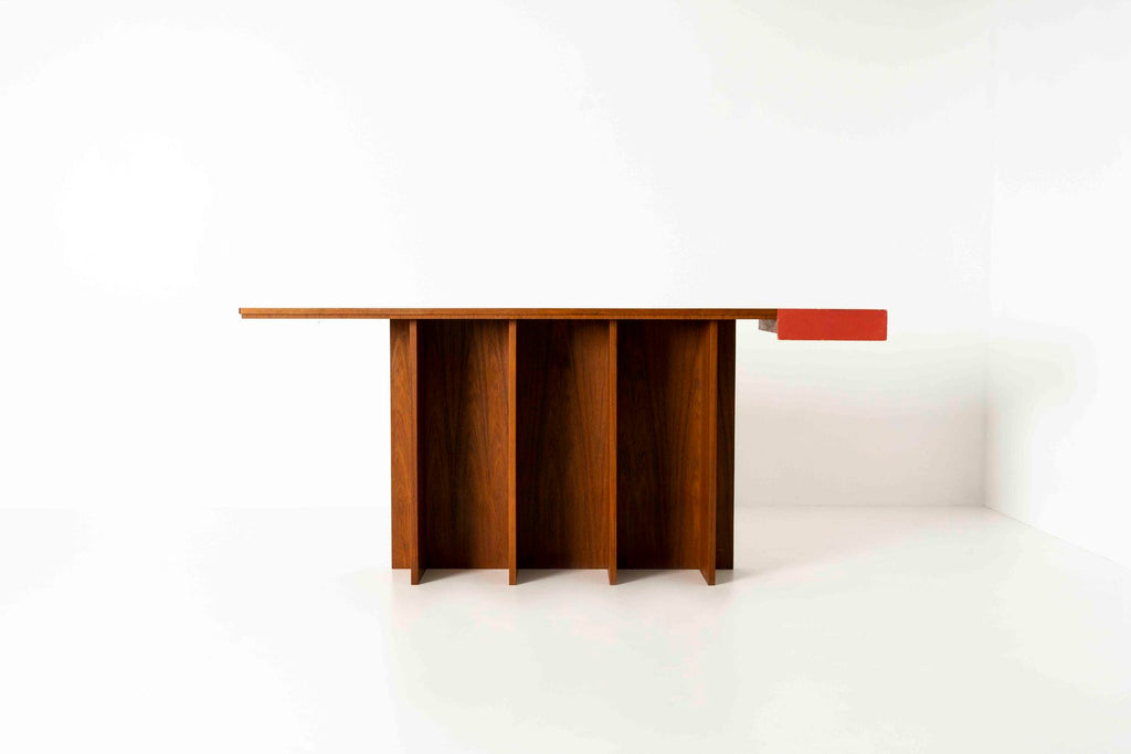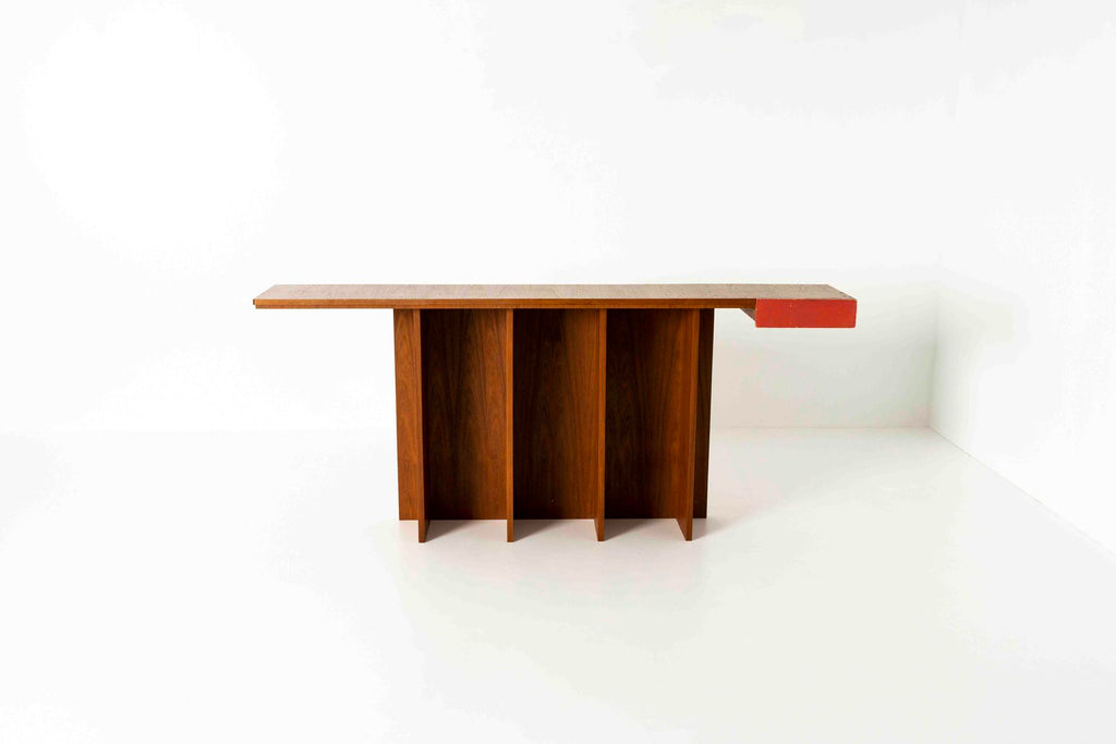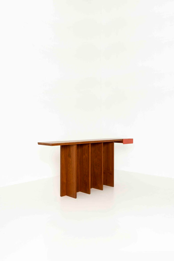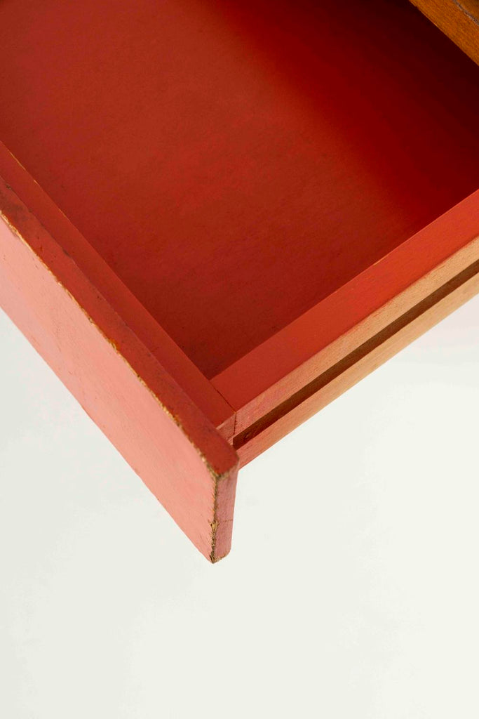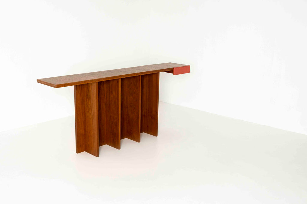 대형 이탈리아 빈티지 콘솔 attr. 1960년대부터 폴트로노바까지. 이 콘솔은 수직 라인의 베이스와 미니멀한 디자인을 가지고 있습니다. 핑크색 래커 서랍은 콘솔에 멋진 터치를 더합니다. 우리는 서랍의 녹청이 마음에 들어서 그대로 유지하기로 결정했지만 쉽게 다시 칠할 수 있습니다. 콘솔은 세월에 따른 약간의 사용감만 있을 뿐 양호한 상태입니다.