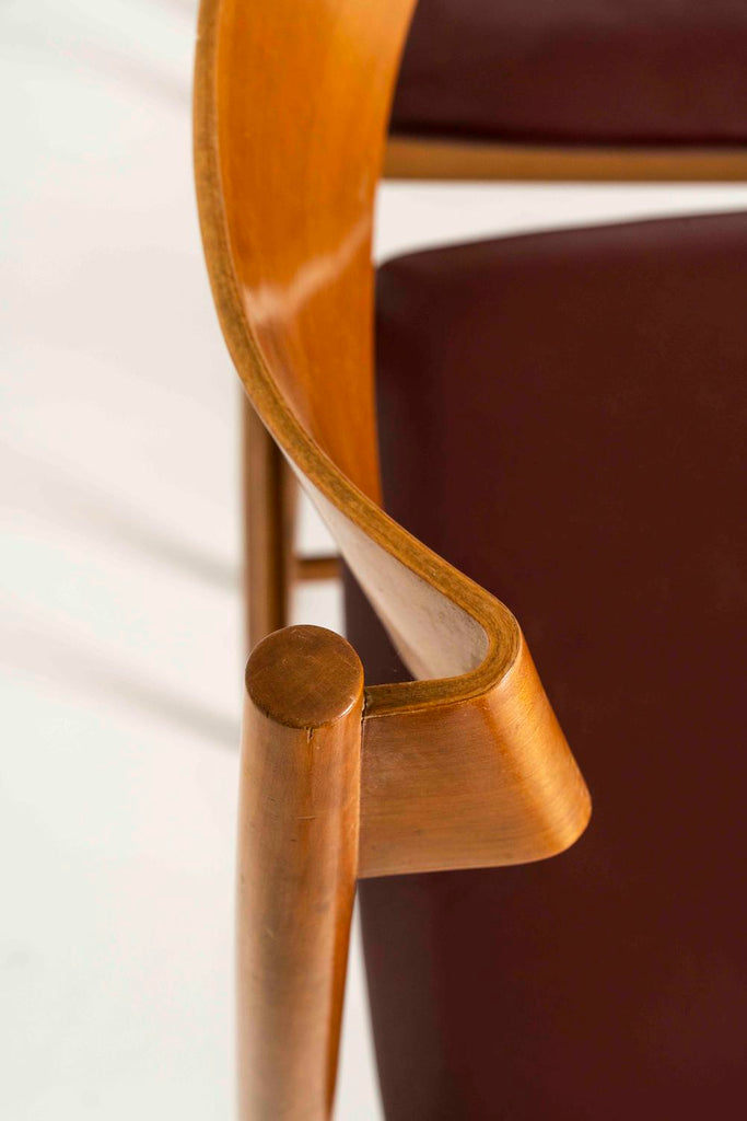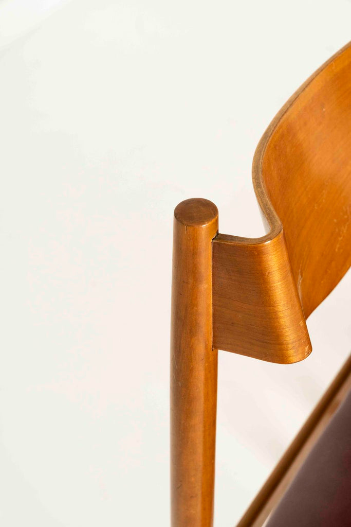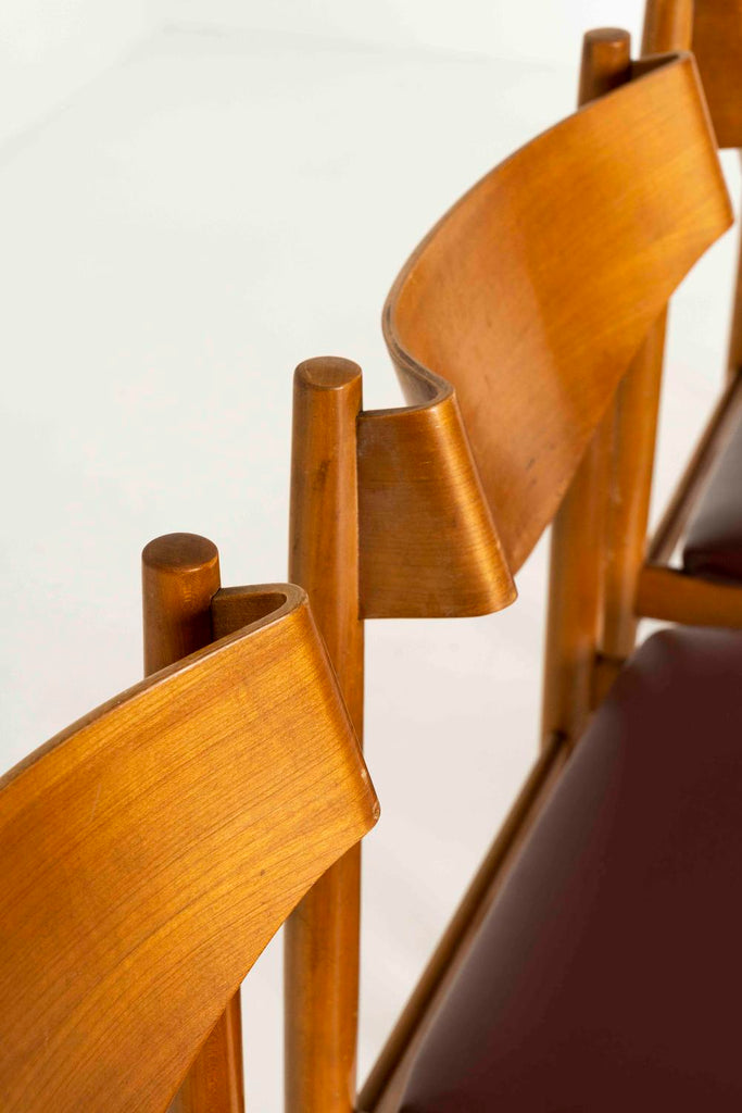 1960년대 카시나를 위한 지안프랑코 프라티니의 다이닝 체어 4개 세트. 의자는 몰딩된 합판 등받이와 빨간색(인조) 가죽이 있는 티크재로 만들어졌습니다. 그들은 훌륭한 미학을 가지고 있으며 그들의 나이로 인해 정상적인 사용과 찢어진 상태로 좋은 상태를 유지하고 있습니다. 가죽 상태는 좋습니다.