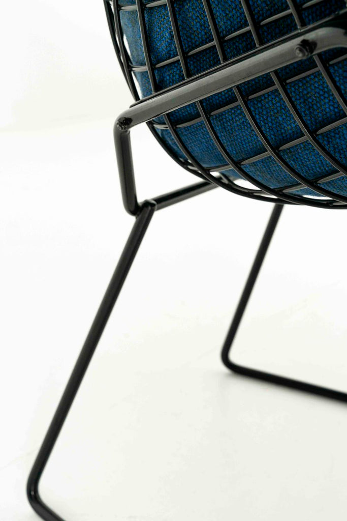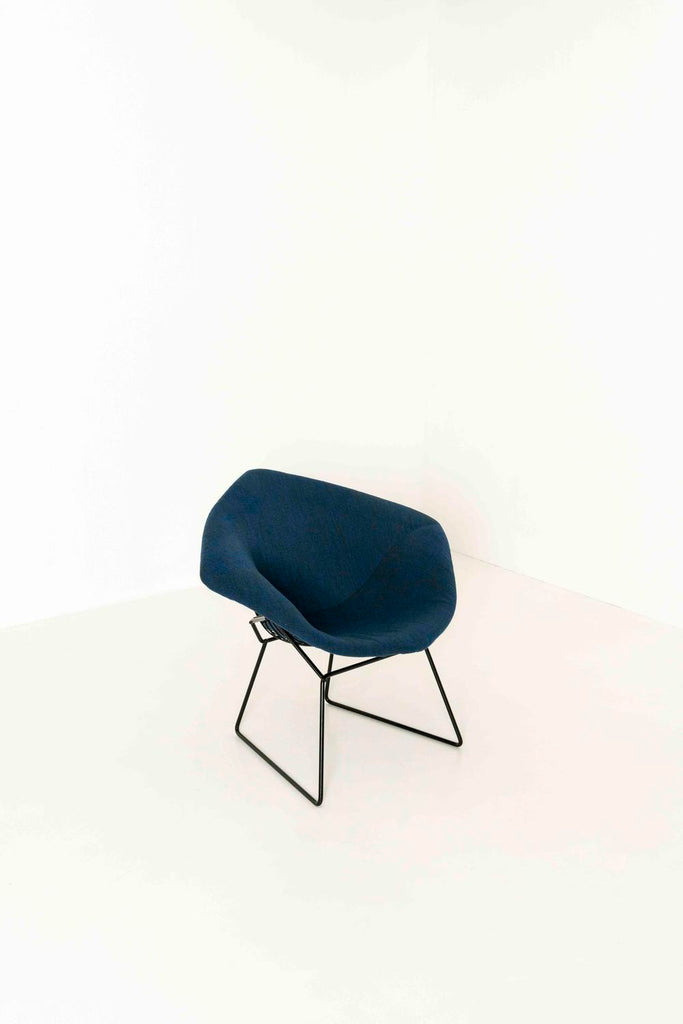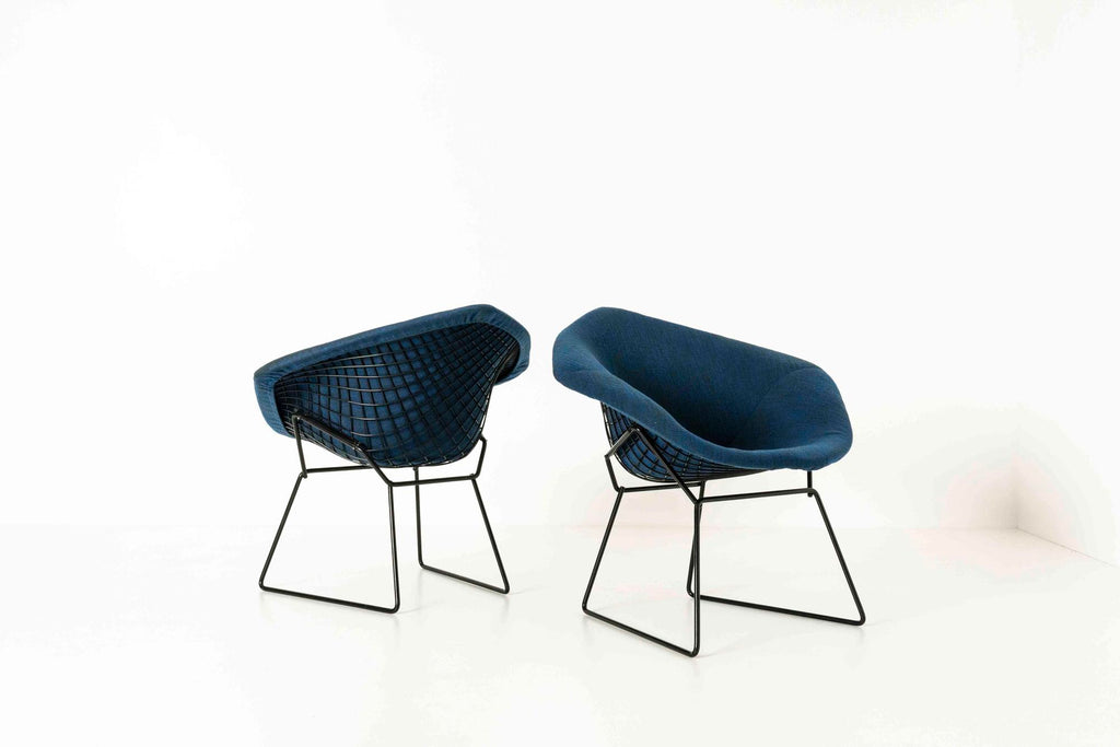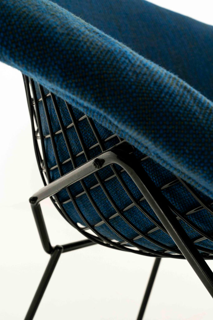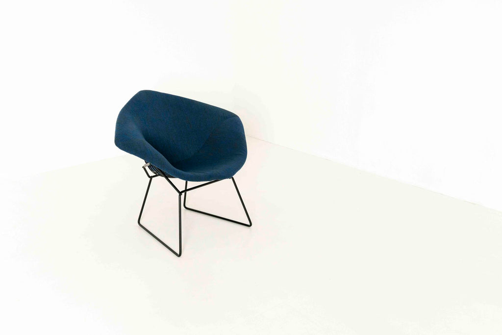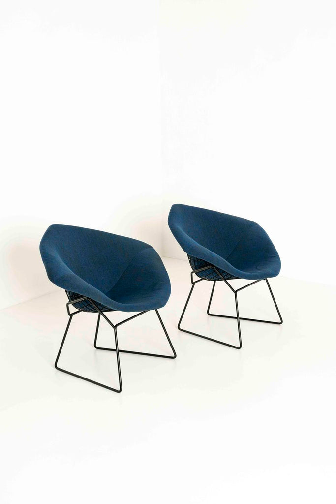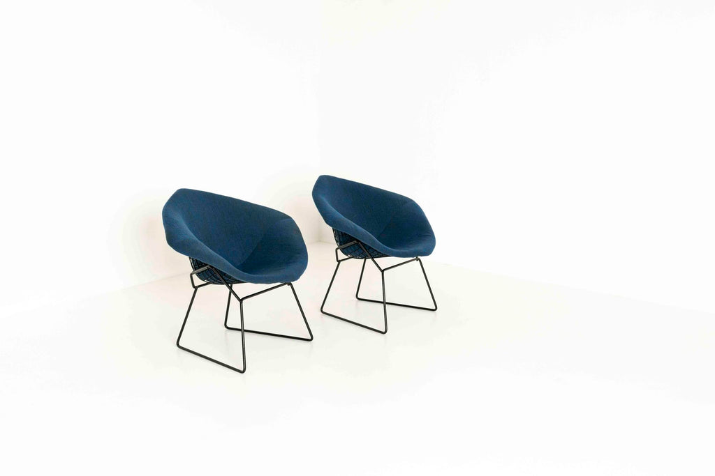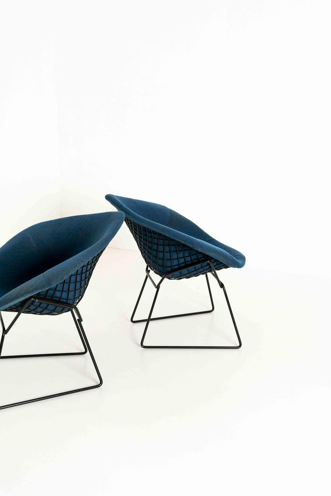 Kvadrat 패브릭으로 Knoll을 위한 Harry Bertoia의 다이아몬드 라운지 체어 2개 세트. 이 의자는 검은색 프레임, 완전히 덮인 좌석 공간 및 파란색 혼합 패브릭이 있습니다.