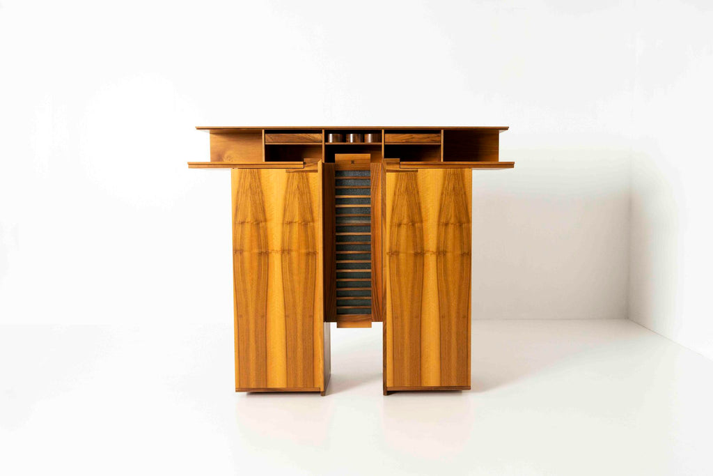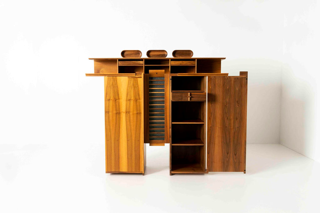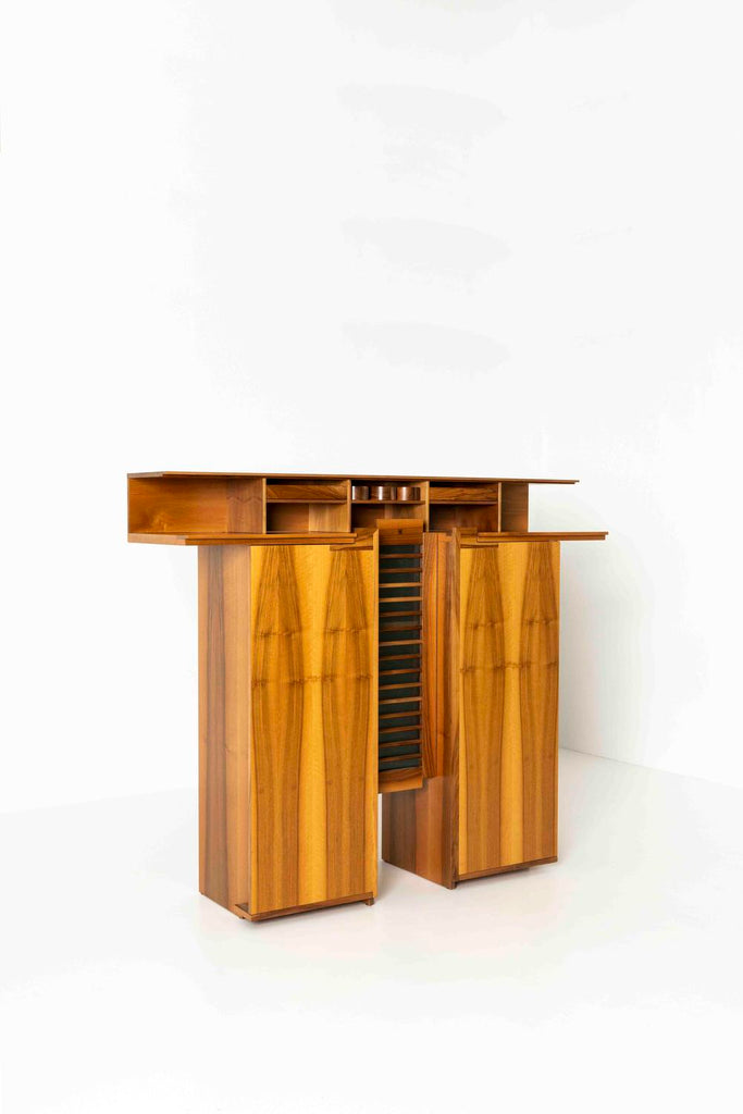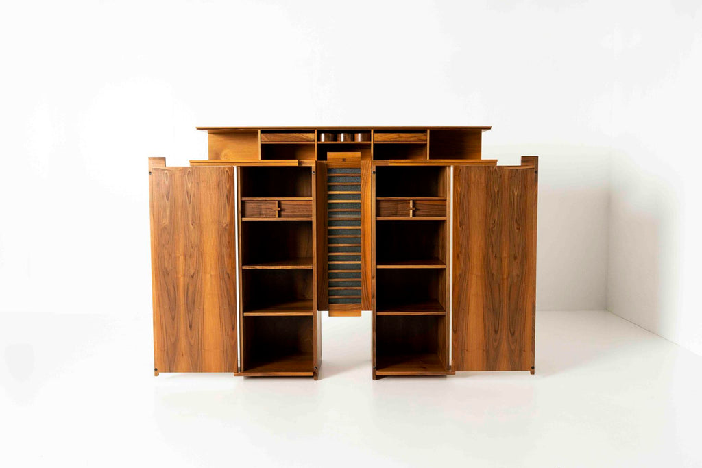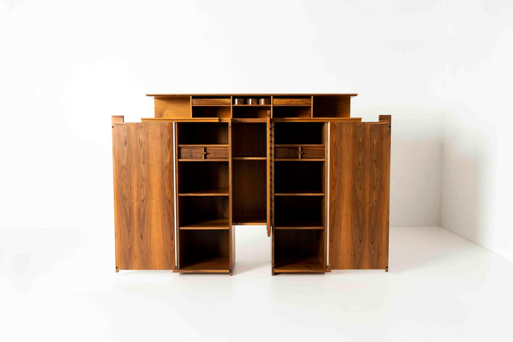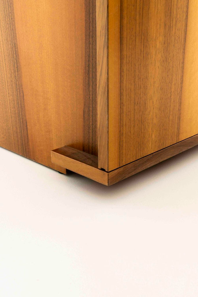 1970년대 이탈리아 베르니니를 위한 '스칼리제라' 시리즈의 프랑코 폴리 사이드보드. 호두나무와 유리로 된 이 사이드보드는 우리 컬렉션에서 가장 좋아하는 것 중 하나입니다.