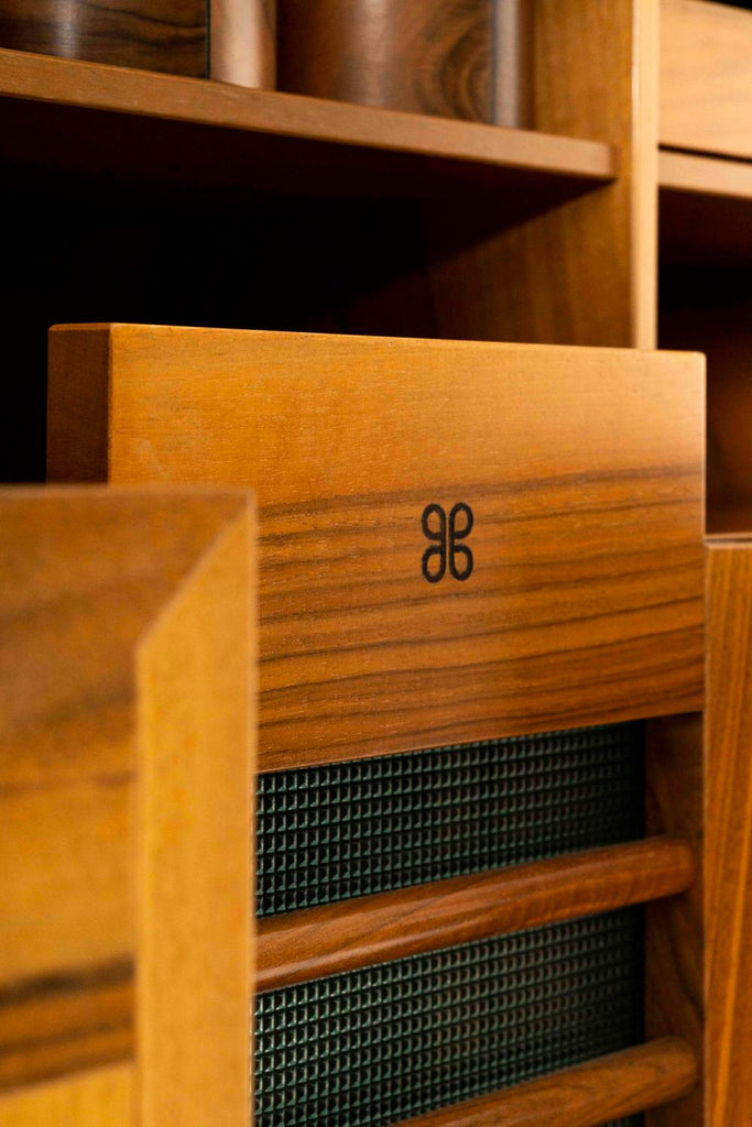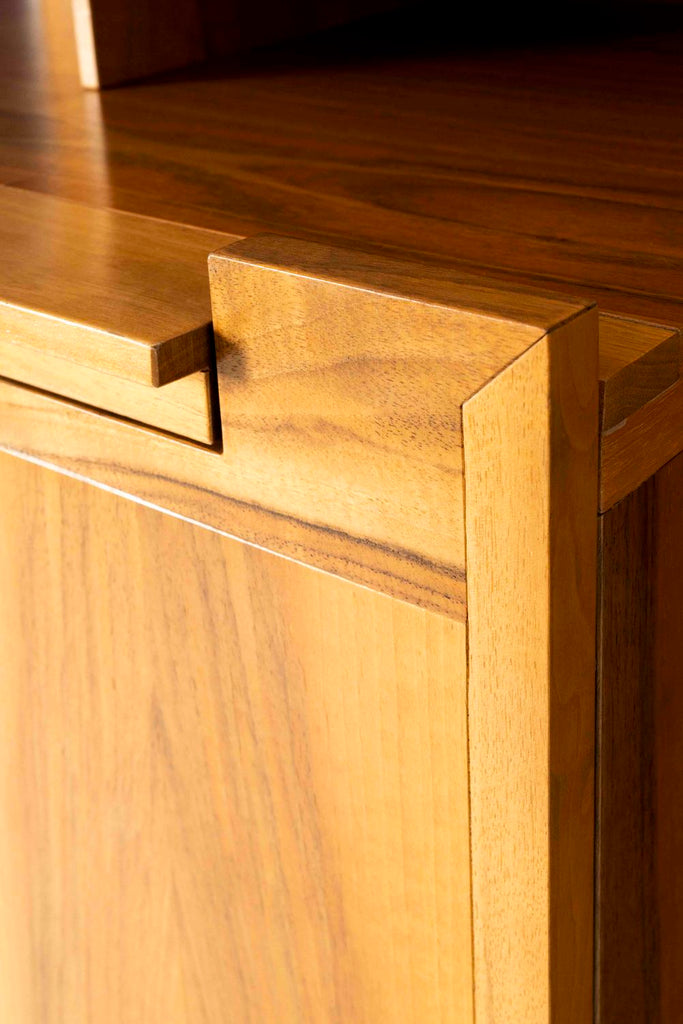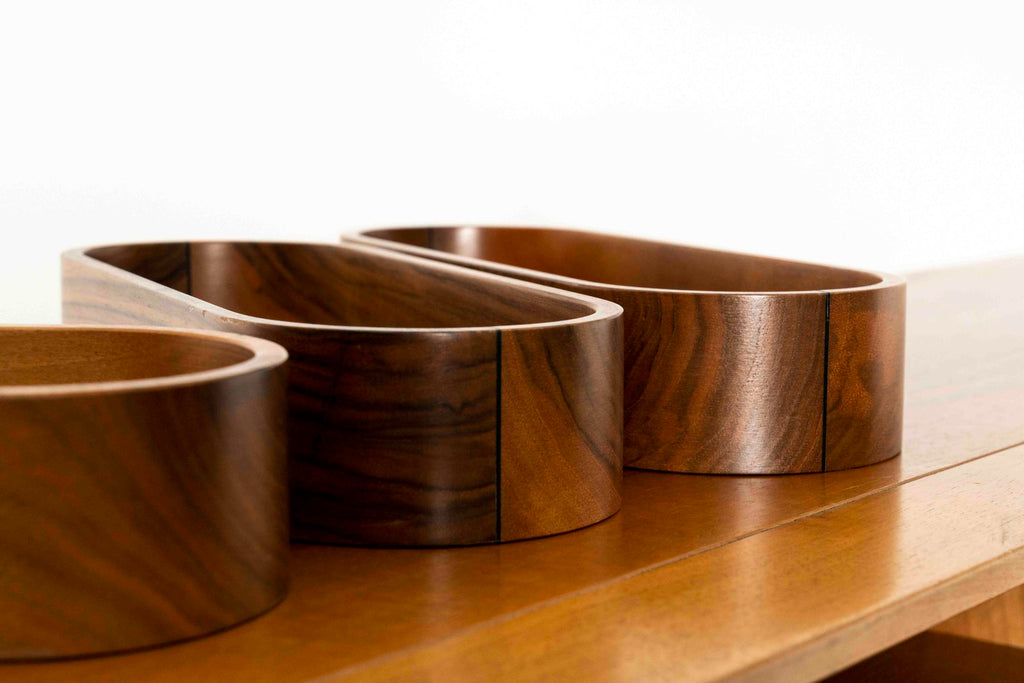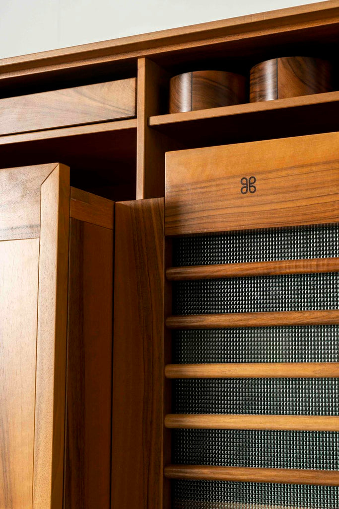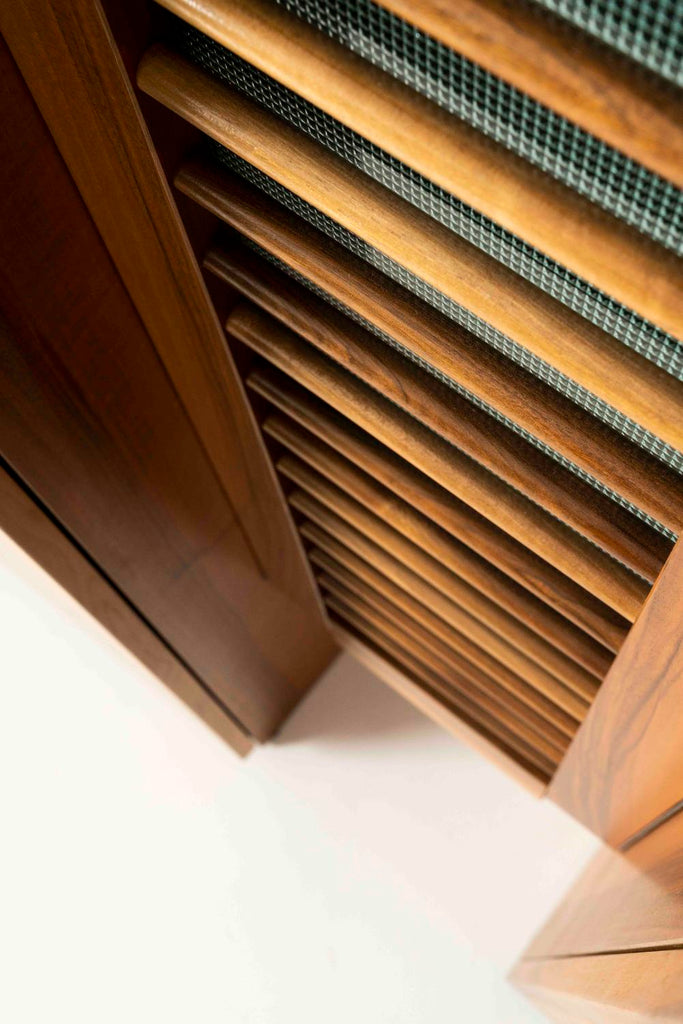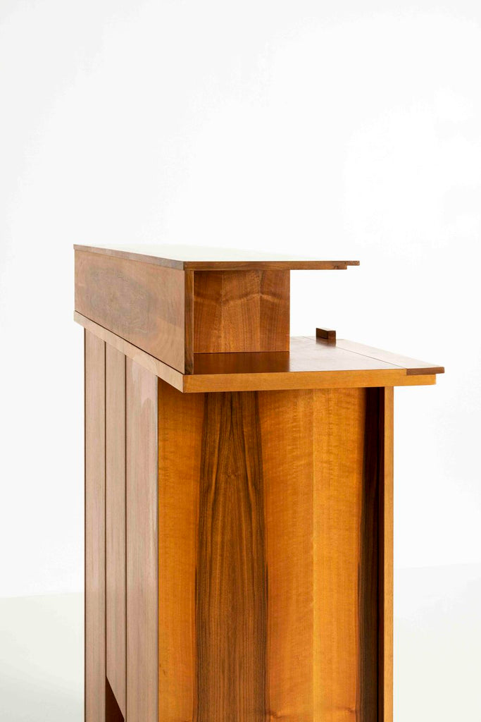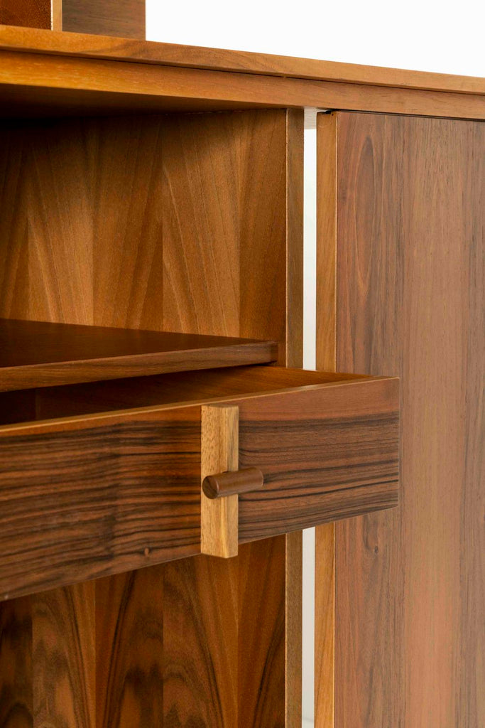 1970년대 이탈리아 베르니니를 위한 '스칼리제라' 시리즈의 프랑코 폴리 사이드보드. 호두나무와 유리로 된 이 사이드보드는 우리 컬렉션에서 가장 좋아하는 것 중 하나입니다.