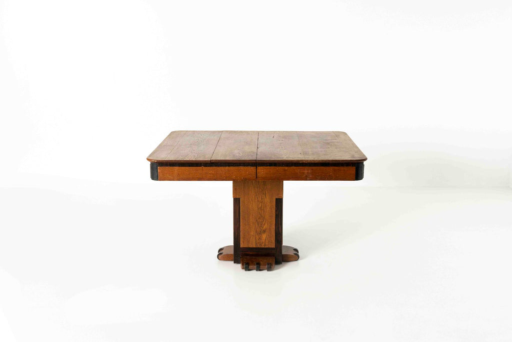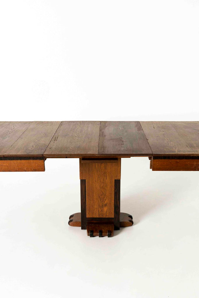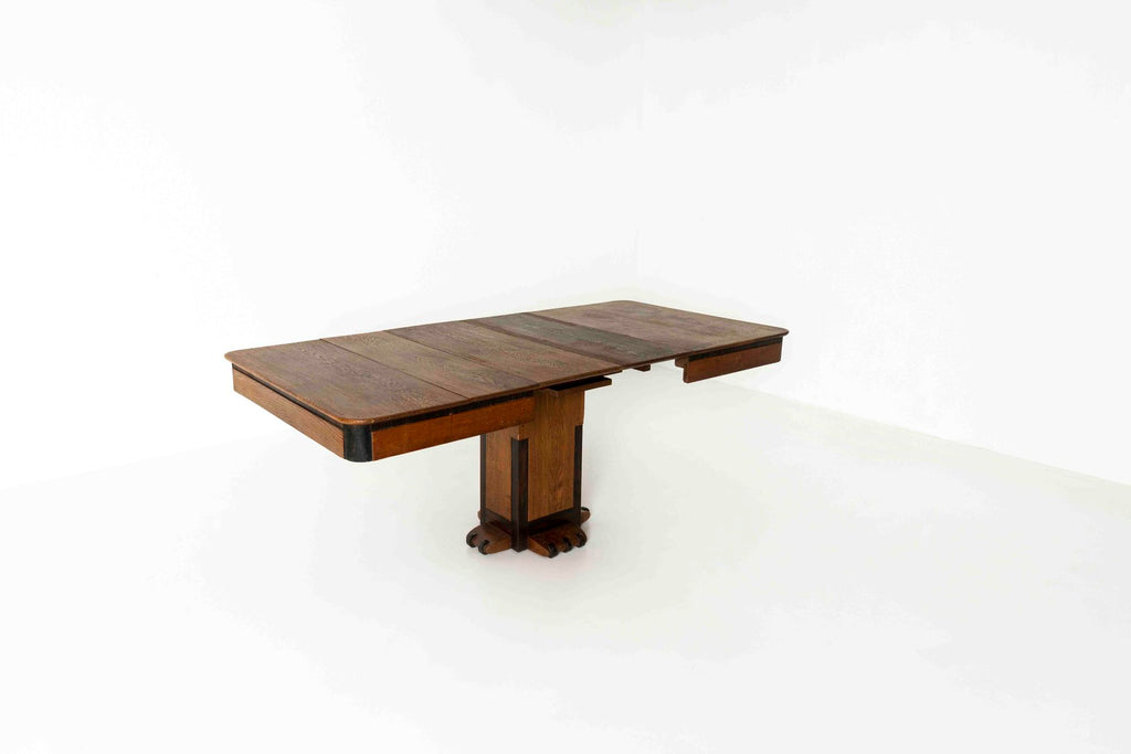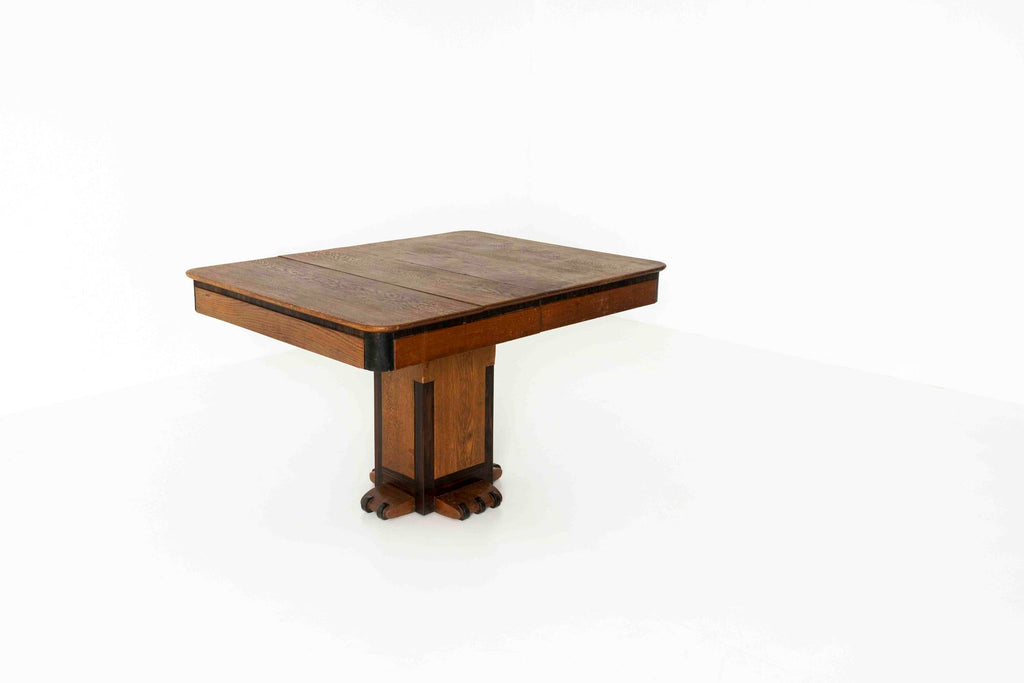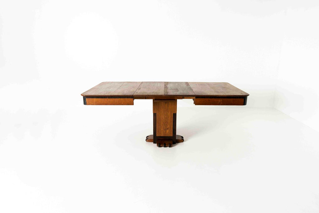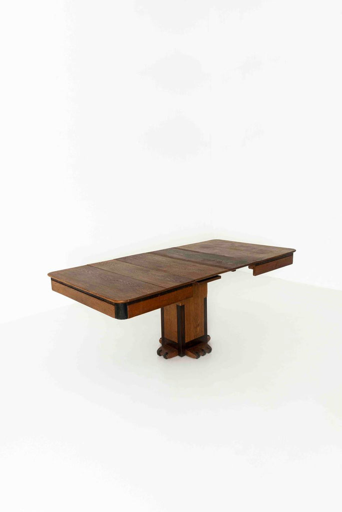 1920년대 네덜란드 헤이그 학교의 확장 가능한 식탁. 이 테이블에는 '사자의 발톱'처럼 보이는 인상적인 받침대가 있습니다. 상단에는 테이블 너비를 총 187cm로 만드는 두 개의 추가 요소가 숨겨져 있습니다.
