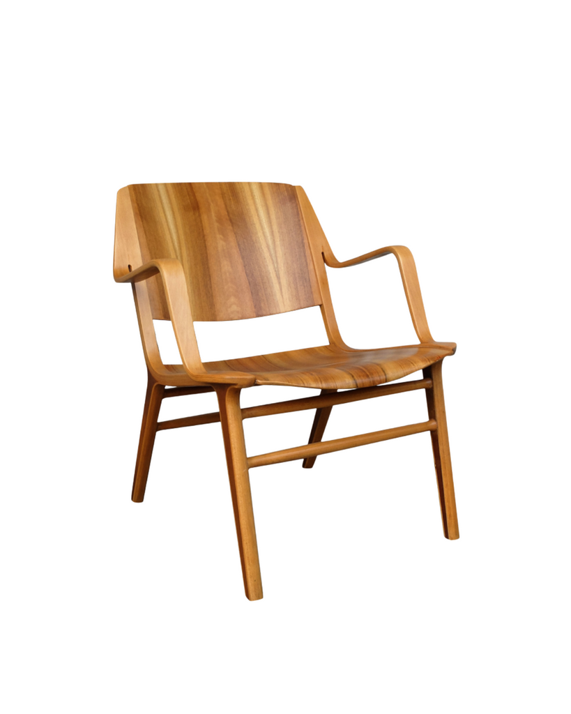 호두 무늬목과 너도밤나무 합판으로 만든 라운지 체어.