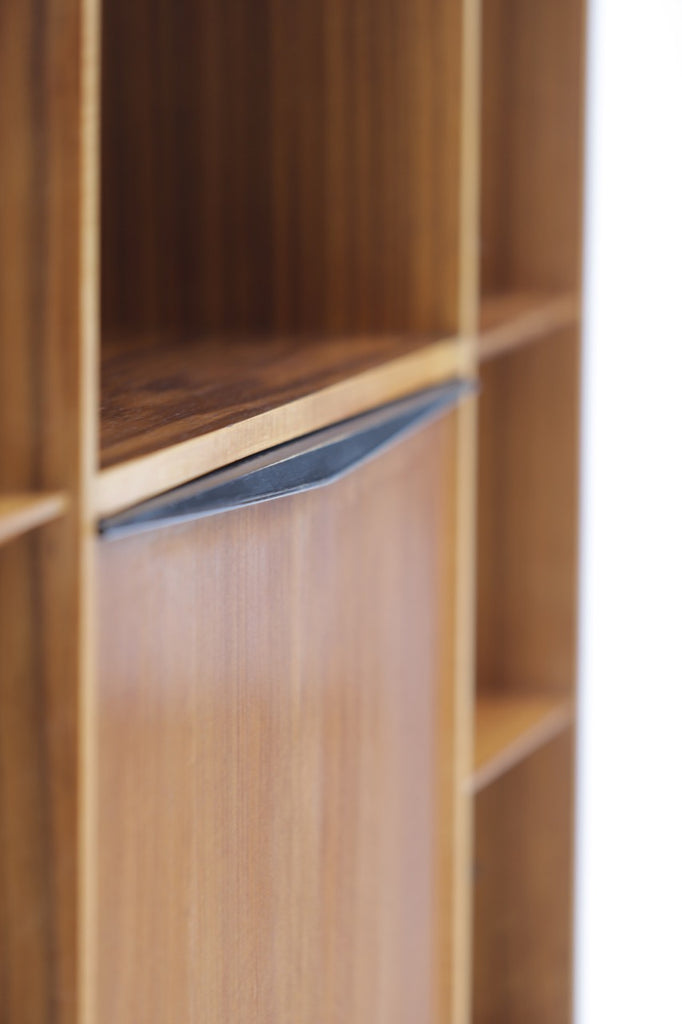 접이식 책상은 책상 용품을 보관할 수 있는 책상과 작은 선반이 있는 더 큰 중간 문 뒤에 숨겨져 있습니다. 하이보드는 우아한 형태의 검은색 가죽 프레임에 놓여 있습니다.