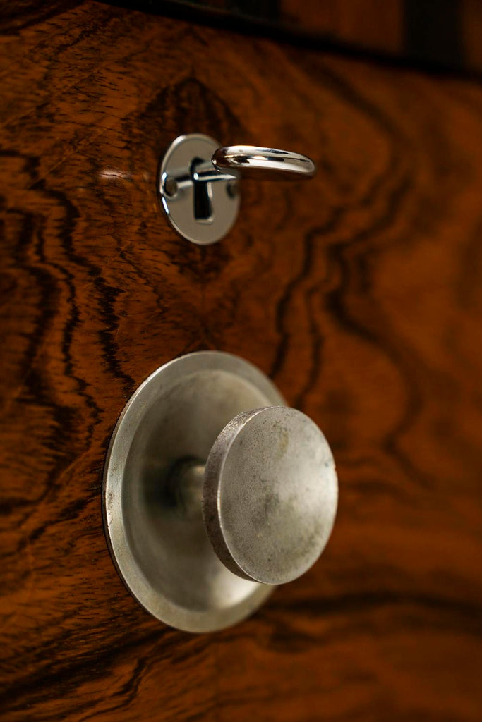1950년대의 이 특별한 이탈리아 아르데코 하이보드는 1분 동안 처리해야 하는 세련된 눈길을 사로잡는 제품입니다. 그 시대의 고품질 가구 제조를 위한 전형적인 목재 유형은 Macassar 흑단입니다. 이 개체는 그것으로 완전히 베니어 처리되었으며 이 특히 고품질 베니어는 전문적으로 적용되어 어느 정도의 미학이 목재의 불꽃 드로잉이 수평 또는 수직 방향을 취하는지 여부를 결정합니다. 물론 이것은 또한 작품의 드라마를 결정하지만 잠시 후에 더 자세히 설명합니다. 아름다운 비율의 다리는 수평으로 그려져 있으며 중간에 두 개의 은색 밴드 형태로 특별한 장식 요소가 제공됩니다. 이것은 아름답게 닦은 강철 상감 판이며 나무와 특별한 대조를 이룹니다. 캐비닛의 가장 넓은 부분은 니켈 자물쇠와 열쇠로 열고 닫을 수 있는 다리에 있습니다. 은색으로 칠해진 고리가 있는 원통형 손잡이가 바로 아래에 있습니다. 황동 경첩으로 앞으로 떨어지는 이 캐비닛 도어를 열면 완전히 자연스러운 베니어 인테리어가 보입니다. 한 레벨 업은 이 유쾌한 외관의 진정한 저항입니다. 외관은 강철 손잡이와 니켈 잠금 장치와 함께 아름다운 벌 우드 베니어로 장식되어 있습니다. 문의 다른 쪽은 옻칠한 단풍나무로 베니어판이 있고 캐비닛의 뒷벽을 보면 드라마가 계속됩니다. 이곳은 거울로 덮여 있고 가운데 사각거울이 공간을 분할한다. 그리고 마지막으로 양쪽에 있는 두 개의 베니어 부분이 전체 작품을 완성합니다. 상태는 연령 및 사용과 완전히 일치하지만 표면 긁힘 및 얼룩만 있습니다. 베니어의 색상은 놀랍고 매우 생생합니다.