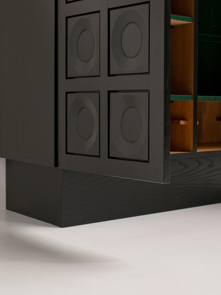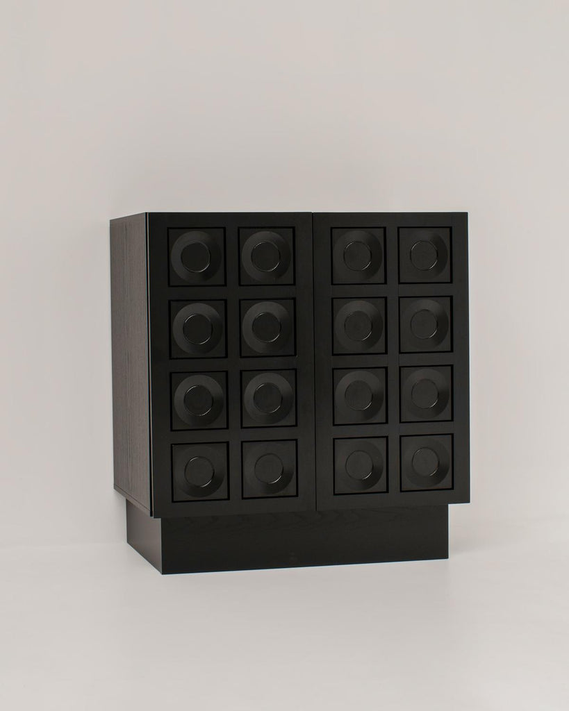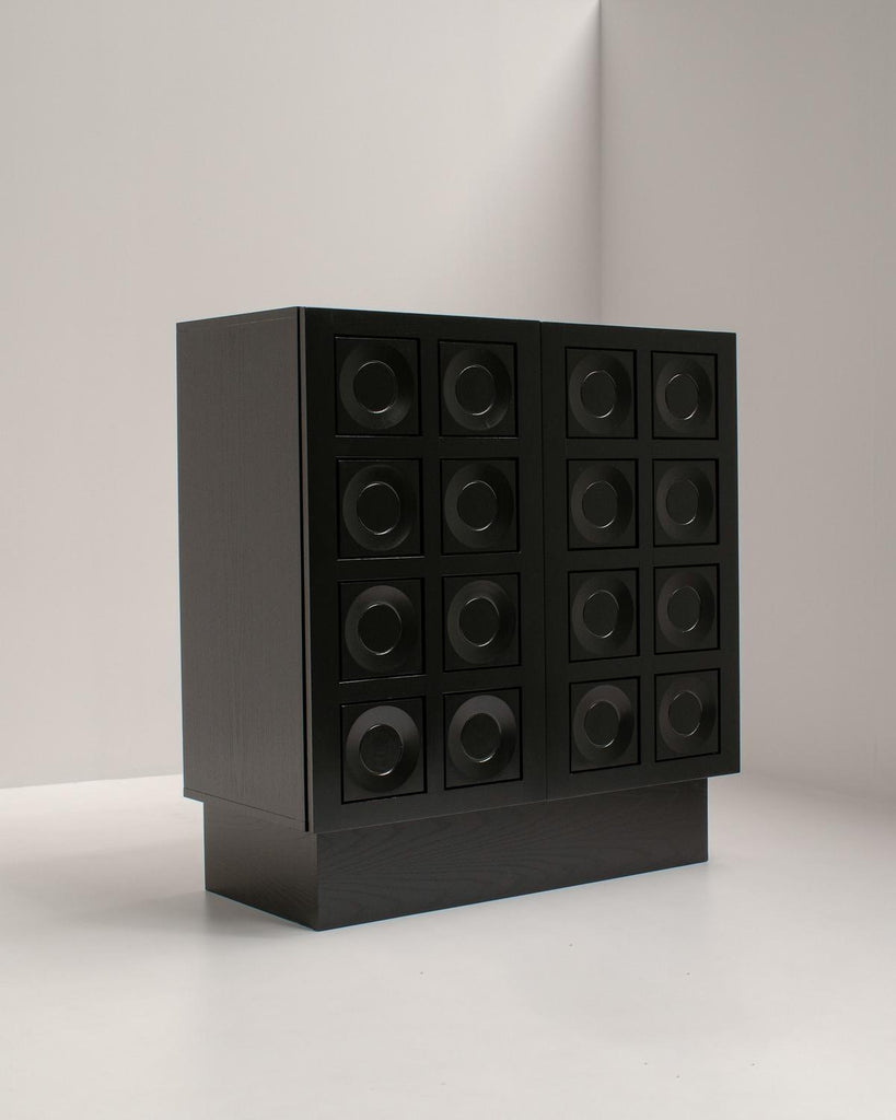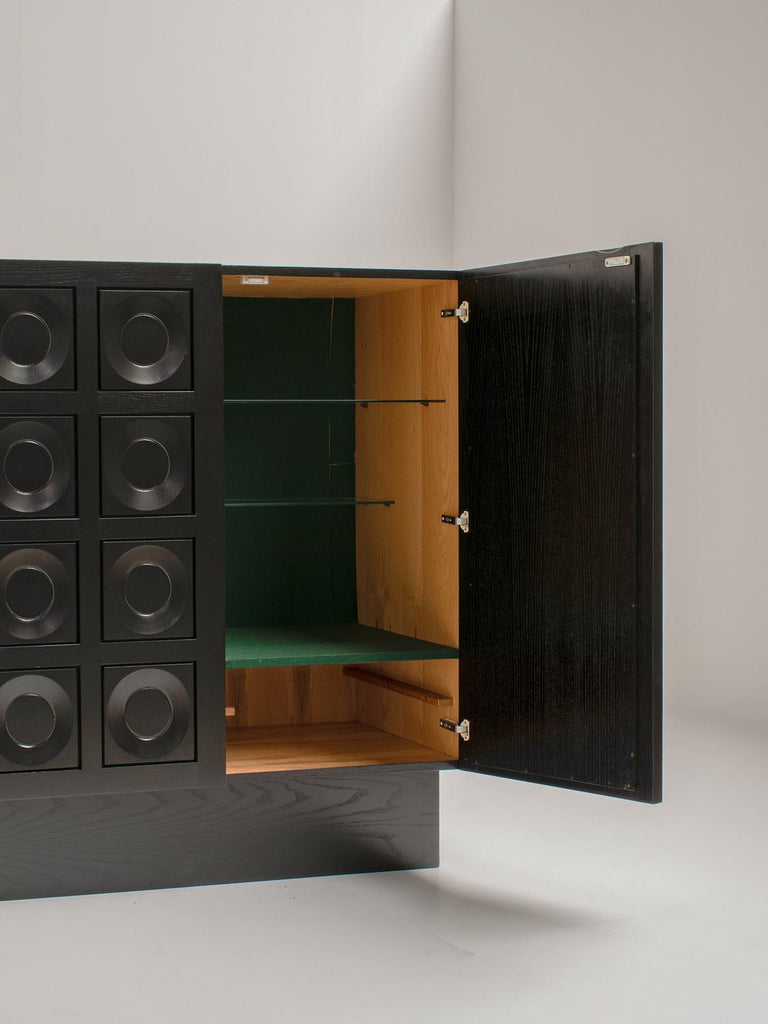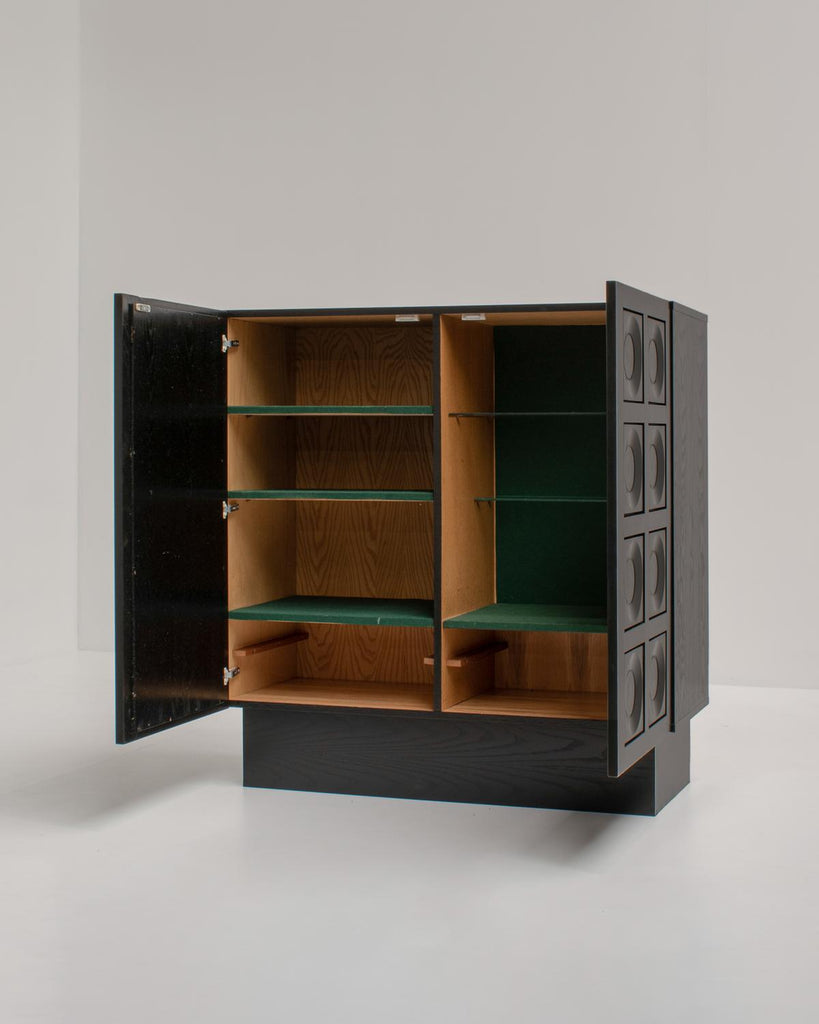 1970년대 벨기에 오크로 아름답게 제작된 에보니 처리된 브루탈리스트 바 캐비닛. 수납장에는 두 개의 그래픽 패턴 도어가 있으며 충분한 수납 공간을 제공하여 매우 기능적이고 장식적입니다. 종종 벨기에 제조업체 De Coene에 기인합니다. 이 멋진 캐비닛은 어떤 현대적인 인테리어에도 완벽하게 어울립니다. 우수한 빈티지 상태를 유지하고 있습니다.