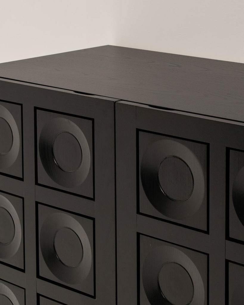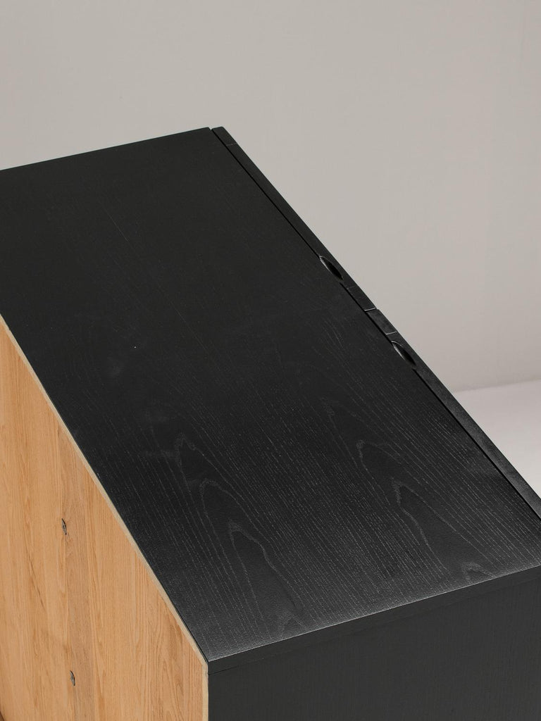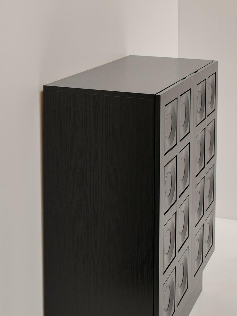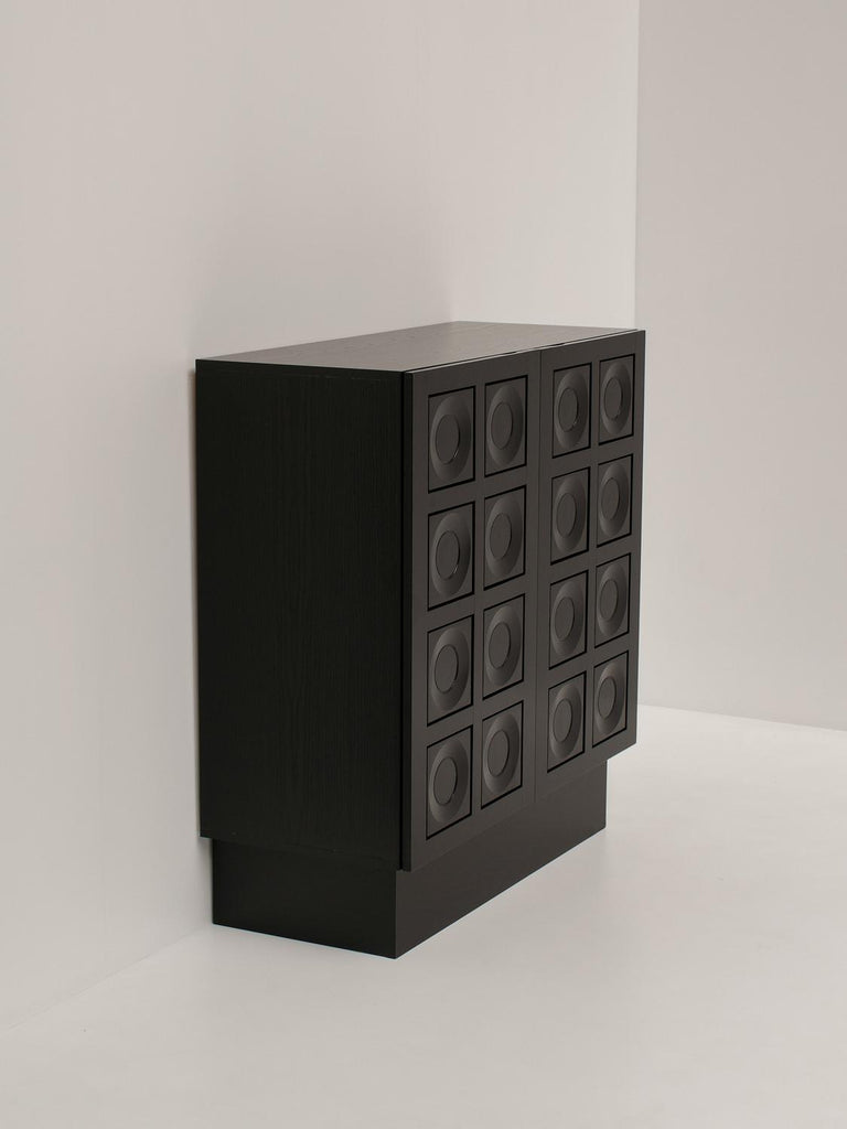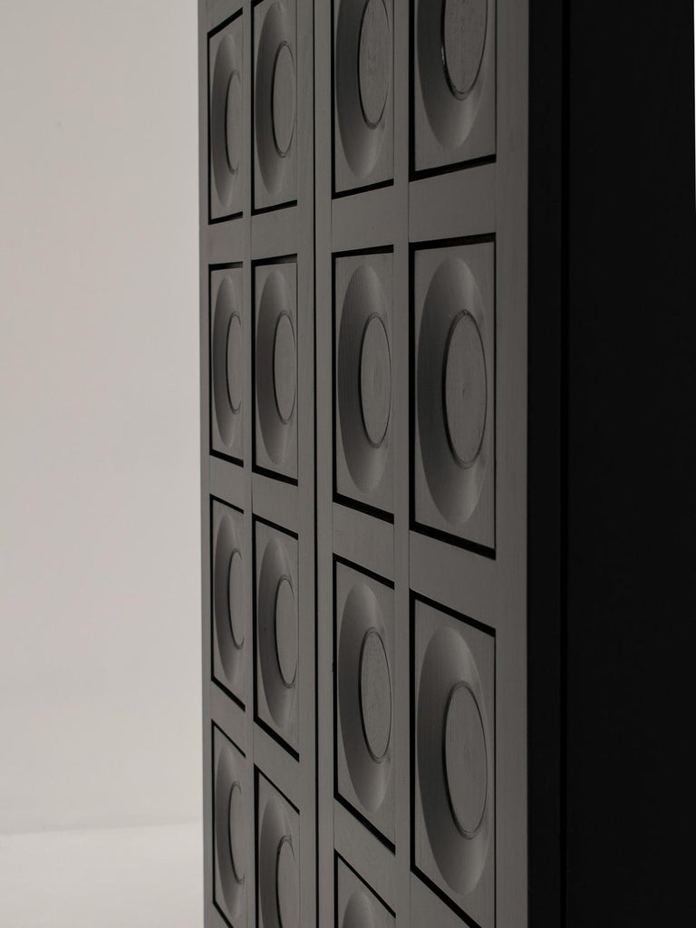 1970년대 벨기에 오크로 아름답게 제작된 에보니 처리된 브루탈리스트 바 캐비닛. 수납장에는 두 개의 그래픽 패턴 도어가 있으며 충분한 수납 공간을 제공하여 매우 기능적이고 장식적입니다. 종종 벨기에 제조업체 De Coene에 기인합니다. 이 멋진 캐비닛은 어떤 현대적인 인테리어에도 완벽하게 어울립니다. 우수한 빈티지 상태를 유지하고 있습니다.