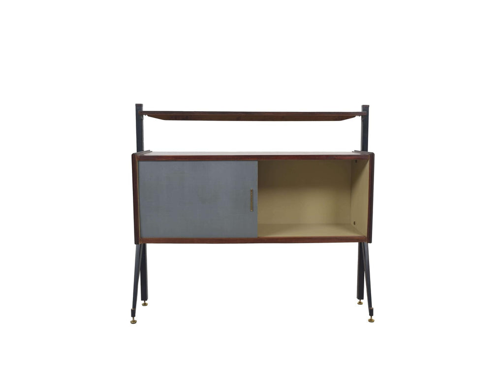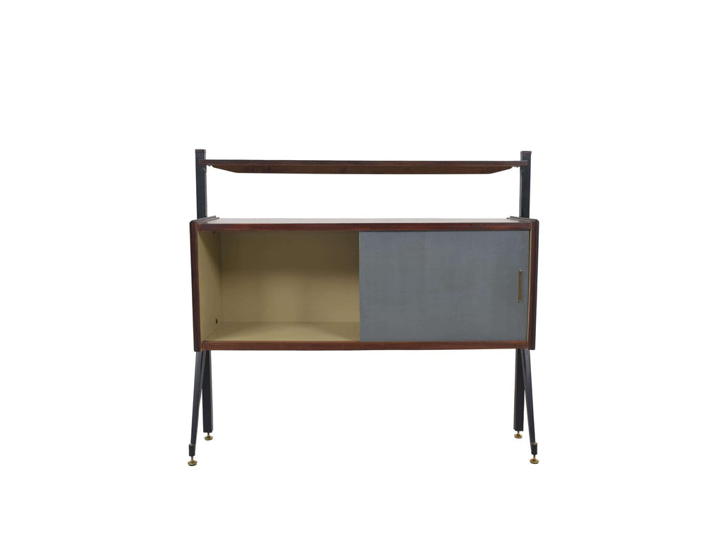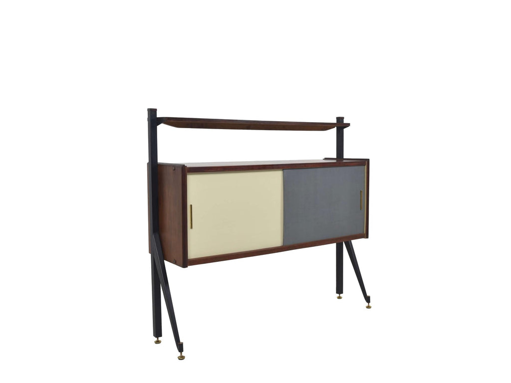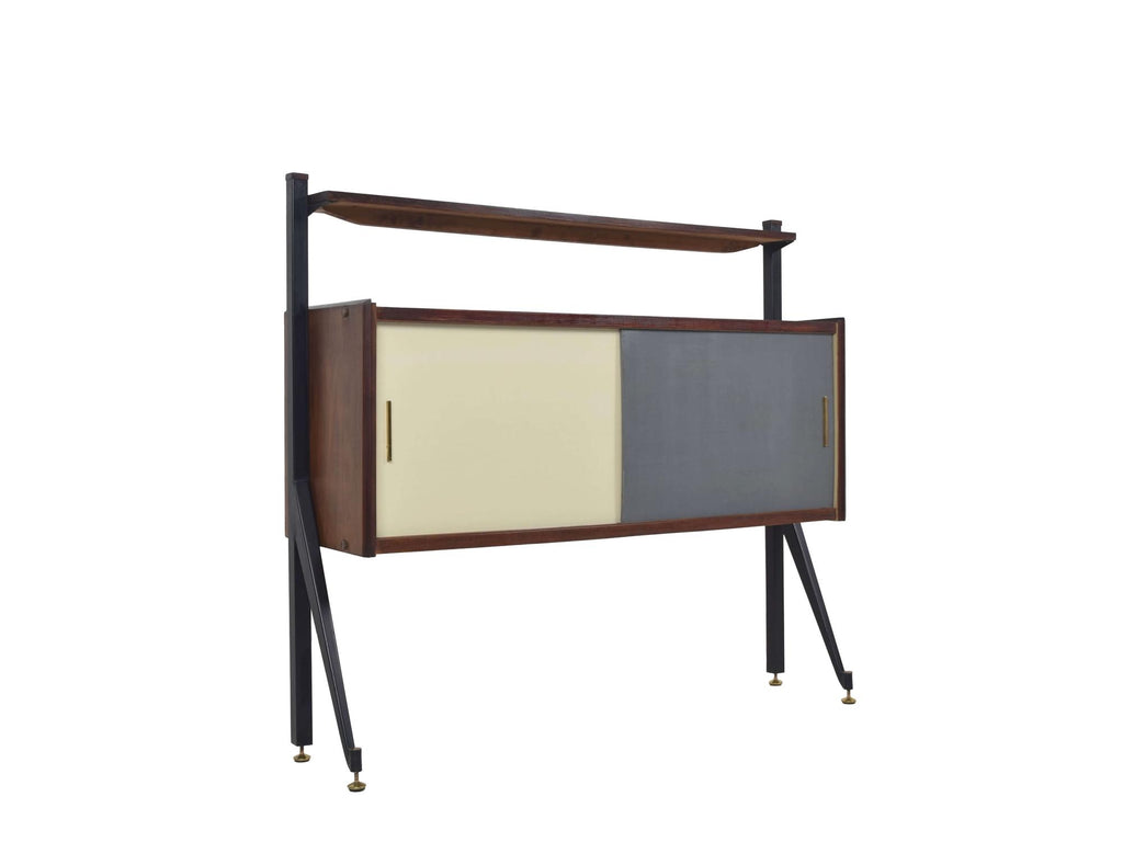 1970년대 이탈리아의 컬러 미닫이문이 있는 멋진 이탈리아 모던 캐비닛 또는 책장. 프레임은 캐비닛을 조정하는 데 사용할 수 있는 황동 다리가 있는 금속입니다. 나무 중간에는 회백색과 회색/파란색의 합판 목재로 된 두 개의 미닫이문이 있습니다. 손잡이는 황동으로 되어 있습니다. 그 위에는 장식용 선반이 있습니다.