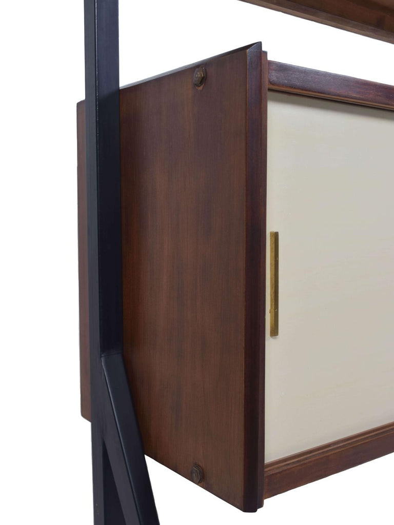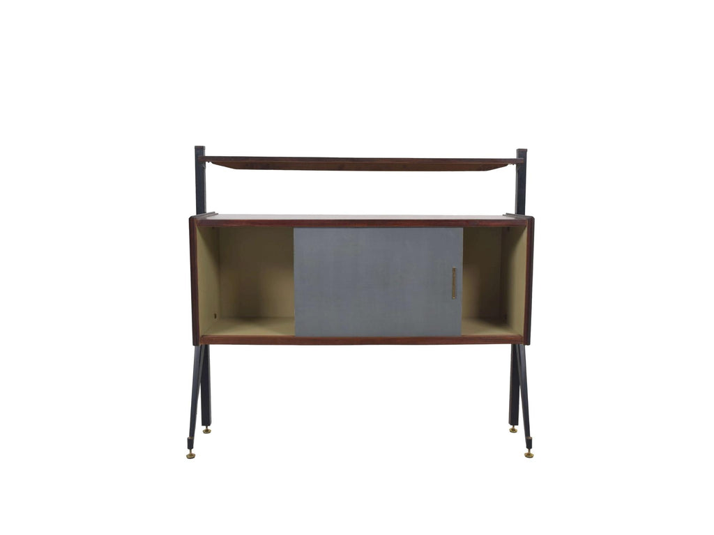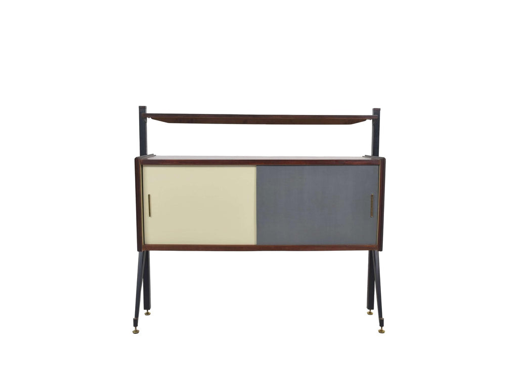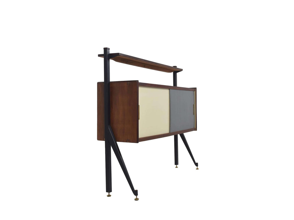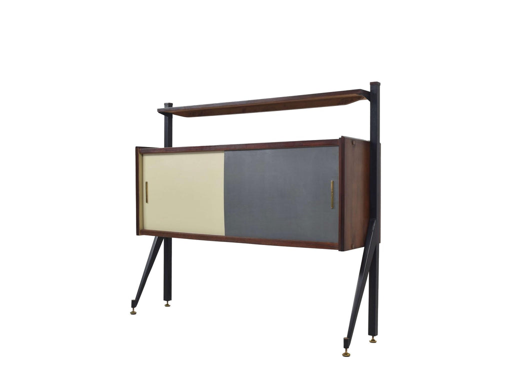 1970년대 이탈리아의 컬러 미닫이문이 있는 멋진 이탈리아 모던 캐비닛 또는 책장. 프레임은 캐비닛을 조정하는 데 사용할 수 있는 황동 다리가 있는 금속입니다. 나무 중간에는 회백색과 회색/파란색의 합판 목재로 된 두 개의 미닫이문이 있습니다. 손잡이는 황동으로 되어 있습니다. 그 위에는 장식용 선반이 있습니다.