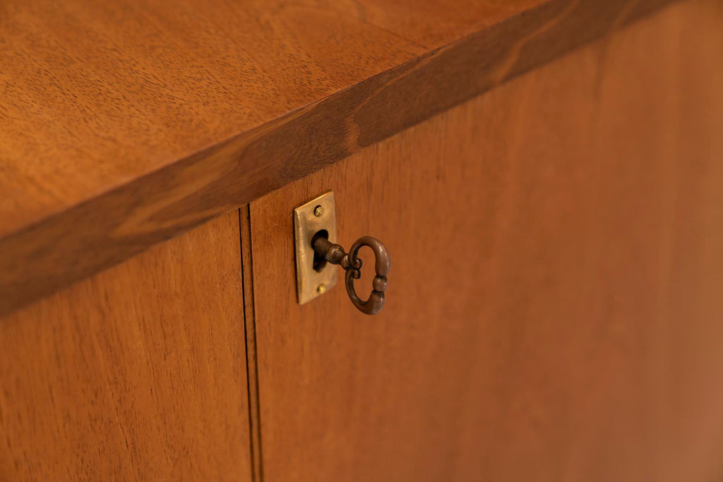 이 이탈리아 1950년대 찬장은 매우 정밀하게 제조되었으며 매우 세련된 외관을 가지고 있습니다. 도어와 상단에 아름다운 베니어판을 선택하여 목재의 불꽃이 아름답게 반사됩니다. 도어 프레임은 베이스와 마찬가지로 호두나무 베니어판입니다. 이러한 유형의 목재가 결합되는 방식은 장인 정신일 뿐만 아니라 예술 형식이기도 합니다. 아니요 황동 실린더를 사용했기 때문에 캐비닛의 다리 부분이 광학적으로 가볍습니다. 그것은 경쾌함과 기교의 느낌을 만듭니다. 황동 디테일은 도어에 있는 두 개의 잠금 장치와 도어에 매우 독창적으로 숨겨져 있는 아름다운 경첩에도 반영되어 있습니다. 이 문은 쉽게 열리고 내부가 보입니다. 이것은 완전히 축성되고 옻칠됩니다. 찬장은 완전히 복원되어 최상의 상태입니다.