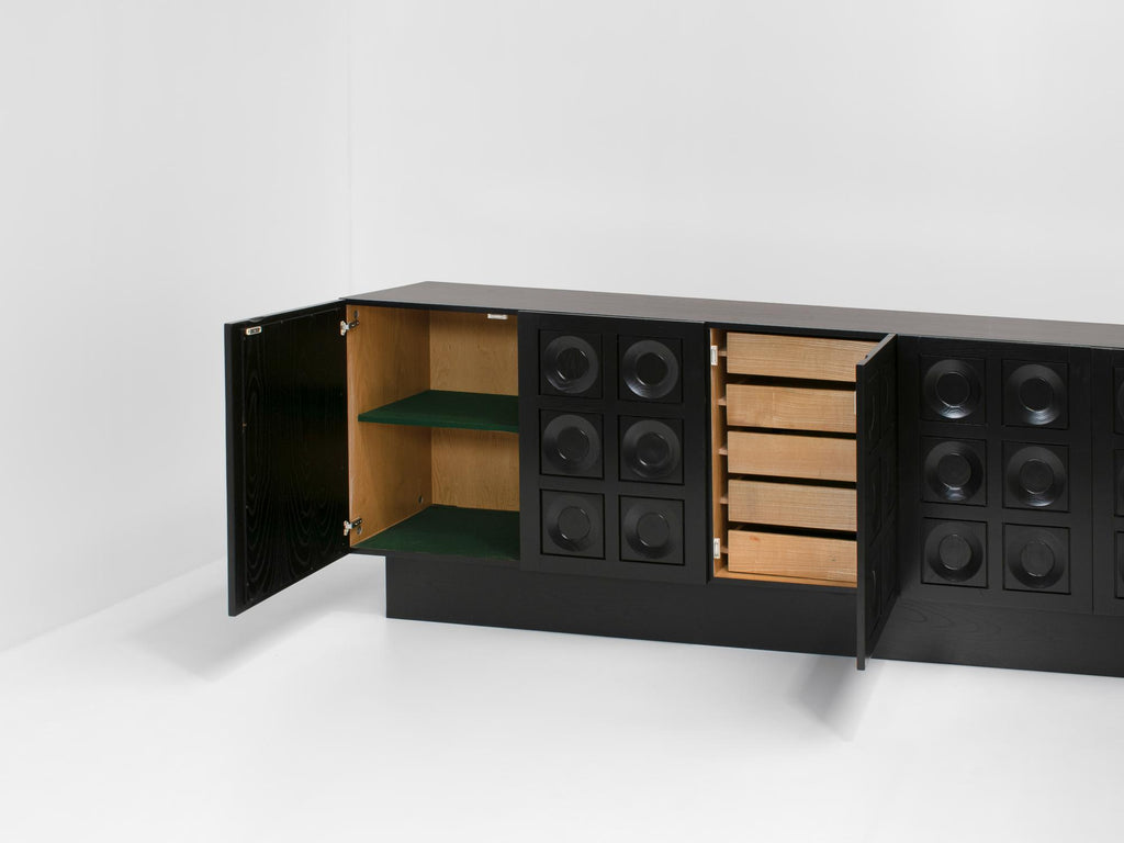 1970년대 벨기에 블랙 래커 오크 소재의 대형 브루탈리스트 크레덴자(Brutalist credenza). 사이드보드에는 5개의 그래픽 패턴 문이 있습니다. 내부에는 서랍 한 세트가 있고 다른 입구에는 선반이 있습니다. 그것은 매우 기능적이며 장식적으로 만드는 충분한 저장 공간을 제공합니다. 이 사이드보드는 종종 벨기에 제조업체 De Coene에 기인합니다. 찬장은 전문 장인에 의해 복원되었습니다.