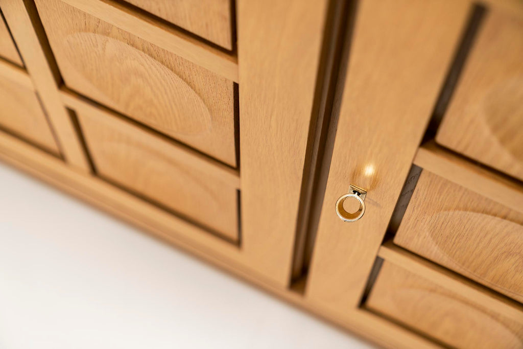 아름다운 블론드 오크 소재의 이 1970년대 잔인한 찬장은 완전히 독창적이며 상태가 양호합니다. 벨기에 디자이너 Gerhard Bartels에 의해 70년대에 디자인되었으며 De Coene 형제의 디자인과 유사성을 보여줍니다. 수납장 도어의 패턴이 만족스러운 느낌을 줍니다. 각 문에는 균일한 간격으로 가공된 8개의 사각형이 있습니다. 내부 여백 가장자리는 외부 가장자리나 프레임보다 훨씬 작습니다. 이러한 비율은 처음에는 눈에 띄지 않을 수 있지만 일종의 착시 현상 인 역학을 추가하는 데 매우 중요합니다. 원은 나무를 통해 눌러지는 것처럼 보이는 방식으로 처리된 사각형 안에 나타납니다. 이것은 차례로 그림자 놀이를 일으키는 안도감을 만듭니다. 그림자의 양은 캐비닛에 비치는 빛을 조정하여 완전히 조정할 수 있습니다. 찬장 문 뒤에는 많은 양의 수납 공간이 있습니다. 왼쪽 케이스에는 한 쌍의 베니어 선반이 있으며 중간 부분에도 동일하게 적용됩니다. 당연히 후자는 두 배의 저장 공간을 제공합니다. 오른쪽 캐비닛은 다르게 배열되어 있으며 아래에 두 개의 서랍과 더 작은 수납 공간이 있습니다. 이 텍스트의 시작 부분에서 지적했듯이 이 항목의 상태에 대해 언급할 사항이 거의 없습니다. 녹청은 환상적이며 찬장은 미학적으로 완벽합니다.