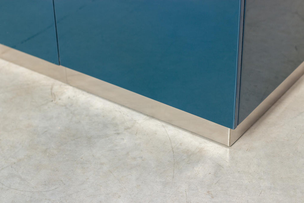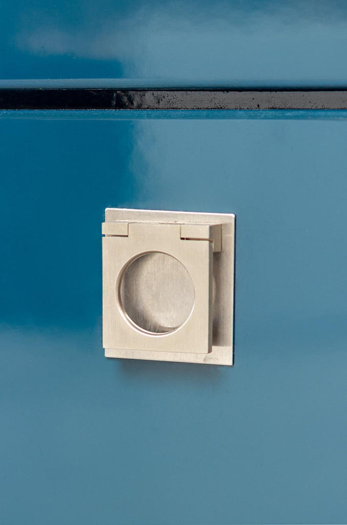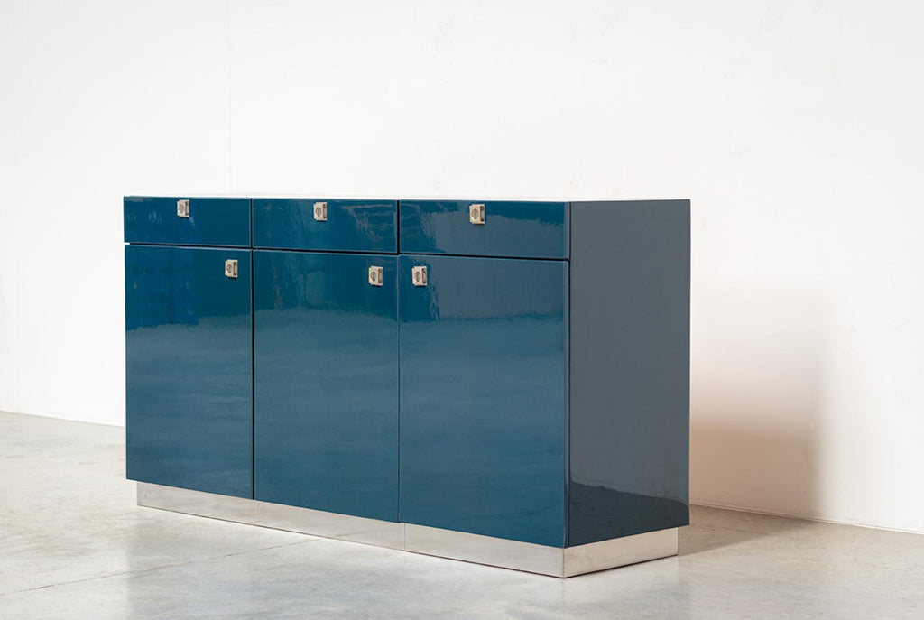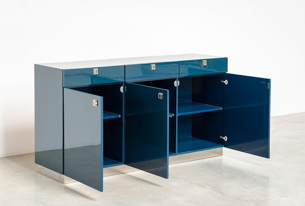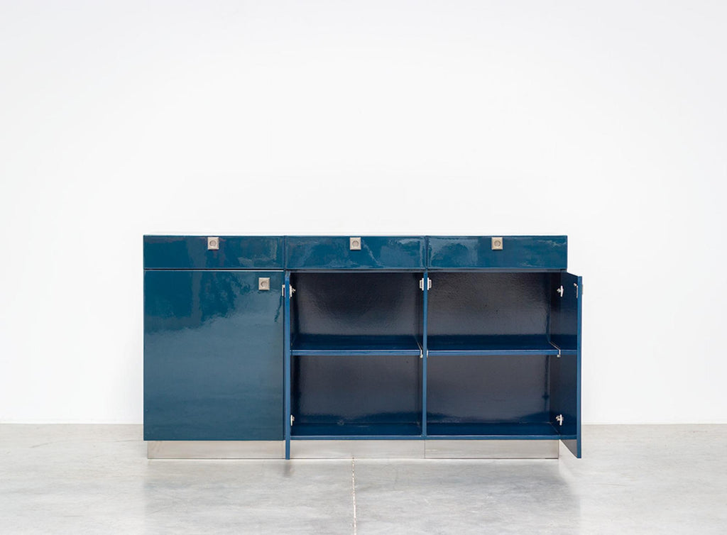 찬장에는 서랍 3개와 내부에 선반이 있는 문이 3개 있습니다. 브러시 처리된 스테인리스 스틸 사각 손잡이(손잡이)가 있는 서랍과 문. 사이드보드는 스테인리스 스틸 받침대에 올려져 있습니다. 전체 짙은 파란색 외관과 고광택 마감 처리로 인해 이 사이드보드는 극적인 동시에 기념비적인 강렬한 외관을 얻습니다.