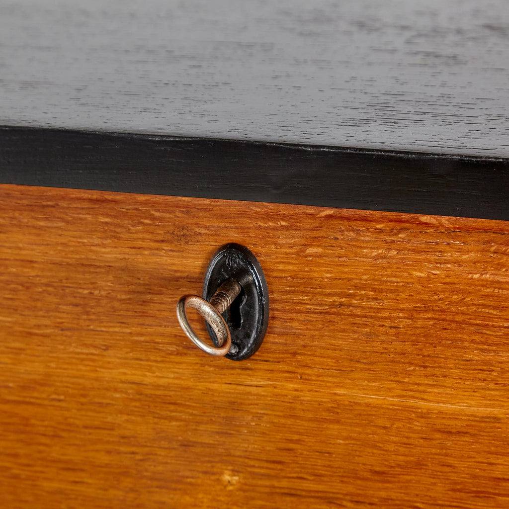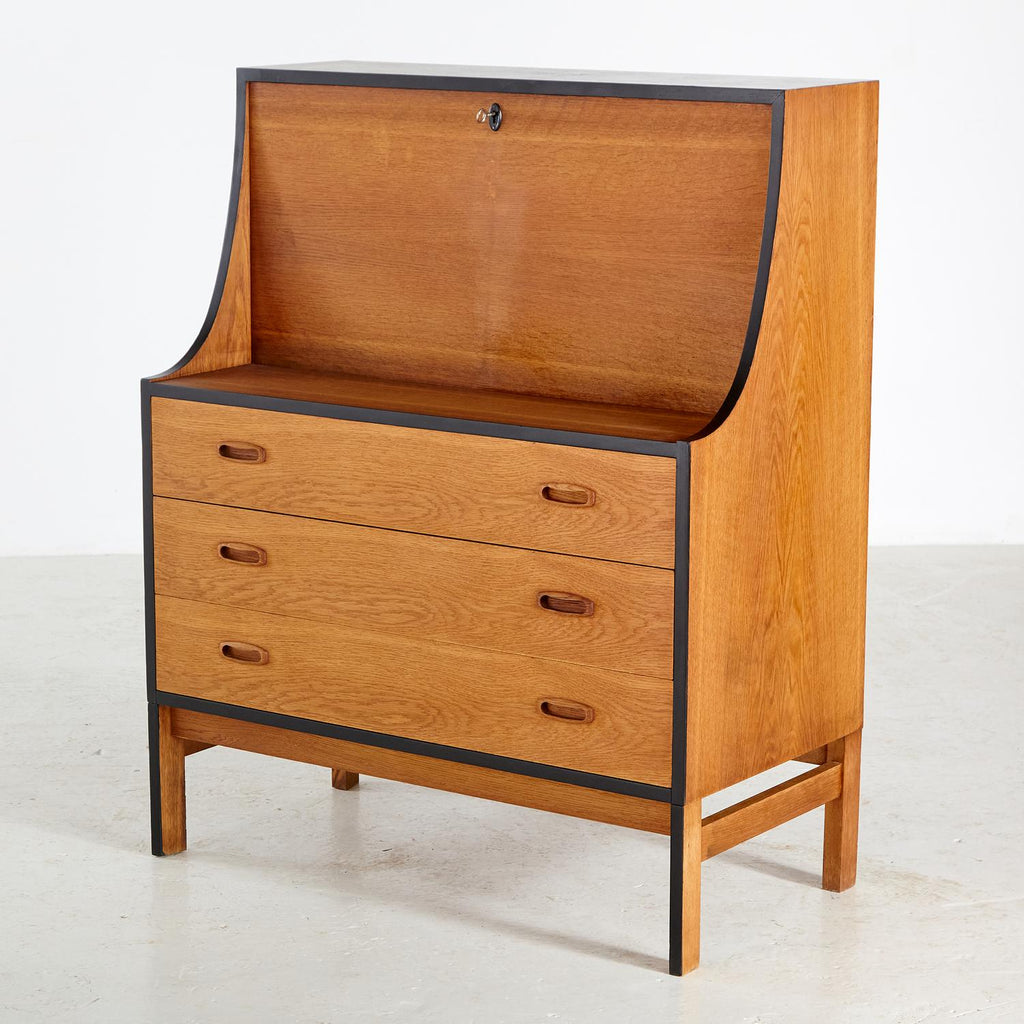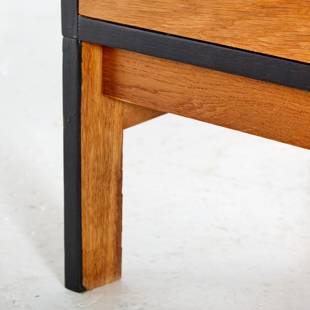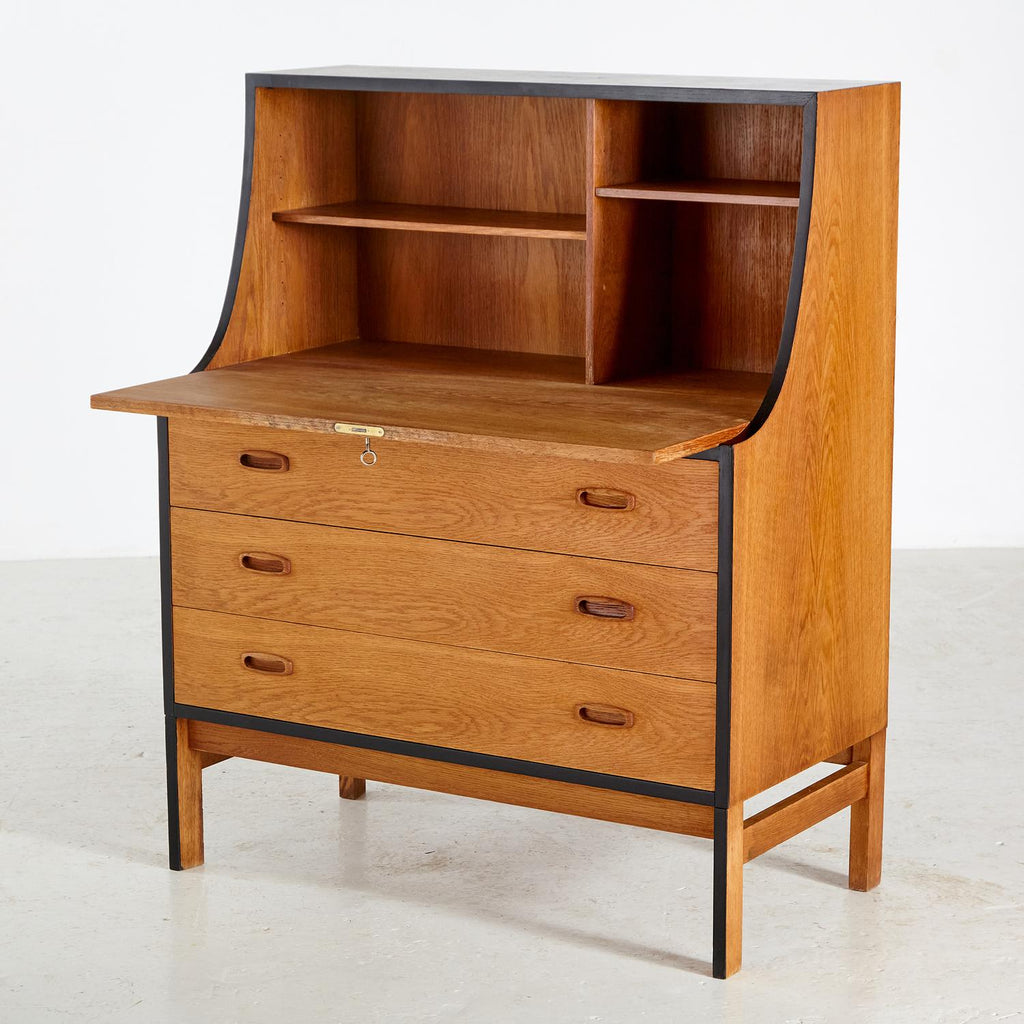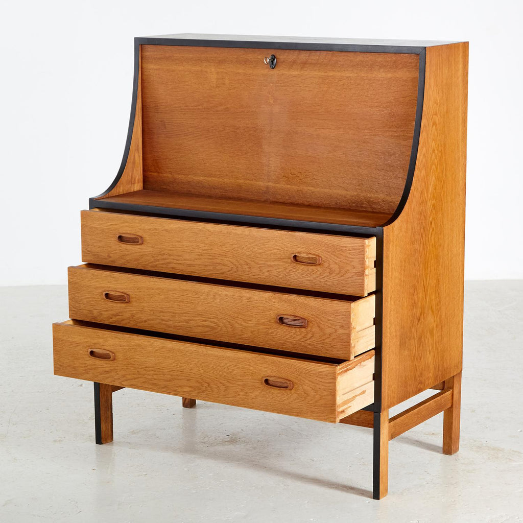 새로 복원된 상태의 1960년대 비트레 오크 사무용 책상, 검은색 세부 사항이 칠해져 있습니다. 서랍 3개, 잠글 수 있는 도어 1개, 내부에 선반 2개가 있습니다.