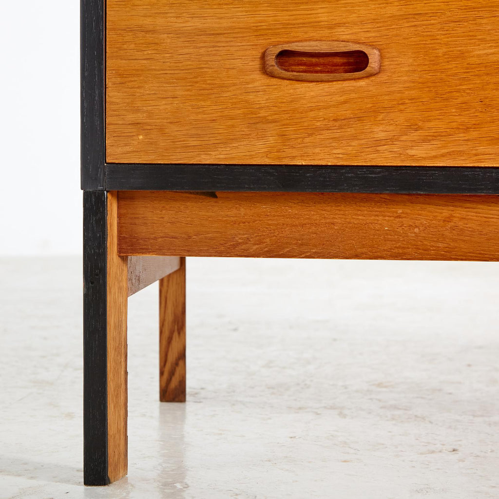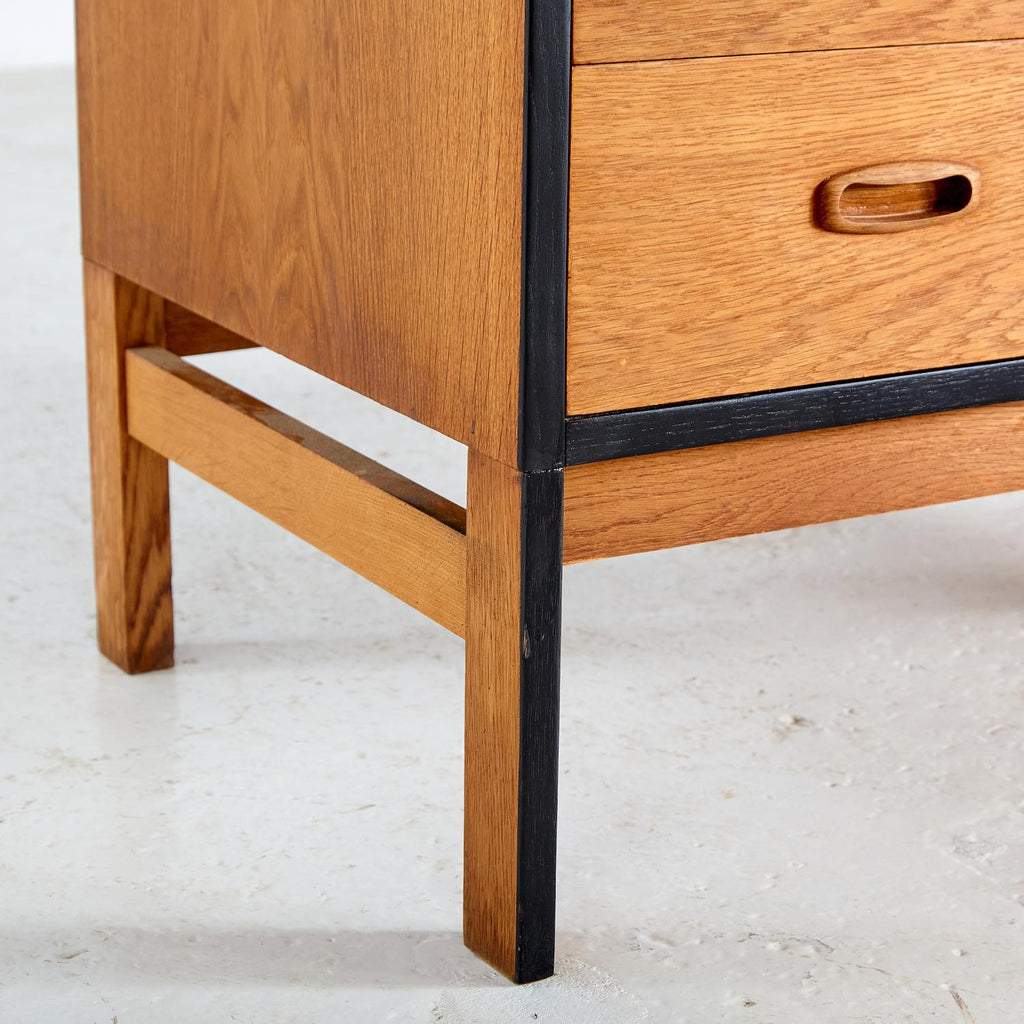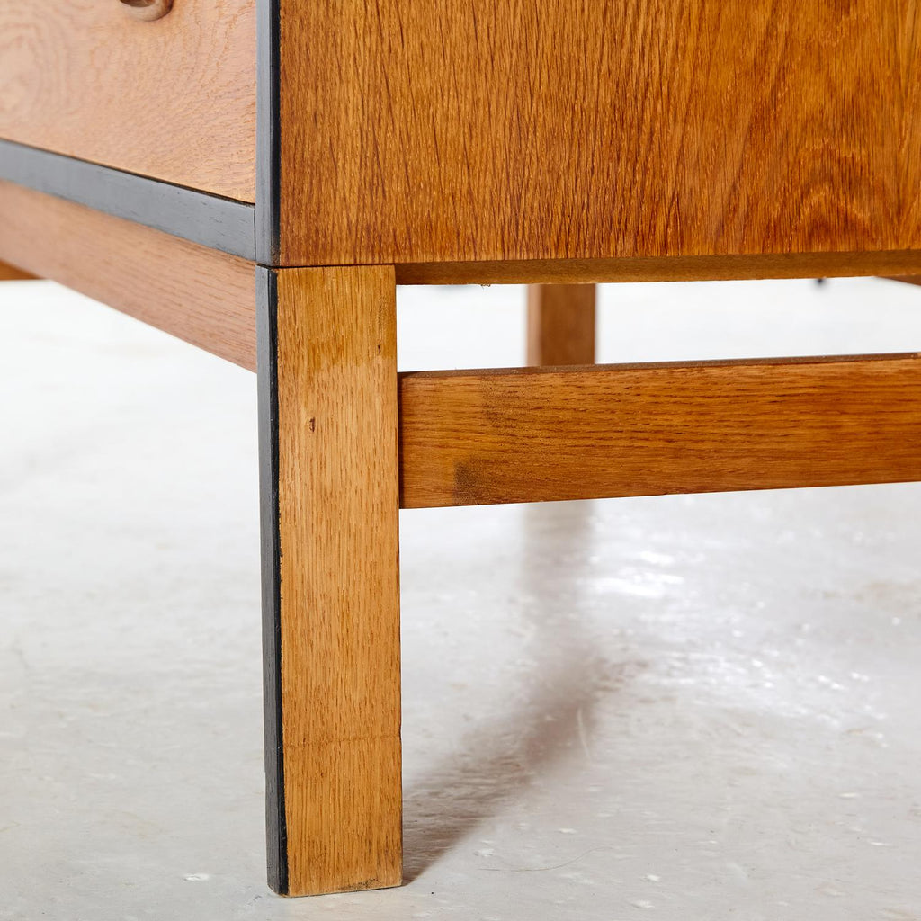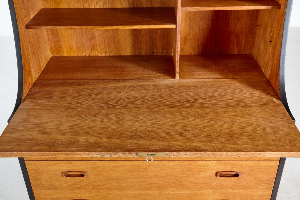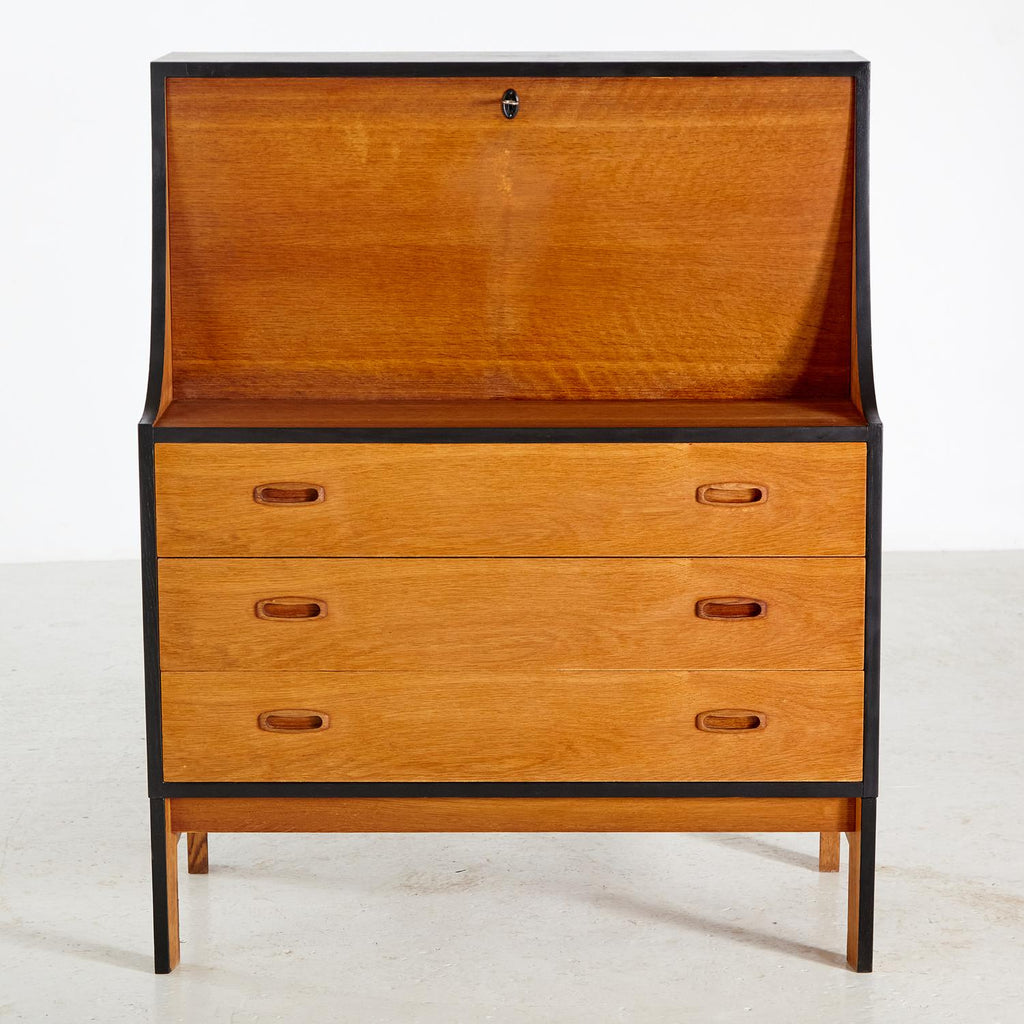 새로 복원된 상태의 1960년대 비트레 오크 사무용 책상, 검은색 세부 사항이 칠해져 있습니다. 서랍 3개, 잠글 수 있는 도어 1개, 내부에 선반 2개가 있습니다.