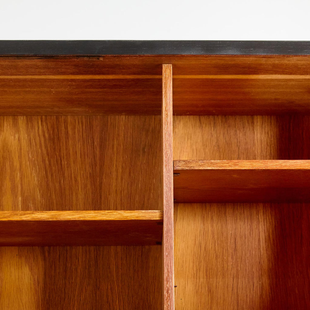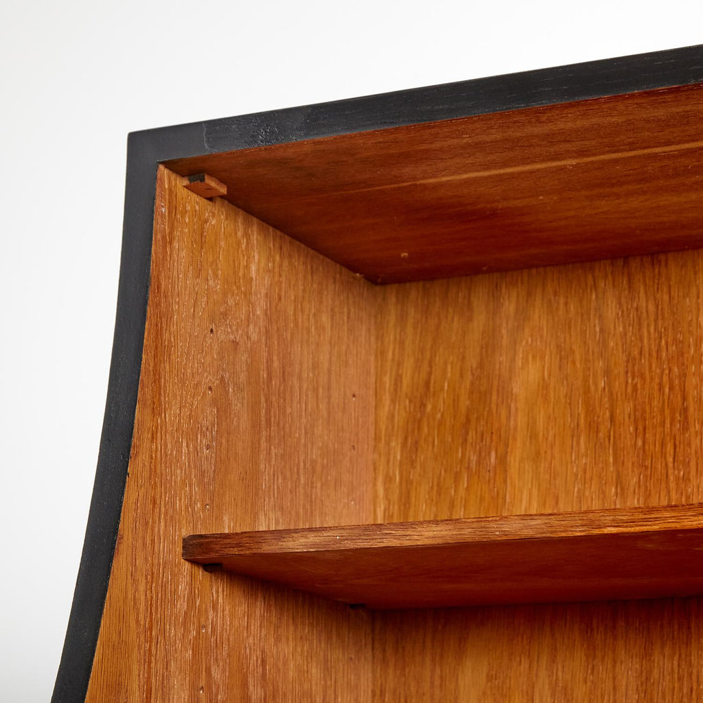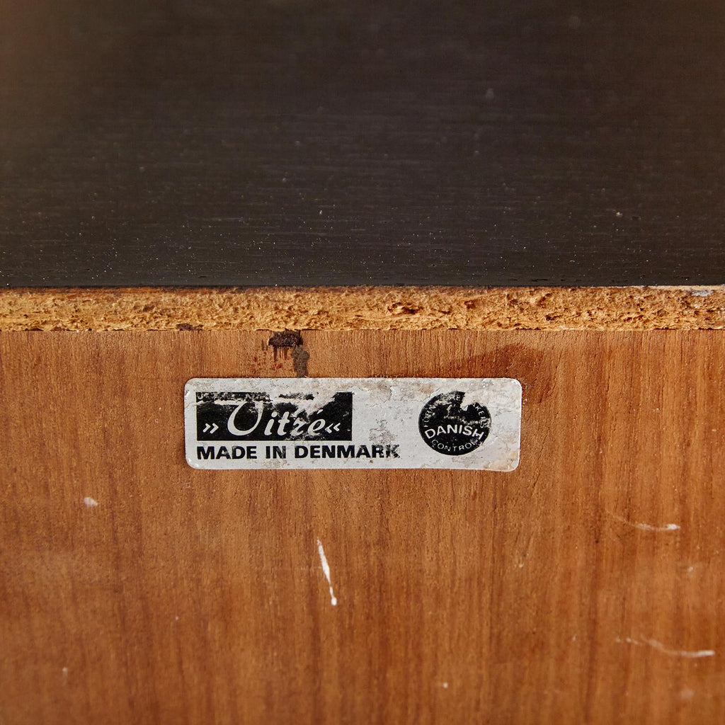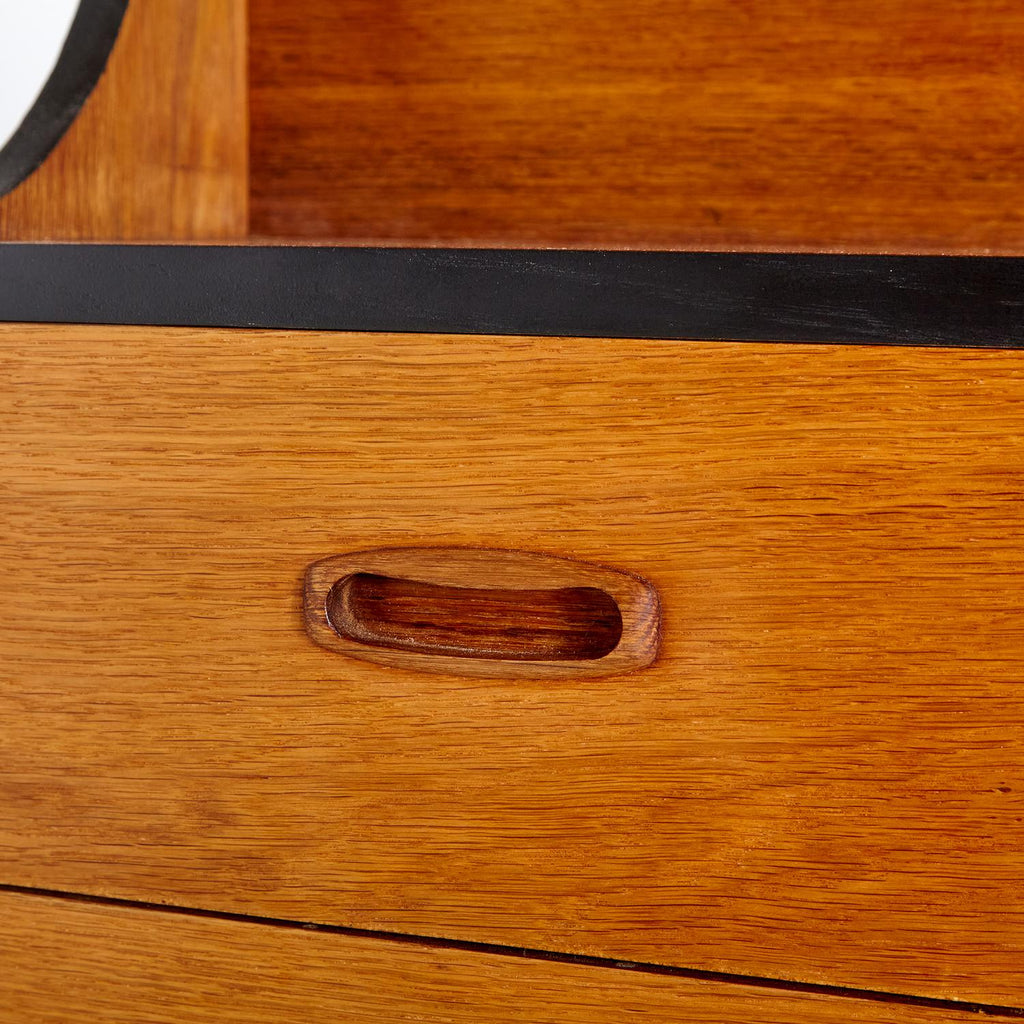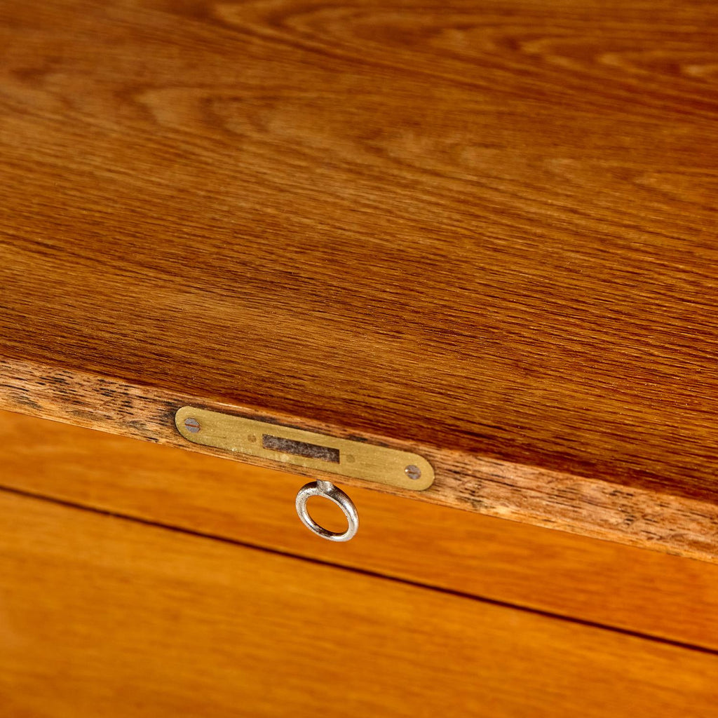 새로 복원된 상태의 1960년대 비트레 오크 사무용 책상, 검은색 세부 사항이 칠해져 있습니다. 서랍 3개, 잠글 수 있는 도어 1개, 내부에 선반 2개가 있습니다.