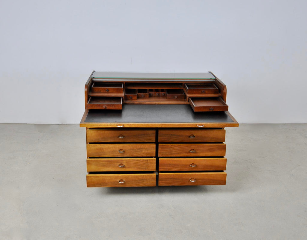 나무 비서. 가죽 상감 필기면을 당기면 롤 탑이 열리고 그 아래에는 작은 서랍이 있습니다. 이 비서는 앞면에 10개의 서랍이 있고 롤탑 뒤에 여러 개의 서랍이 있으며 뒷면에는 두 개의 유리 선반이 있습니다. 다리는 단단한 나무로 만들고 알루미늄 스트립으로 연결됩니다.