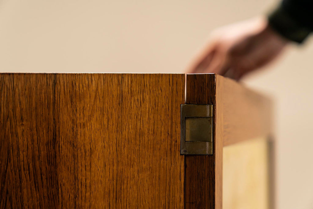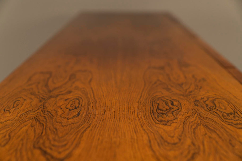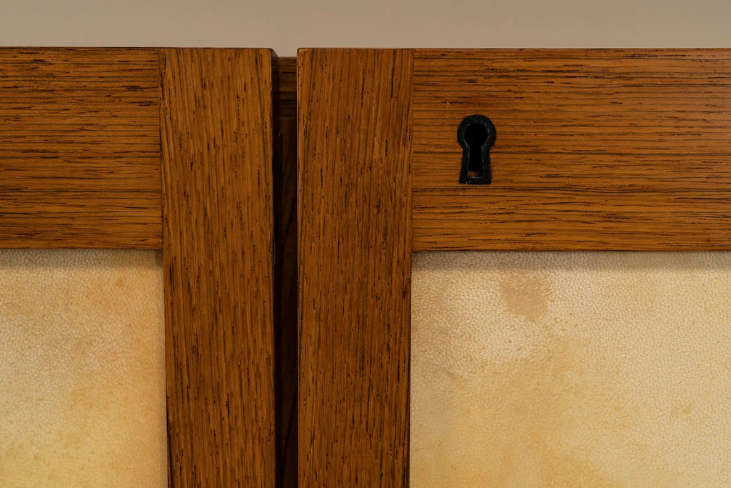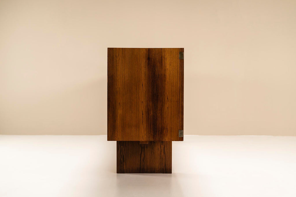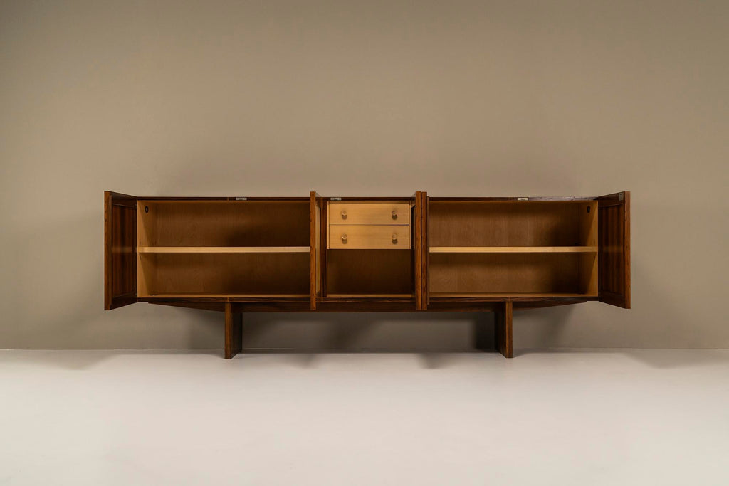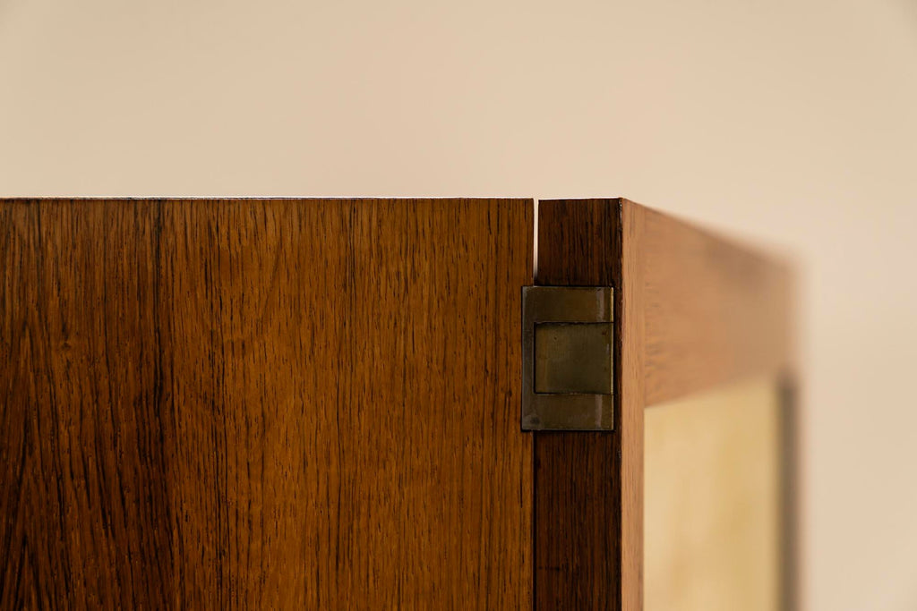 이 특별한 이탈리아 1950년대 찬장은 전례 없는 품격과 아름다움을 자랑합니다. 아름다운 로즈우드 베니어는 매우 세련된 방식으로 적용되었으며 목재의 불꽃은 서로 아름답게 흐릅니다. 문은 염소 가죽으로 장식되어 있으며 흥미로운 파티나를 보여줍니다. 중간 문에서 따뜻한 색상이 다른 부분으로 퍼져 이 찬장에 독특한 특성을 부여합니다. 도어가 열리고 닫히는 금속 경첩 시스템도 특별히 언급할 가치가 있습니다. 이들은 독창적으로 숨겨져 있으며 완전히 접히면 도어가 캐비닛에서 느슨해지는 것처럼 보입니다. 떠 다니는 것처럼. 문을 열면 내부 수납 공간이 나오는데 역시 베니어판으로 마감되어 있습니다. 왼쪽과 오른쪽 구획은 큰 저장 용량을 제공하고 중간 섹션에는 아래에 저장 공간이 있는 두 개의 서랍이 있습니다. 마지막으로 섀시를 봅니다. 다리는 캐비닛 길이의 절반 정도이며 Charlotte Perriand의 디자인과 유사한 차분한 비율을 나타냅니다. 이들은 사이드보드의 전체 길이에 걸쳐 있는 지지대에 의해 추가로 강화됩니다. 특히 독특한 외관으로 이 사이드보드는 인테리어에서 즉시 관심을 끌 것입니다. 복원되어 최상의 상태입니다.
