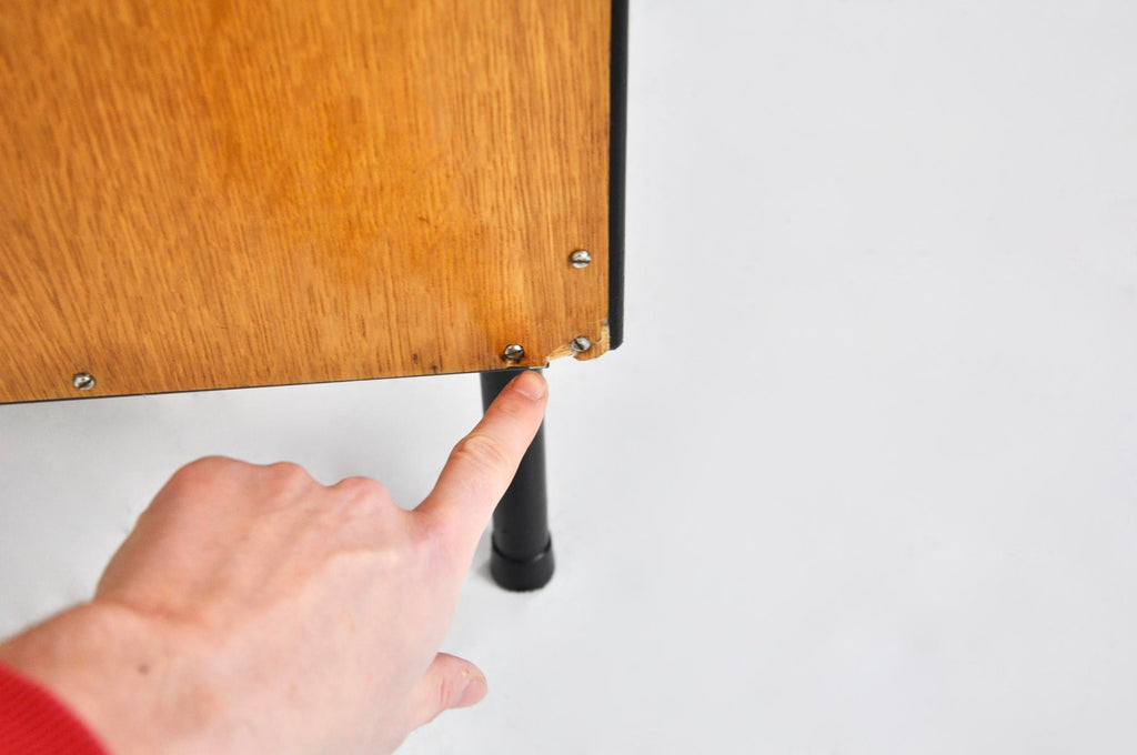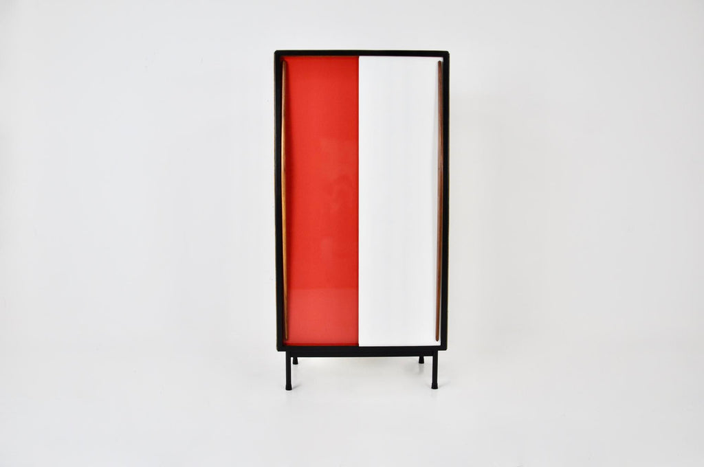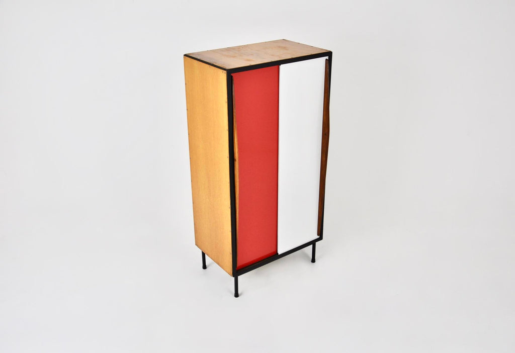 금속과 나무로 만든 빨간색과 흰색 캐비닛. 오리지널 나무 재질로 문부분은 다시 칠했습니다. 시간과 나이로 인한 마모.