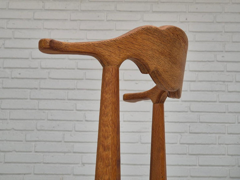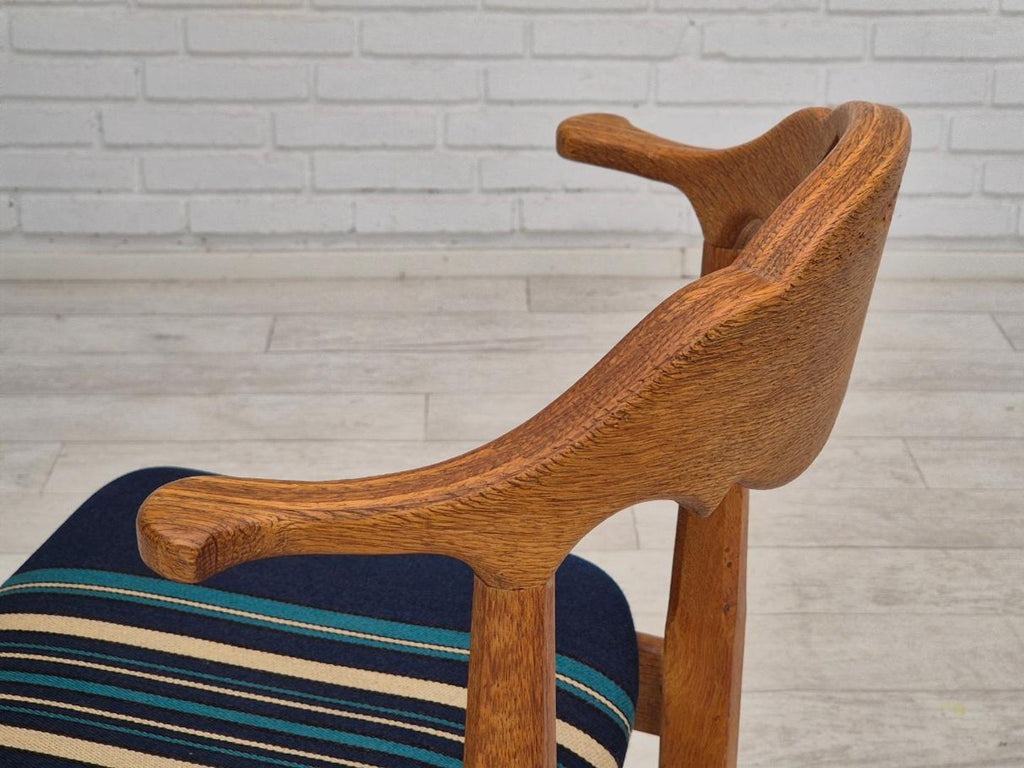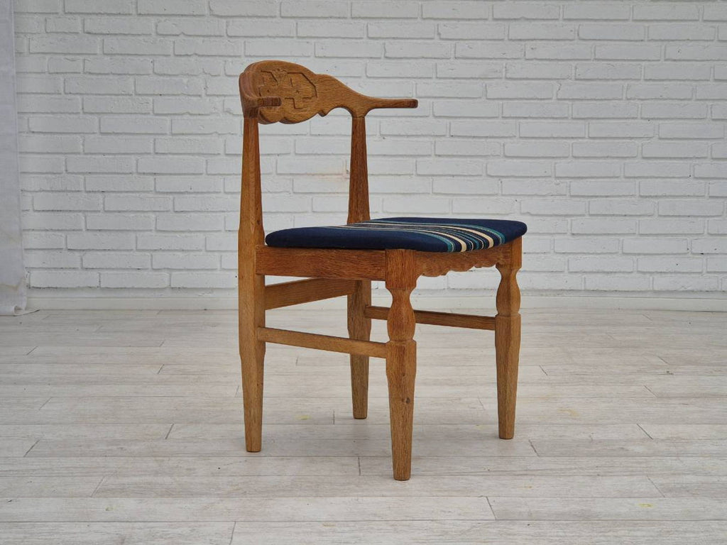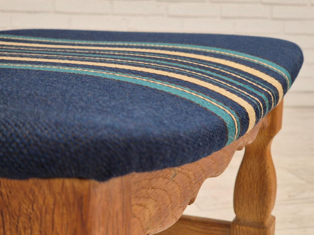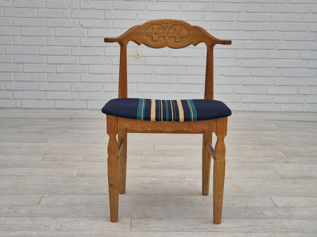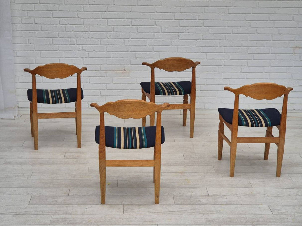 1970s, Danish design by Henning Kjærnulf for EG Kvalitetsmøbel. Set of 4 pcs dining chairs in original very good condition: no smells and no stains, stable construction. Solid oak wood, furniture wool fabric. Manufactured by Danish furniture maker EG Kvalitetsmøbel in about 1970.