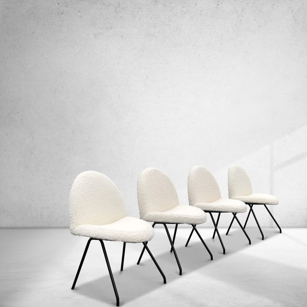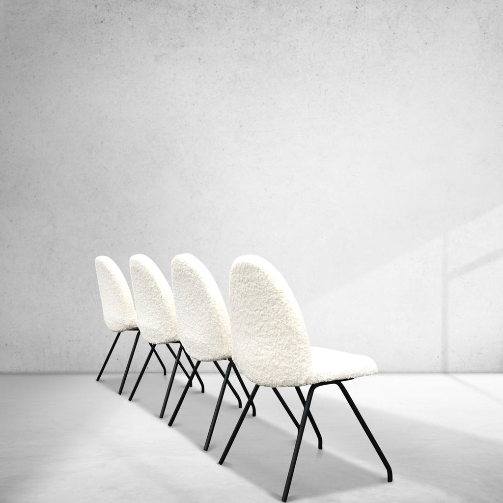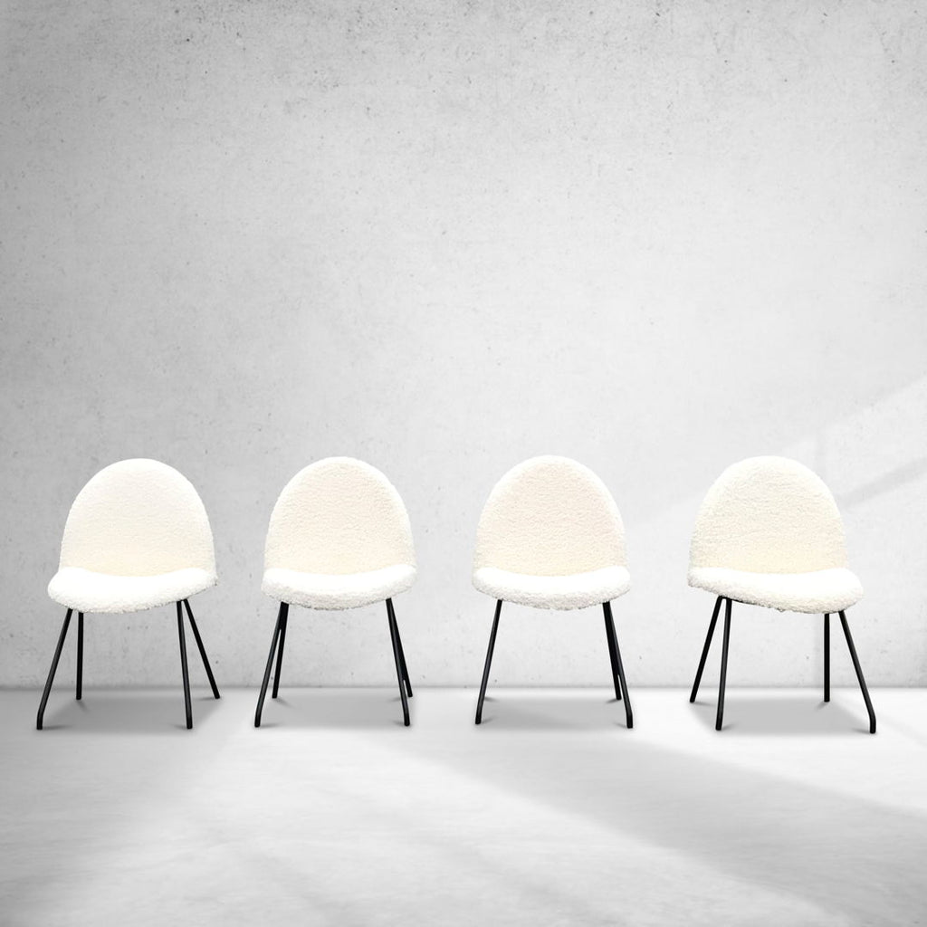 The specific chairs in question feature a black frame and white bouclé fabric.