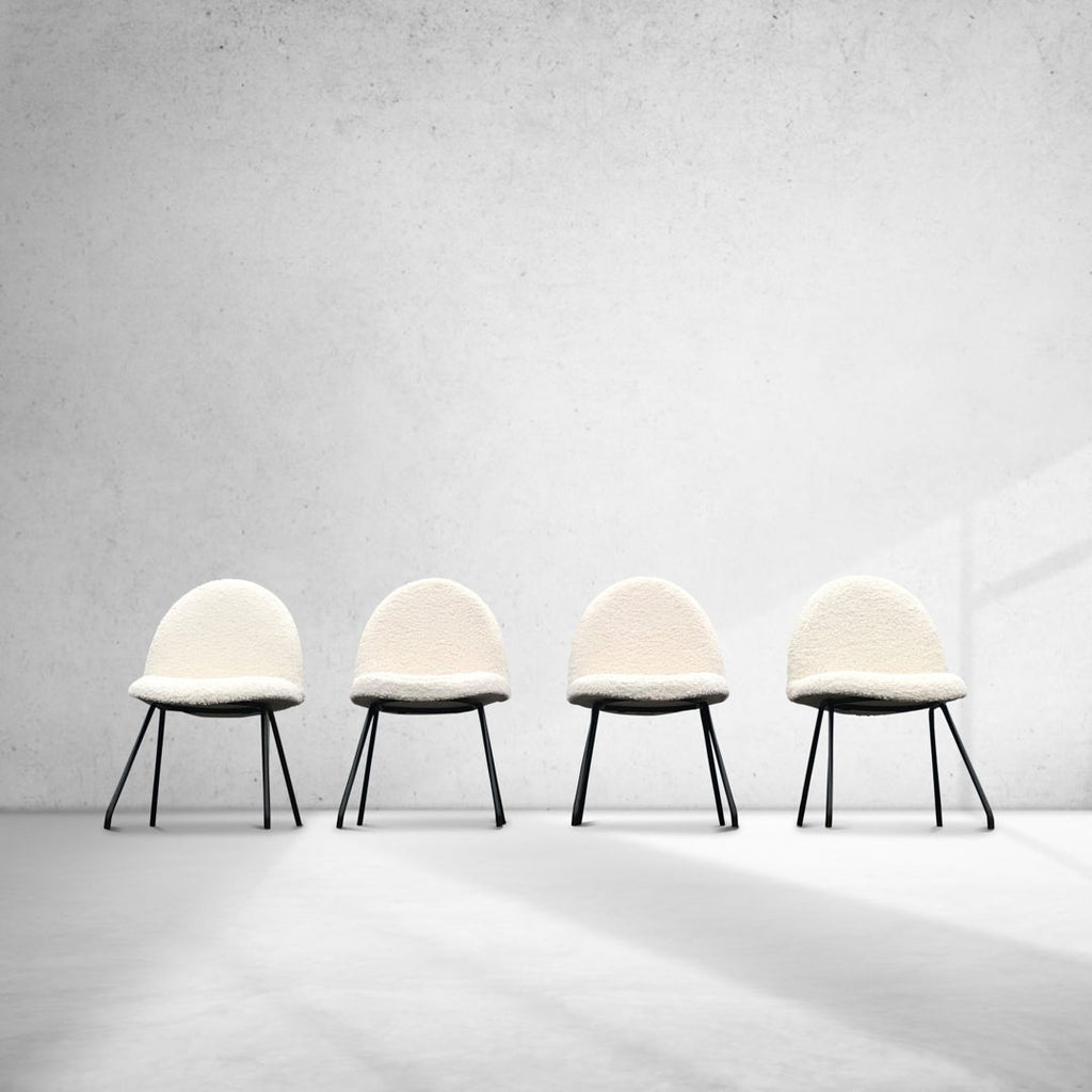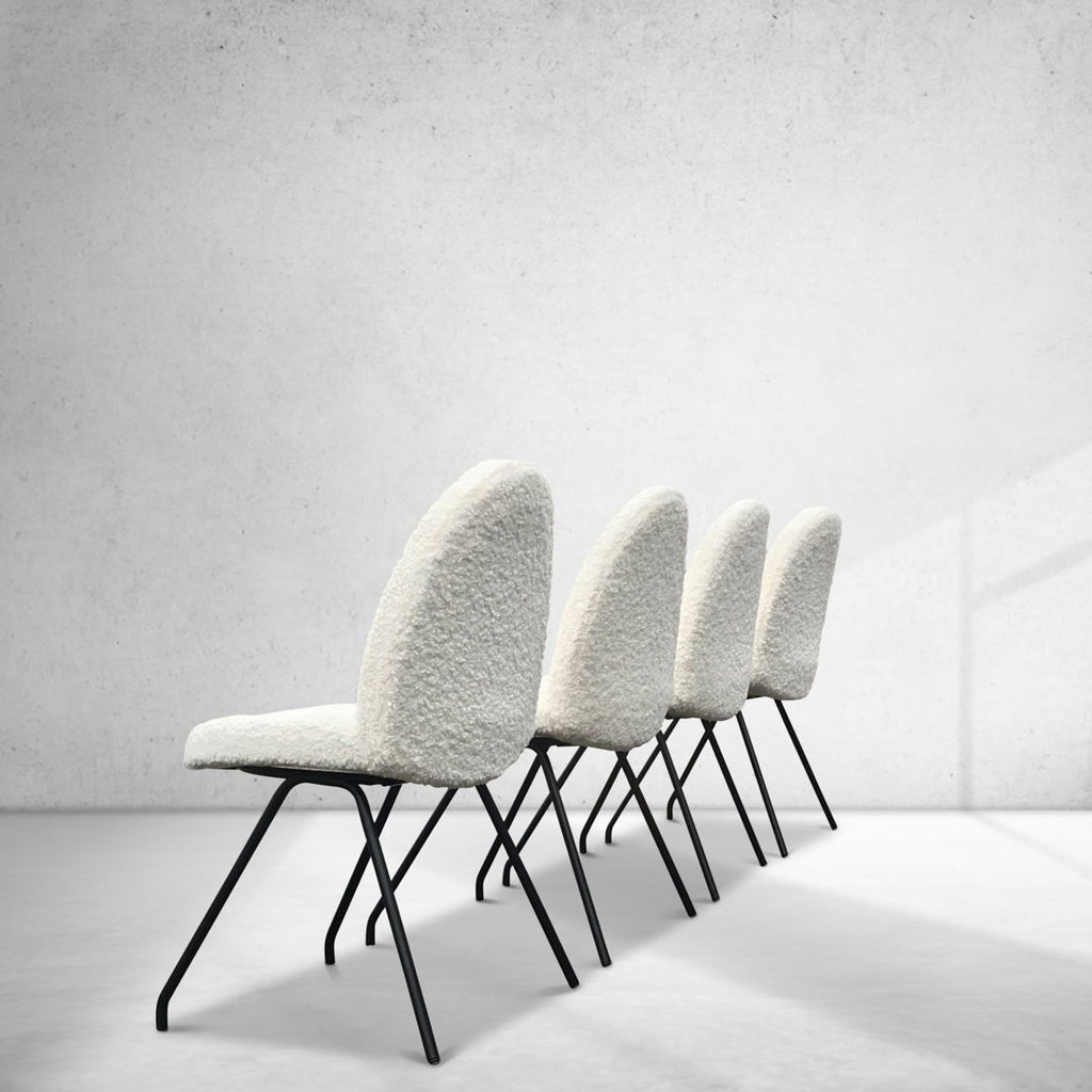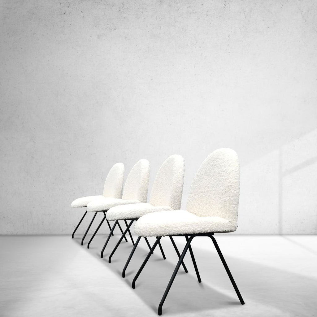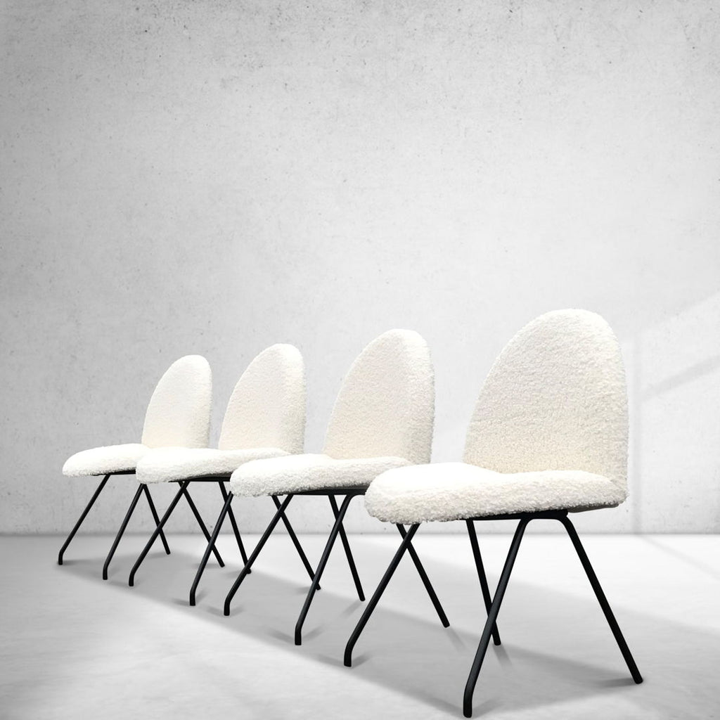 The specific chairs in question feature a black frame and white bouclé fabric.