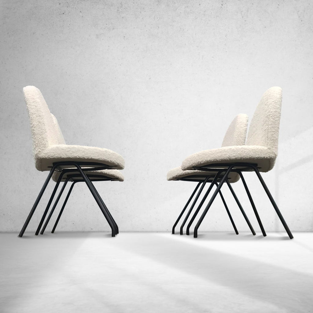 프랑스의 디자인 거장 Joseph André Motte가 제작한 악명 높은 Language 다이닝 체어 세트로, 좌석의 독특한 모양으로 인해 "Tongue" 의자라고도 알려져 있습니다. 이 의자는 Steiner France의 Joseph André Motte가 Steiner 시리즈의 일부로 1954년에 디자인했습니다. 771 의자는 실제로 770 시리즈와 함께 디자인되었습니다. 그리고 모양의 금속 프레임과 둥근 형태의 좌석 모두에서 유사점은 분명합니다. 전형적인 Motte 디자인 특징인 바닥 근처의 피트의 비틀림을 확인하세요. 또한 좌석과 등받이의 모양과 형태가 완전히 동일하다는 사실도 있습니다. 문제의 특정 의자는 검정색 프레임과 흰색 부클레 패브릭이 특징입니다. 의자의 상태는 매우 좋습니다. 발은 파우더 코팅 처리되었으며 새로 덮개를 씌웠습니다.