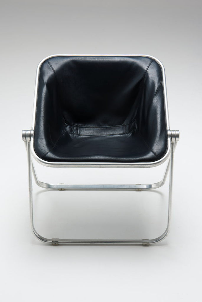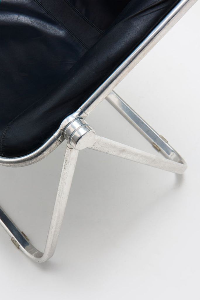 Castelli를 위해 Giancarlo Piretti가 디자인한 1970년대 'Plona' 접이식 의자. 이 에디션에는 진한 파란색 가죽으로 덮인 시트가 있으며, 프레임은 광택 처리된 알루미늄으로 만들어졌습니다. 덮개를 씌운 시트와 알루미늄 프레임의 조합으로 의자가 가볍고 사용하기 쉽습니다. 연식 및 사용에 따른 약간의 마모. 가죽시트는 사진과 같이 약간의 스크래치가 있고, 알루미늄 프레임은 약간의 마모와 가벼운 산화가 있습니다. 이는 의자에 많은 매력과 개성을 더해줍니다.