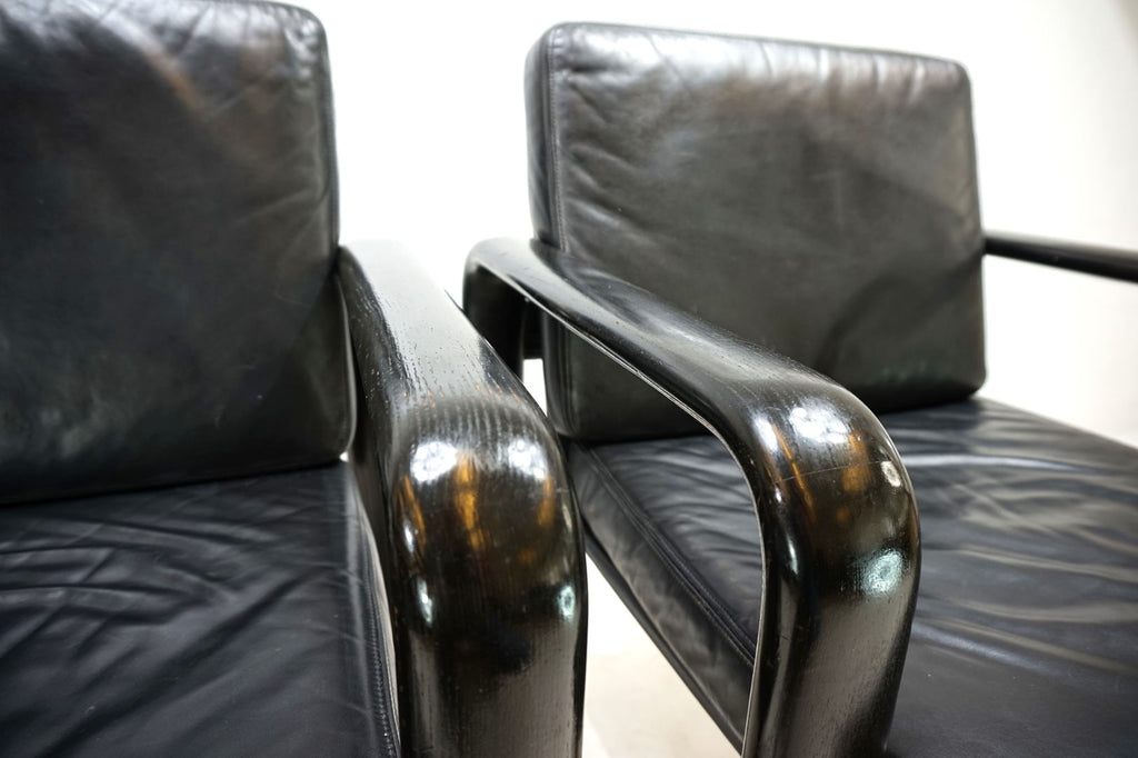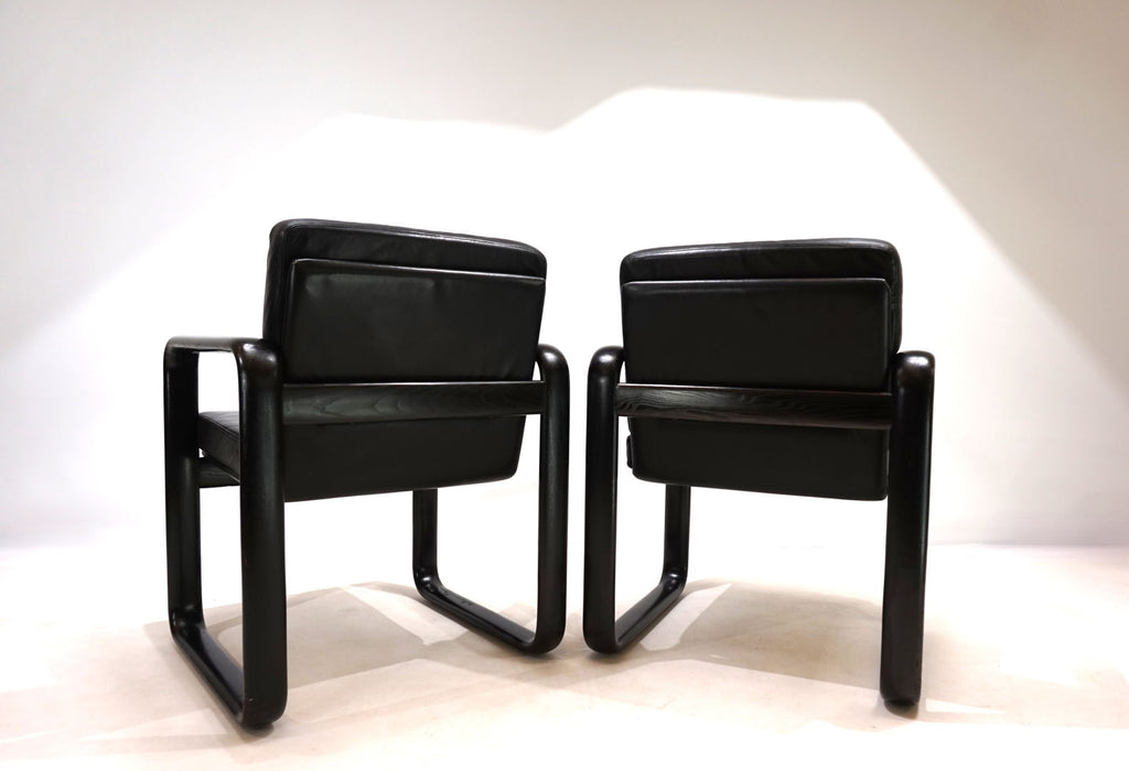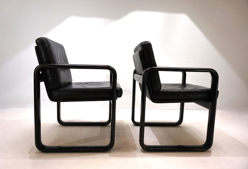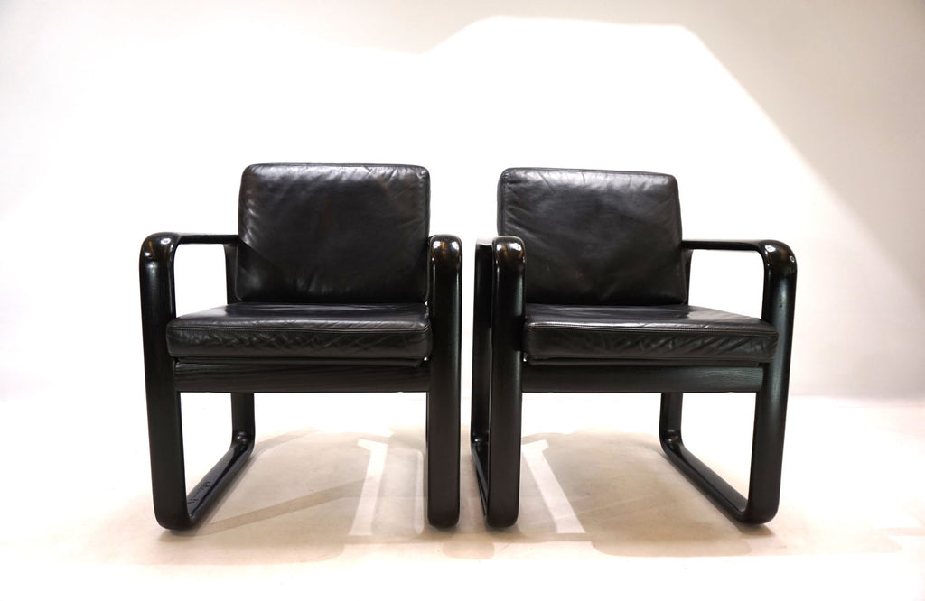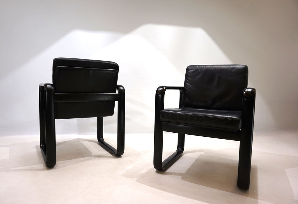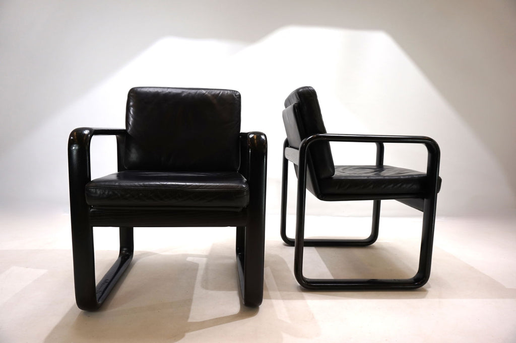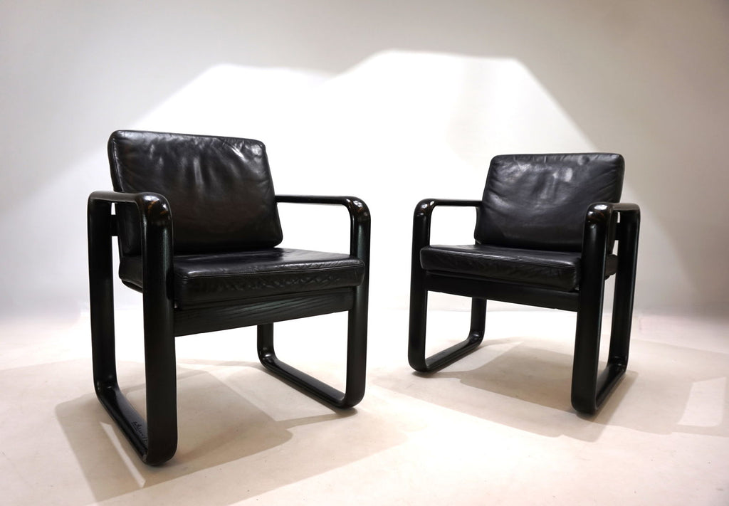 The set of two of these striking Hombre chairs comes in the most popular color combination of black leather/black wooden frame. The leather of the chairs is in very good condition and the seating comfort is impeccable. The cubist wooden frames of the chairs show an attractive patina with slight signs of wear. These timeless chairs can be used as dining room chairs or conference chairs. A fixing screw for the back cushion on one of the chairs is no longer present, but this does not affect the functionality of the chair in any way and is not visible.