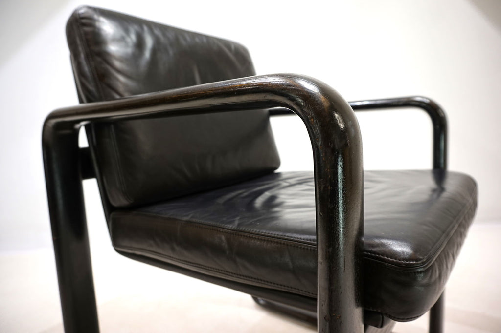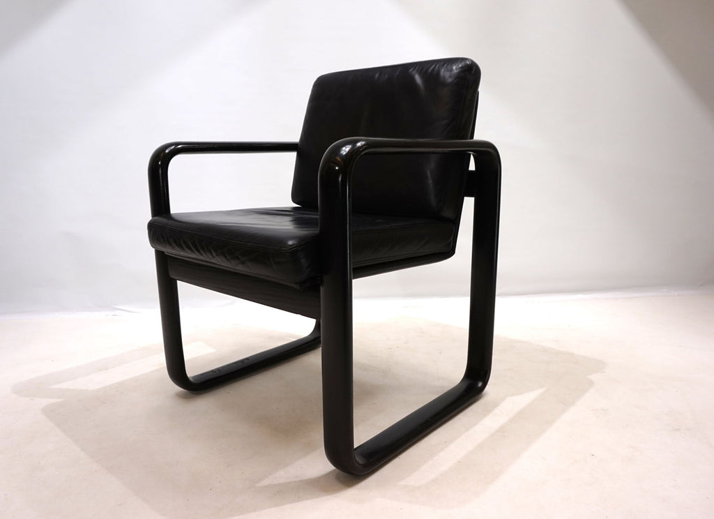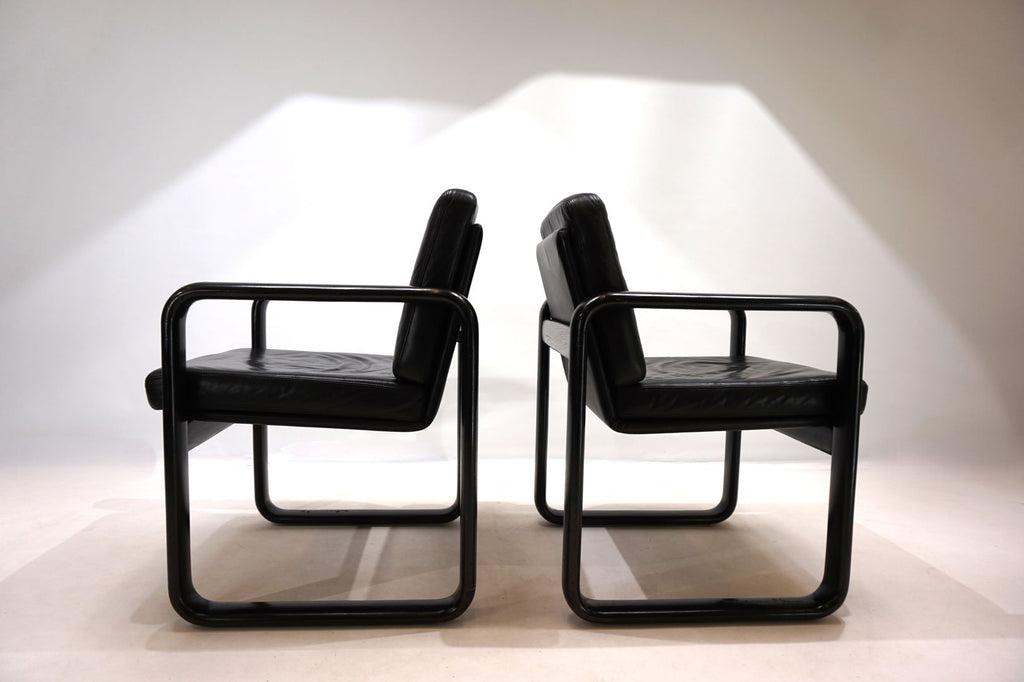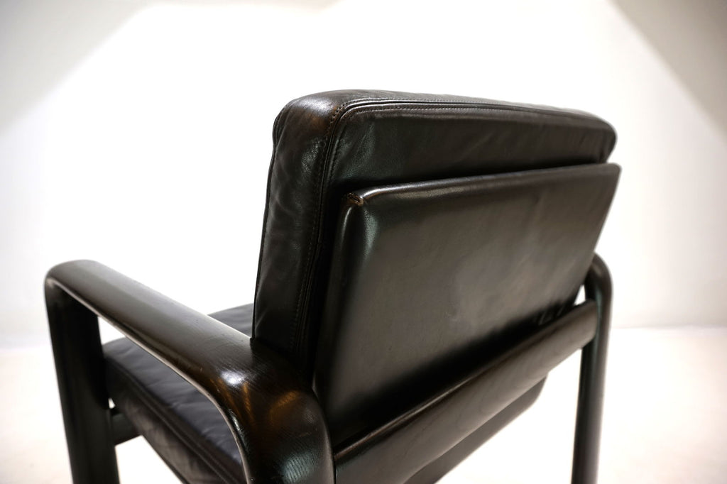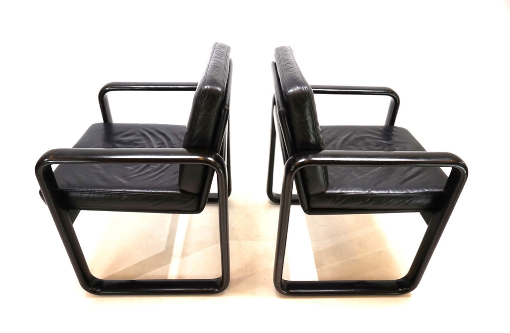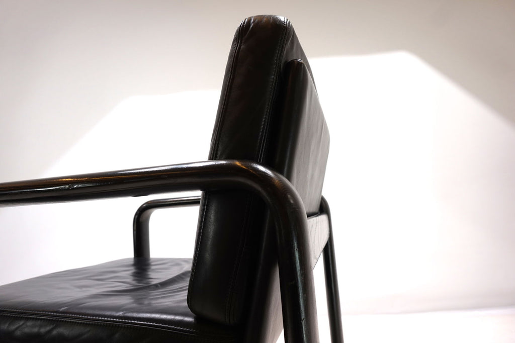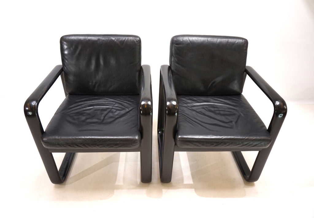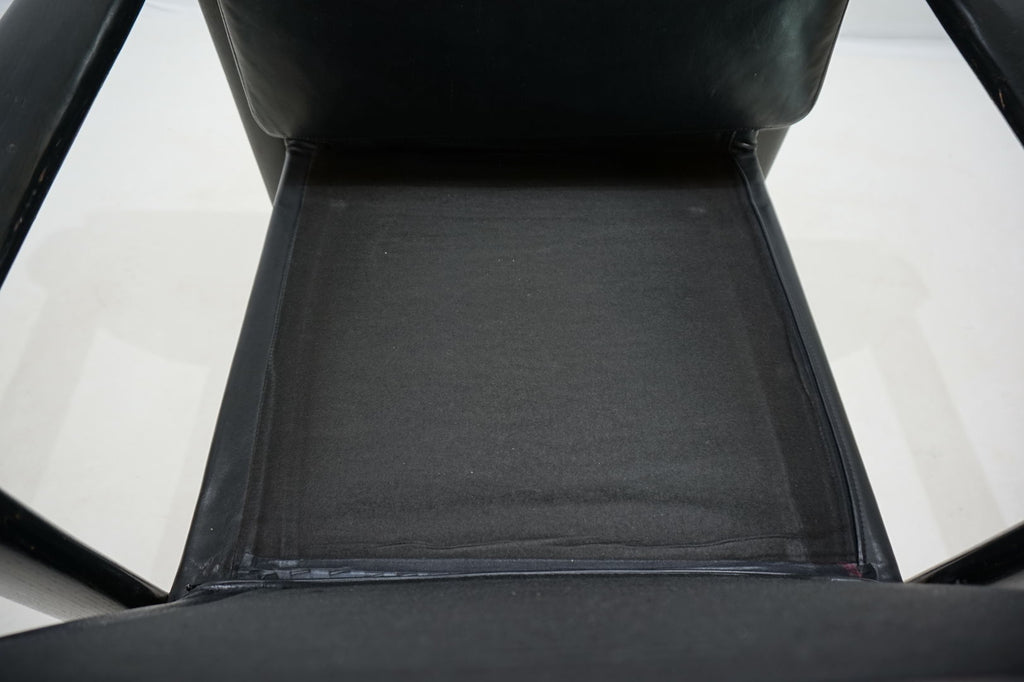 The set of two of these striking Hombre chairs comes in the most popular color combination of black leather/black wooden frame. The leather of the chairs is in very good condition and the seating comfort is impeccable. The cubist wooden frames of the chairs show an attractive patina with slight signs of wear. These timeless chairs can be used as dining room chairs or conference chairs. A fixing screw for the back cushion on one of the chairs is no longer present, but this does not affect the functionality of the chair in any way and is not visible.