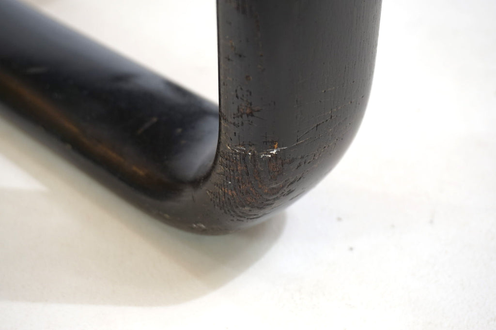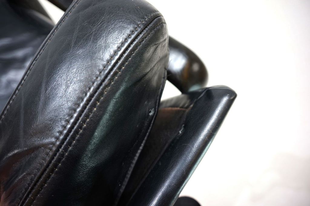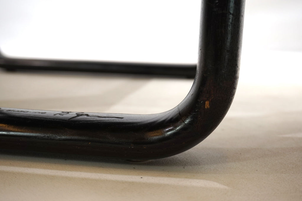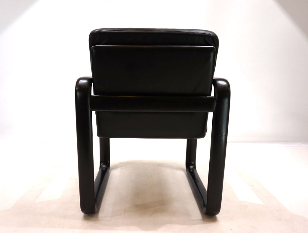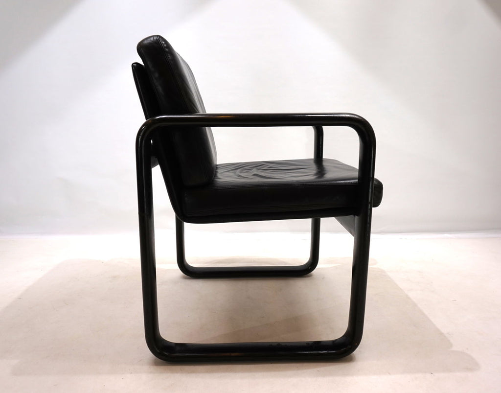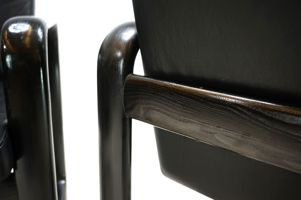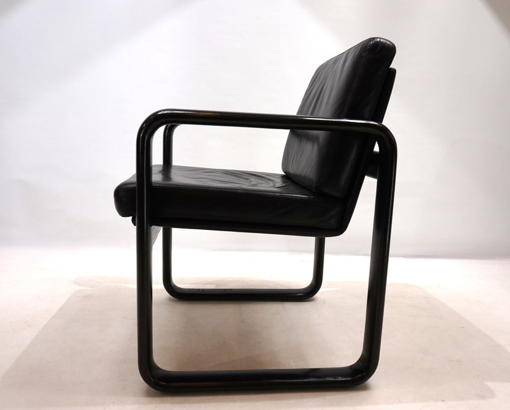 The set of two of these striking Hombre chairs comes in the most popular color combination of black leather/black wooden frame. The leather of the chairs is in very good condition and the seating comfort is impeccable. The cubist wooden frames of the chairs show an attractive patina with slight signs of wear. These timeless chairs can be used as dining room chairs or conference chairs. A fixing screw for the back cushion on one of the chairs is no longer present, but this does not affect the functionality of the chair in any way and is not visible.