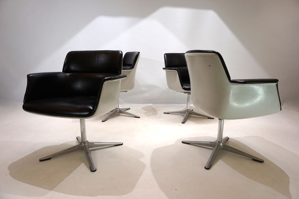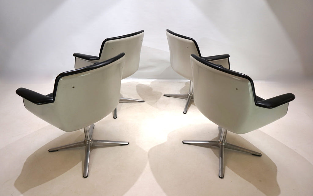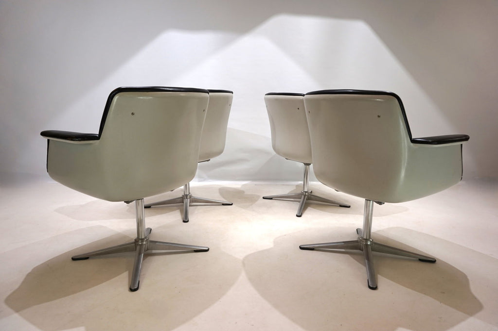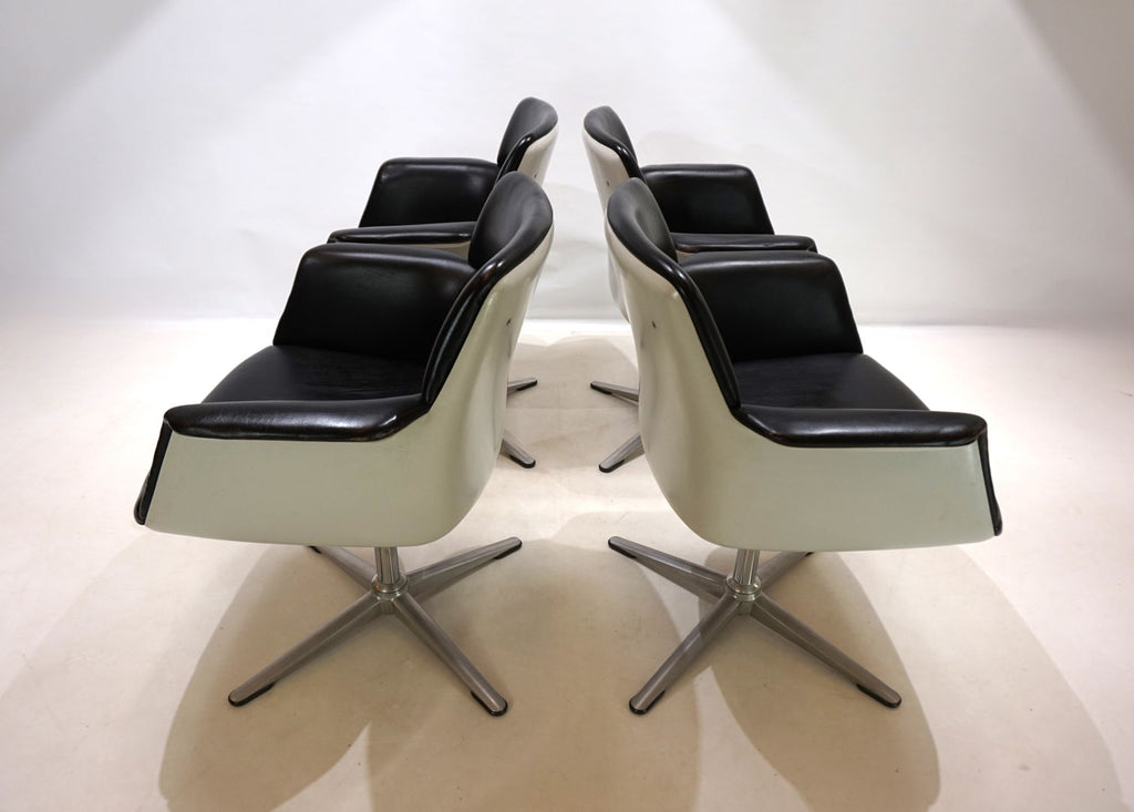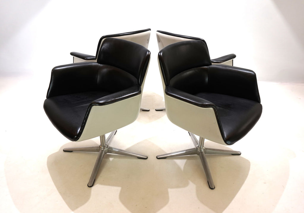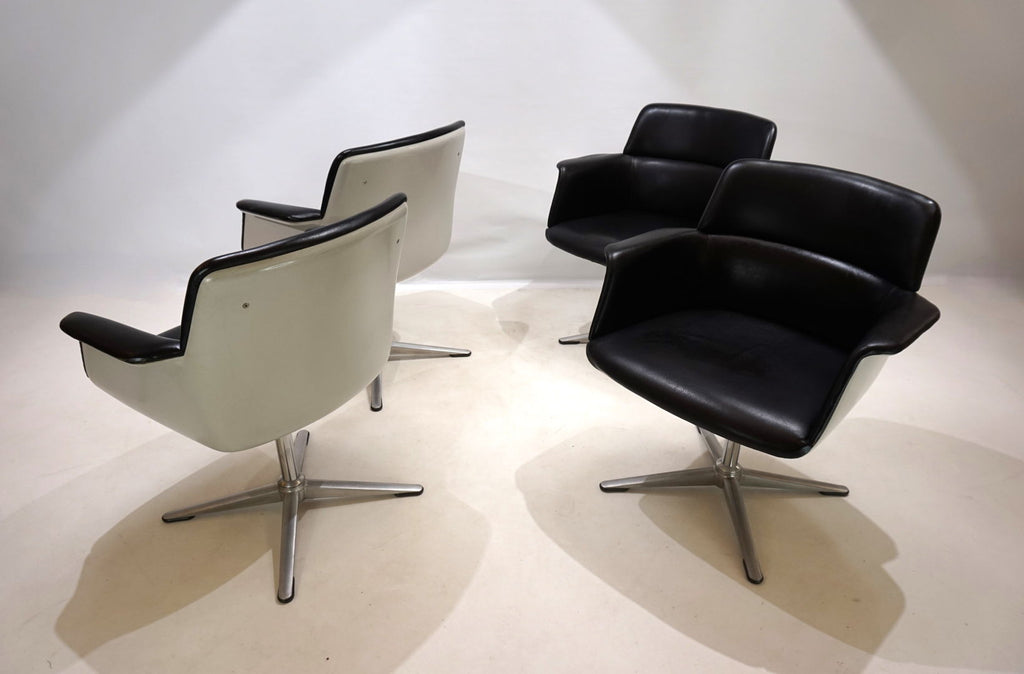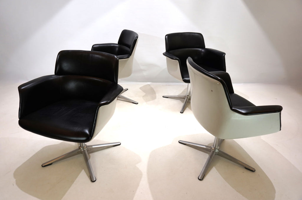 This set of four Friso Kramer chairs is in very good condition. The black artificial leather has a light, attractive patina. The ivory-colored fiberglass shells of the chairs are undamaged. The aluminum frames show minimal signs of wear. An absolute classic in 60s design that can be used as an office, conference or dining room chair. More than 100 years ago, the Wilkhahn company was founded by Friedrich Hahne and Christian Wilkening as a chair factory. In 1946, contact was made with the Deutsche Werkstätten and the designers Georg Leowald and Herbert Hirche, who worked in the Bauhaus tradition. Since then, Wilkhahn has been one of the premium manufacturers of office furniture. The Dutch designer Friso Kramer was one of the leading industrial designers in the Netherlands and was friends with the Hahne family. He designed this chair for Wilkhahn in the late 1960s.