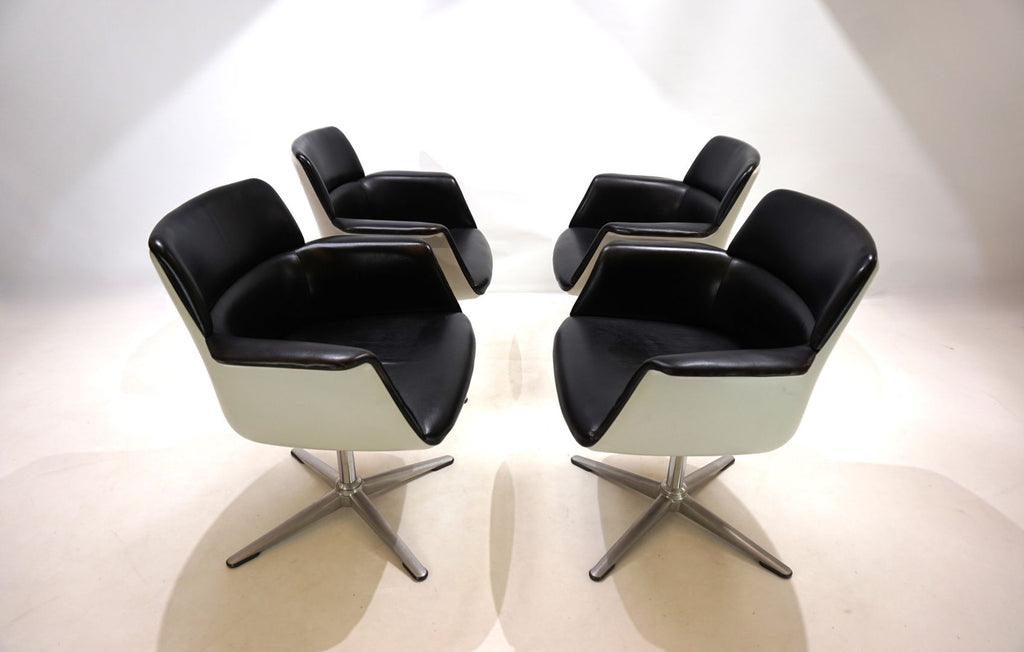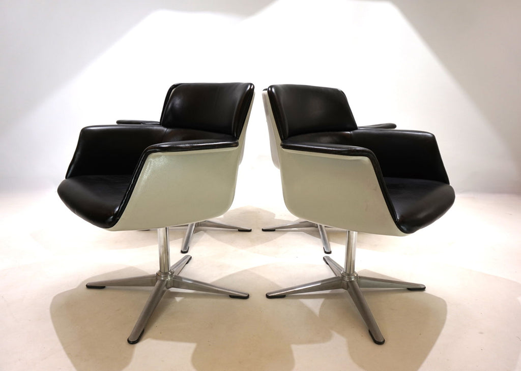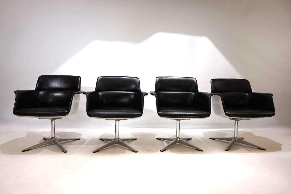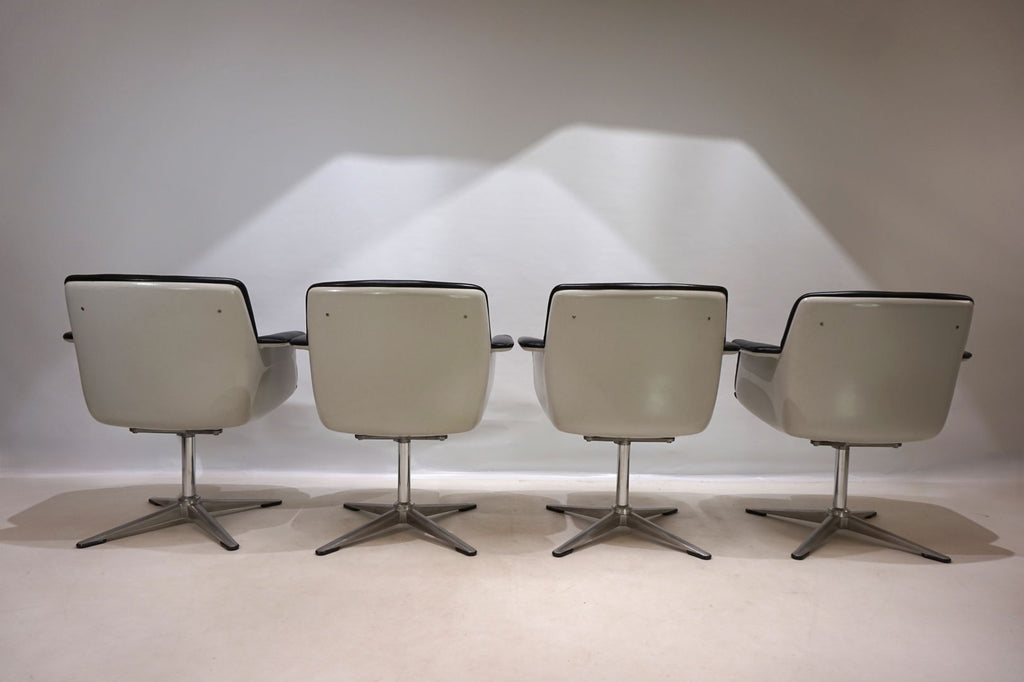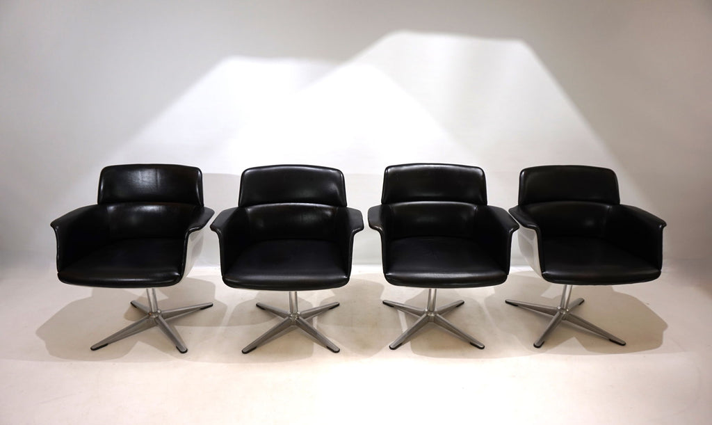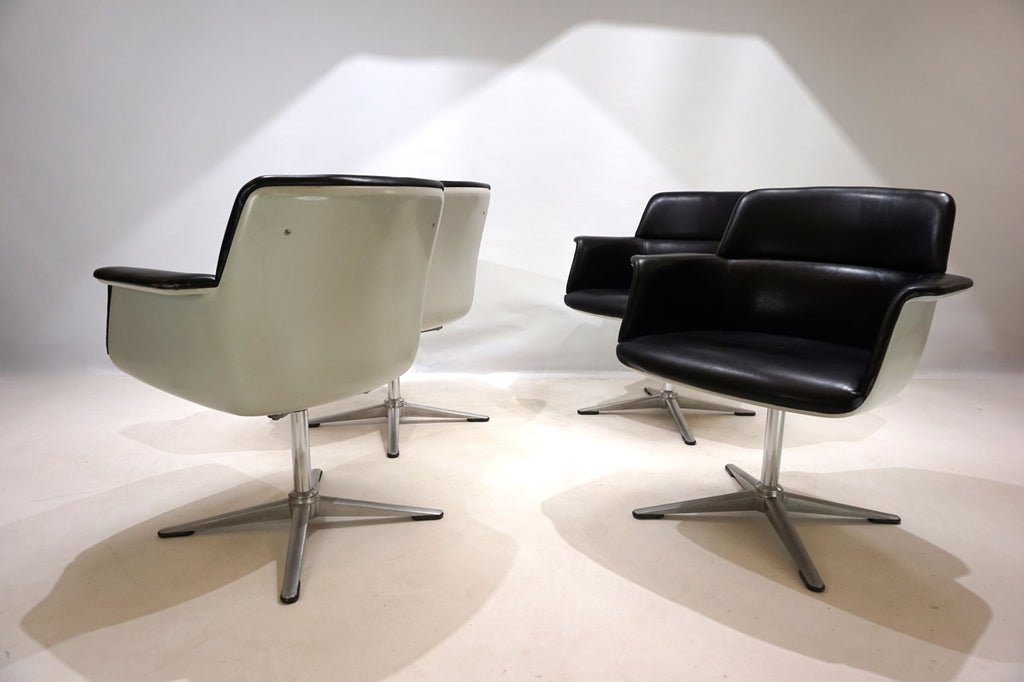 This set of four Friso Kramer chairs is in very good condition. The black artificial leather has a light, attractive patina. The ivory-colored fiberglass shells of the chairs are undamaged. The aluminum frames show minimal signs of wear. An absolute classic in 60s design that can be used as an office, conference or dining room chair. More than 100 years ago, the Wilkhahn company was founded by Friedrich Hahne and Christian Wilkening as a chair factory. In 1946, contact was made with the Deutsche Werkstätten and the designers Georg Leowald and Herbert Hirche, who worked in the Bauhaus tradition. Since then, Wilkhahn has been one of the premium manufacturers of office furniture. The Dutch designer Friso Kramer was one of the leading industrial designers in the Netherlands and was friends with the Hahne family. He designed this chair for Wilkhahn in the late 1960s.