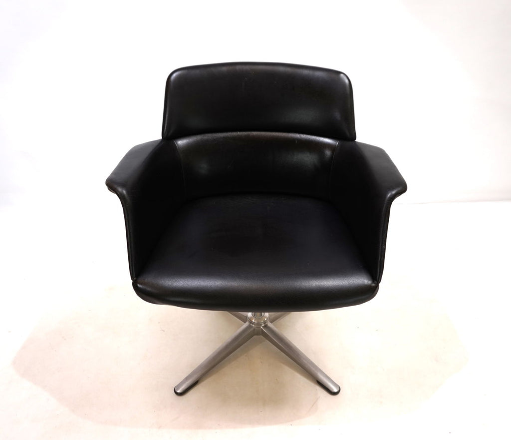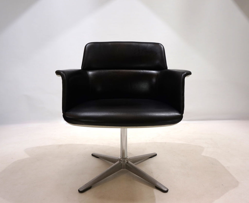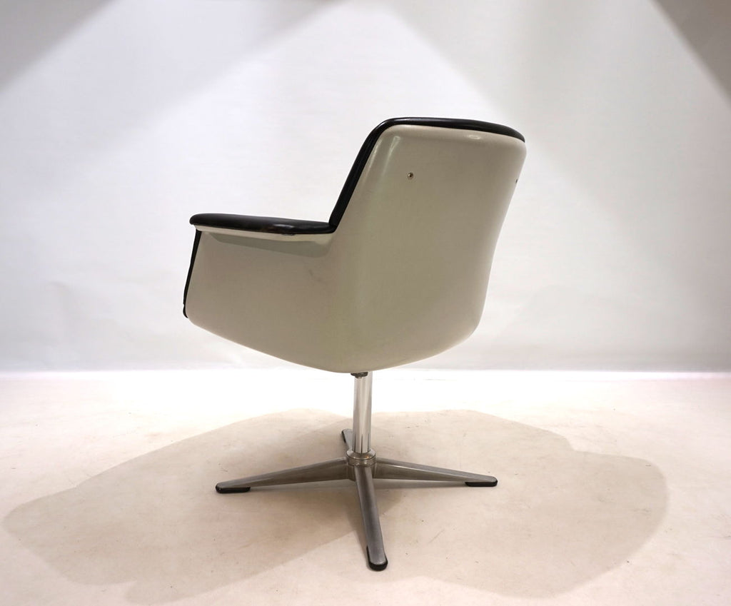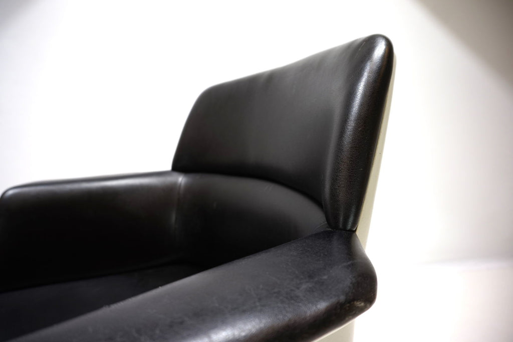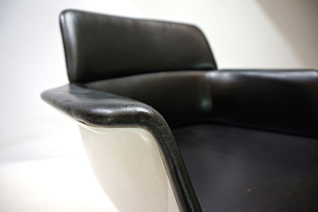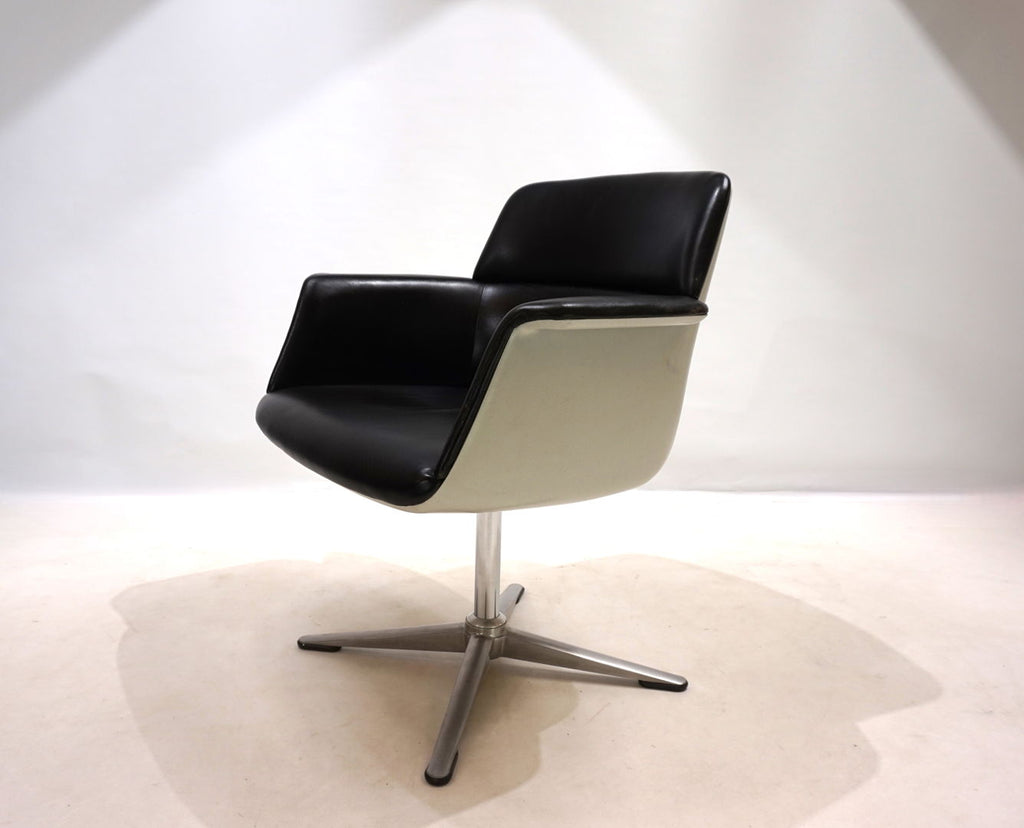 This set of four Friso Kramer chairs is in very good condition. The black artificial leather has a light, attractive patina. The ivory-colored fiberglass shells of the chairs are undamaged. The aluminum frames show minimal signs of wear. An absolute classic in 60s design that can be used as an office, conference or dining room chair. More than 100 years ago, the Wilkhahn company was founded by Friedrich Hahne and Christian Wilkening as a chair factory. In 1946, contact was made with the Deutsche Werkstätten and the designers Georg Leowald and Herbert Hirche, who worked in the Bauhaus tradition. Since then, Wilkhahn has been one of the premium manufacturers of office furniture. The Dutch designer Friso Kramer was one of the leading industrial designers in the Netherlands and was friends with the Hahne family. He designed this chair for Wilkhahn in the late 1960s.