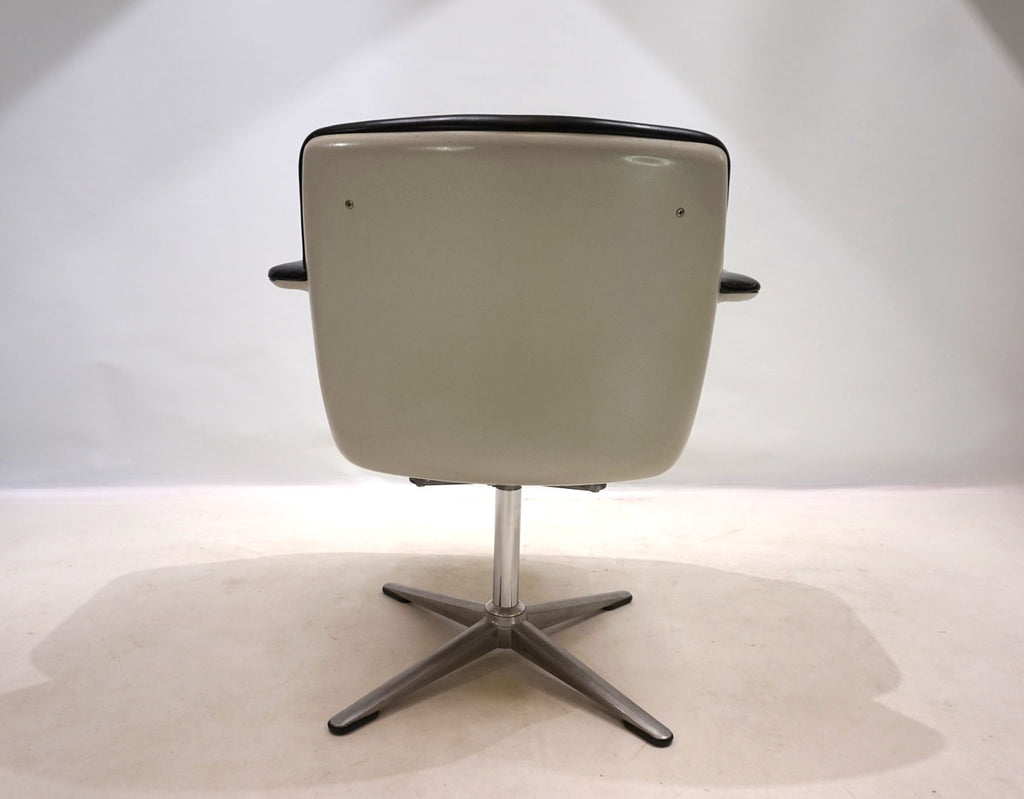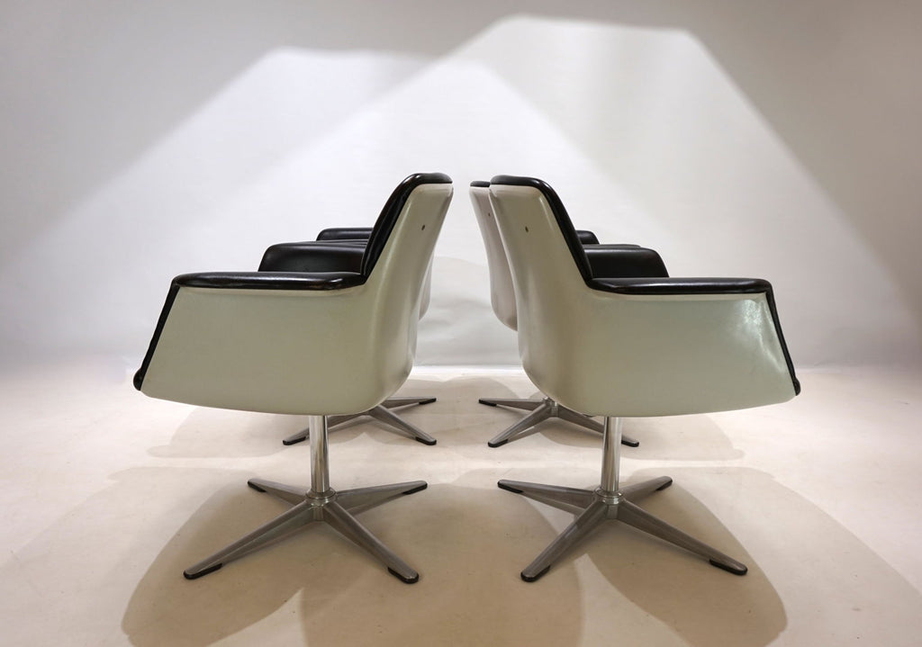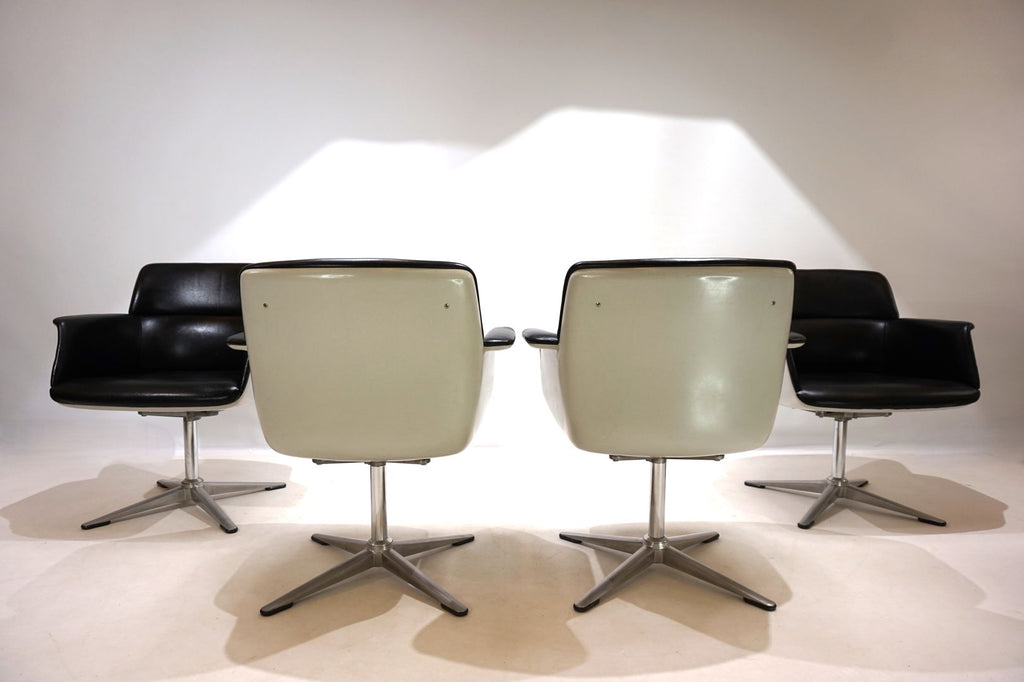 Friso Kramer 의자 4개 세트는 상태가 매우 좋습니다. 블랙 인조 가죽은 가볍고 매력적인 녹청을 선사합니다. 의자의 아이보리색 유리섬유 껍질은 손상되지 않았습니다. 알루미늄 프레임에는 마모 흔적이 거의 없습니다. 사무실, 회의실 또는 식당 의자로 사용할 수 있는 60년대 디자인의 완벽한 클래식입니다. 100여년 전 Wilkhahn 회사는 Friedrich Hahne과 Christian Wilkening에 의해 의자 공장으로 설립되었습니다. 1946년에 Deutsche Werkstätten과 바우하우스 전통에서 일했던 디자이너 Georg Leowald 및 Herbert Hirche와 접촉이 이루어졌습니다. 그 이후로 Wilkhahn은 사무용 가구의 프리미엄 제조업체 중 하나가 되었습니다. 네덜란드 디자이너 Friso Kramer는 네덜란드 최고의 산업 디자이너 중 한 명이며 Hahne 가족과 친구였습니다. 그는 1960년대 후반 Wilkhahn을 위해 이 의자를 디자인했습니다.