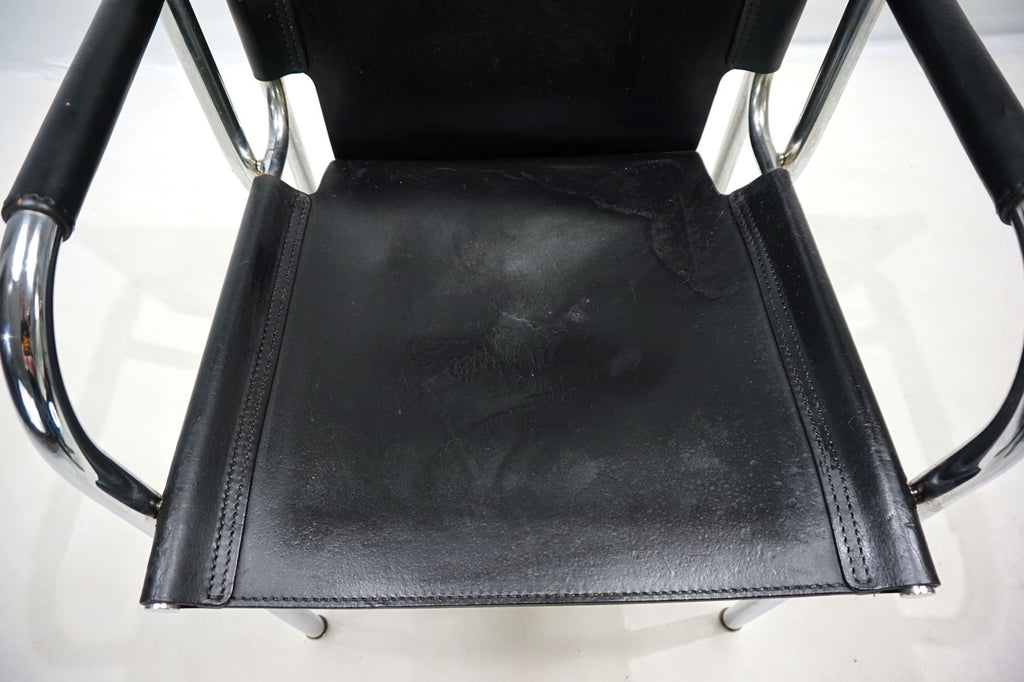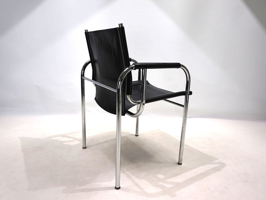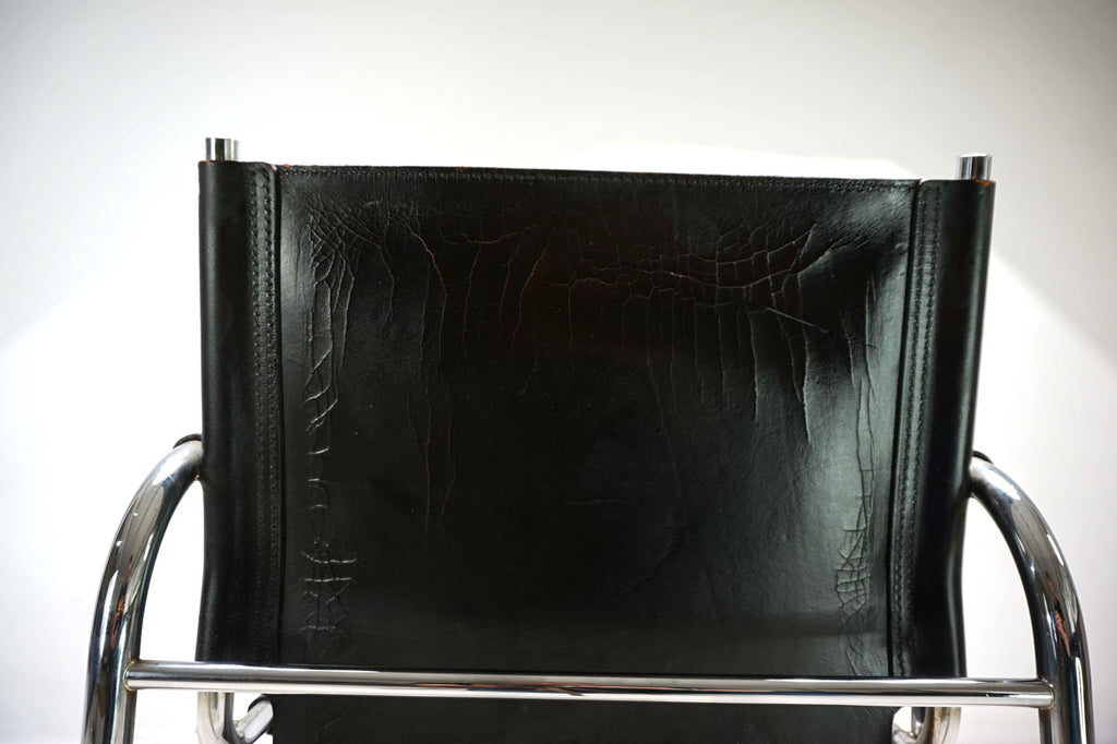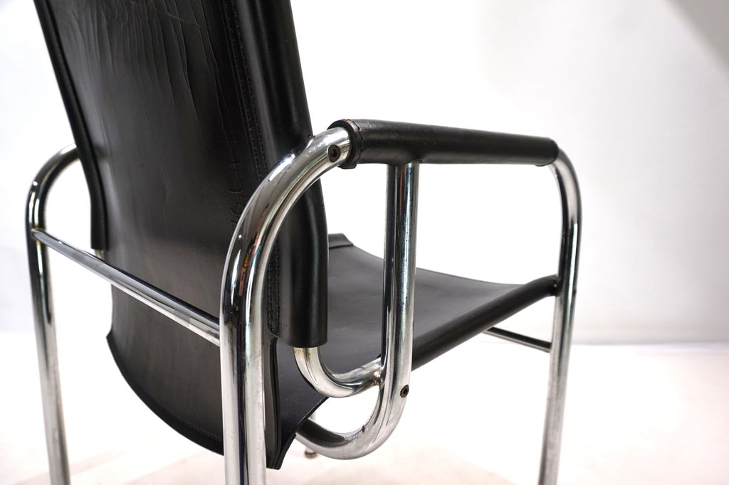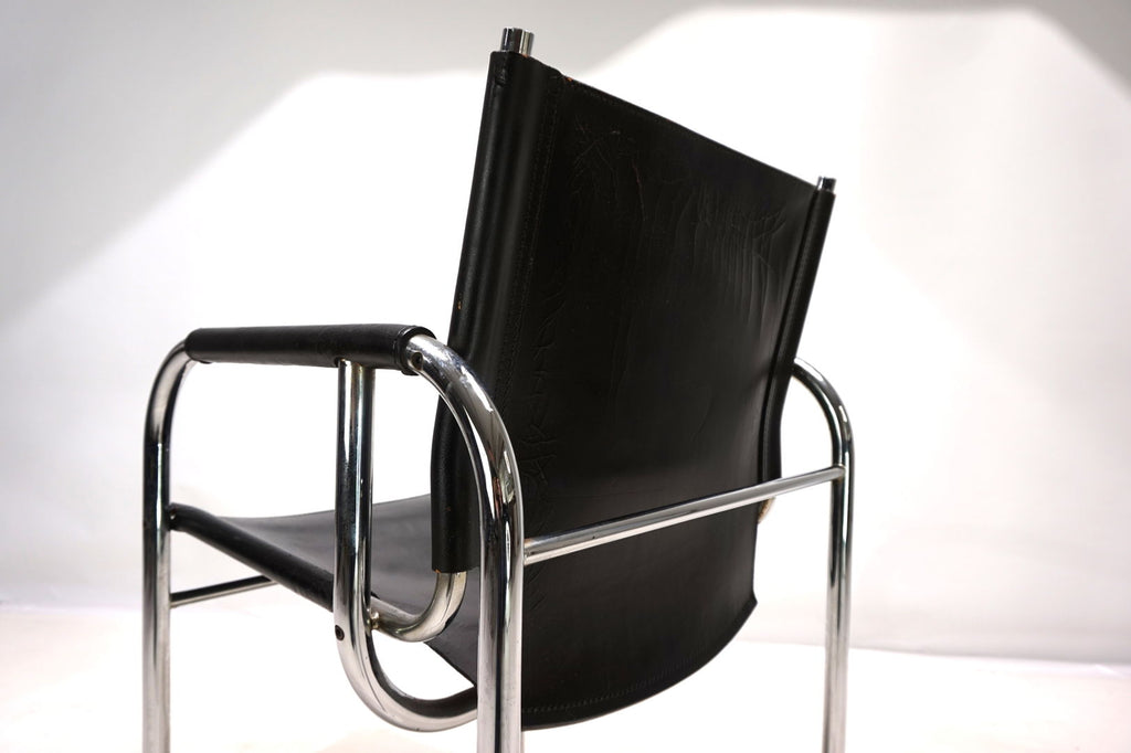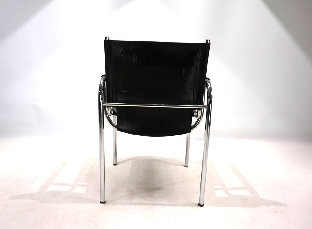 A Strässle HE leather lounge chair from the 1960s in good condition but with a noticeable patina. The leather of the lounge chair, in a deep black leather tone, is roughened in some places and has craquelures in the leather on the backrest. The chrome frame is in very good condition. The chair can be used as an office chair or dining room chair.