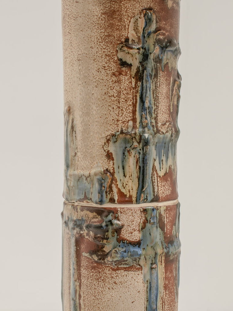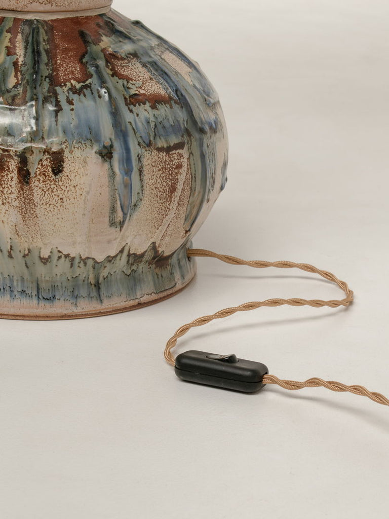 Elegant, warm, and soft are the words that come to mind with this lamp. The ceramic base has been hand-made and features beautiful cream, beige, baby blue, and terracotta glazing.