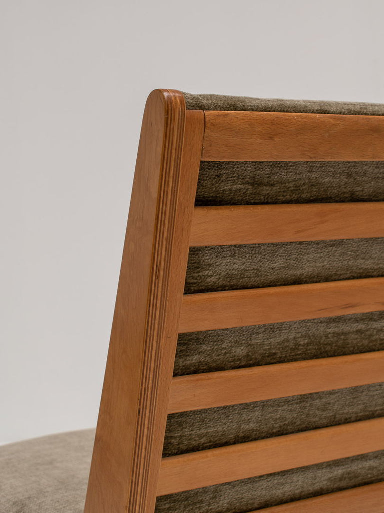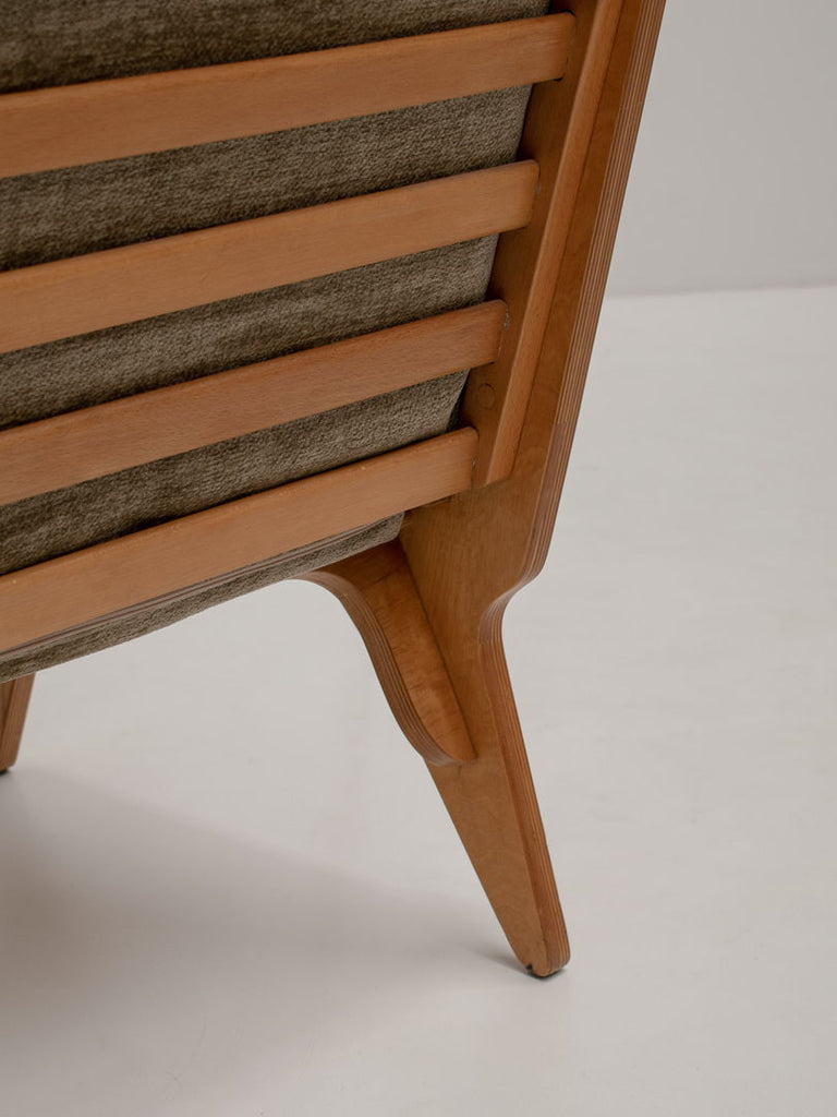 Naive, modernist, vintage armchairs in a light-colored oak. They pair beautifully with the "elephant grey" textured fabric.
