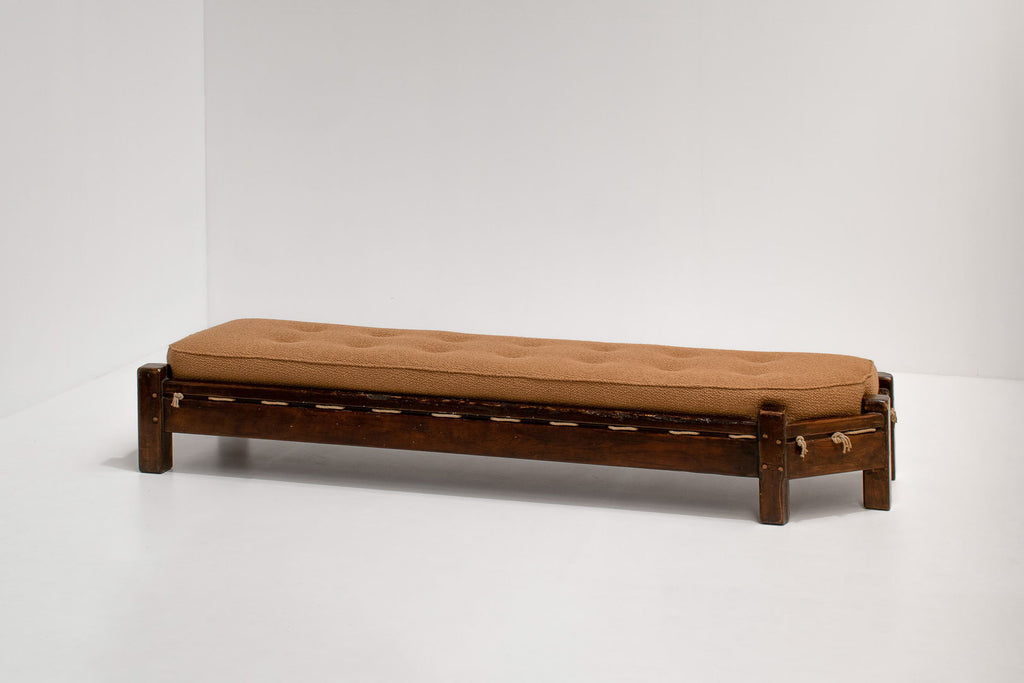 단단한 나무 프레임과 밧줄로 된 구조, 1960년대 중반, 와비 사비 스타일의 세련된 침대 겸용 소파. 프랑스에서 공급되며 Charlotte Perriand 및 일부 브라질 세기 중반 디자인을 연상시킵니다. 조각에는 원시 구조를 여전히 볼 수 있는 단단한 나무 프레임이 있습니다. 나무는 어두운 얼룩과 새틴 마감 처리되었습니다. 거친 로프와의 조합은 제품의 투박함을 강조함과 동시에 매우 세련되고 우아한 느낌을 주는 데이베드입니다. 쿠션은 머스터드 브라운 색상의 부클레로 완전히 새롭게 만들어졌습니다. 부클레의 섬세함은 제품의 거칠기와 완벽하게 결합됩니다. 모든 주거 프로젝트를 위한 완벽한 침대 겸용 소파이지만 어떤 갤러리나 상점에서도 멋지게 보일 것입니다.