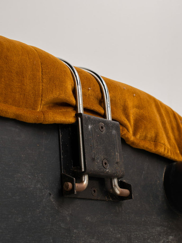 This sofa is an early model and it is in incredibly good condition. Since the entire sofa is made of a plump foam, it is incredibly comfortable. The sofa has been reupholstered by a professional craftsman in a warm yellow-ochre velvet with a mohair look. The sofa is signed, proving its authenticity.