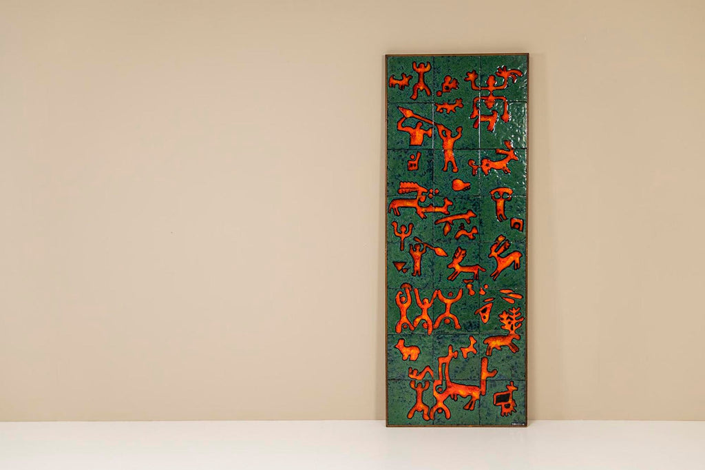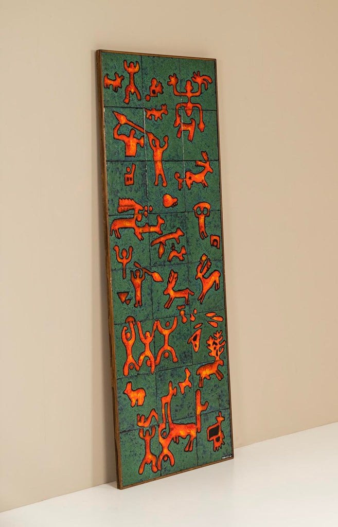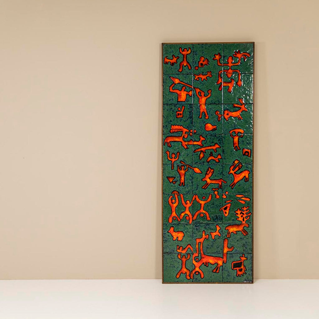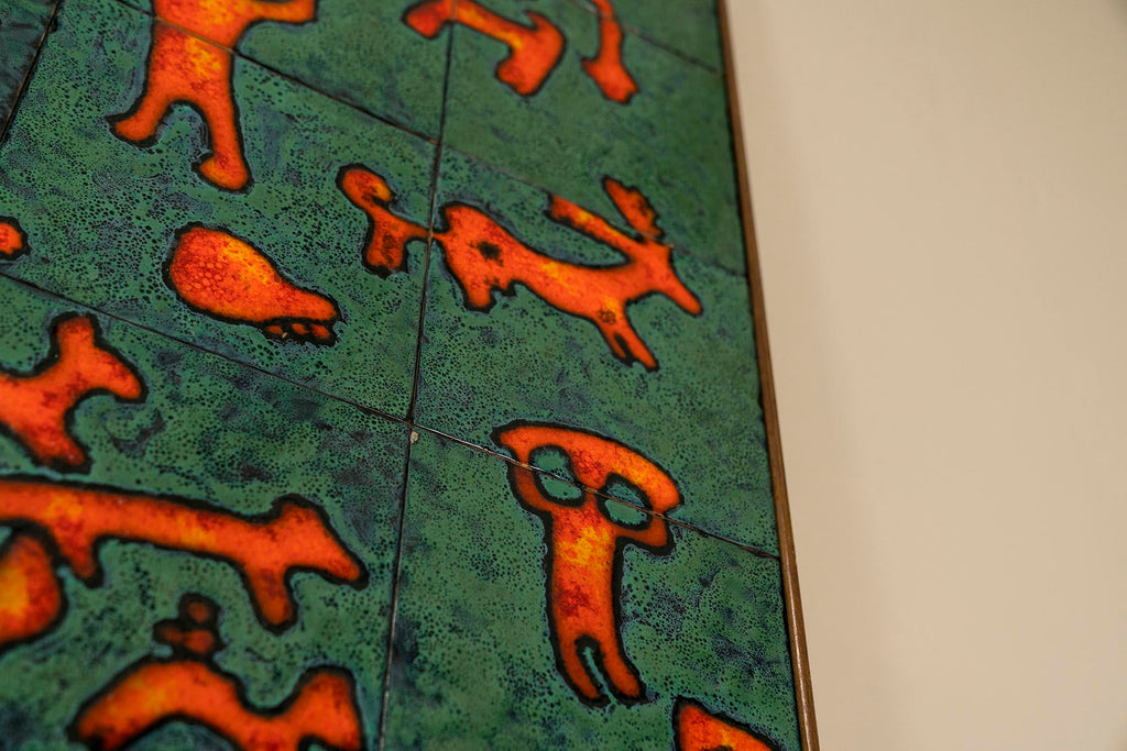 이 독특하고 화려한 예술 작품은 1940년대 고 이탈리아 예술가 Ivanhoé Gambini가 제작했습니다. 그는 1928년에 미래주의 운동에 참여한 건축가였습니다. 1936년까지 예술가는 더 이상 미래적인 내러티브에 기여하지 않고 대신 Busto Arsizio 시의 기술 부서에서 건축 렌더링에 집중했습니다. 이러한 맥락에서 그는 프로젝트의 혁신적인 품질, 그가 고안한 건축 솔루션 및 사용된 재료의 현대화를 강조했습니다. 그 후 그는 예술가로서 더 많이 등장하고 드러났으며 컬러 스프레이 및 에어 브러싱과 같은 기술 사용의 선구자 중 한 명이었습니다. 여기서 보여주는 작품은 감비니도 자신이 거장이라고 믿었던 전문 분야다. 즉, 도자기. 도자기법이 고도로 발달한 것으로 보아 이 그림은 1940년대에 제작된 것으로 추정된다. 나무 프레임도 거의 같은 나이입니다. 감비니는 이 작품을 통해 선사시대 동굴 그림을 예술적으로 재해석했다. 예를 들어 프랑스의 라스코(Lascaux) 동굴에서 우리가 알고 있는 인간의 최초의 소위 비유적 작품의 이미지가 이 작품에 표시됩니다. 사슴과 다른 동물의 실루엣도 보입니다. 황홀한 청록색 배경에서 창을 들고 있는 사람들과 춤을 추는 것처럼 보이는 사람들이 주황색-노란색으로 아름답게 렌더링됩니다. 모두 검은색으로 윤곽선이 그려져 있어 대비가 더욱 커집니다. 이 작품의 구성과 스타일은 일종의 Keith Haring avant la lettre입니다. 그 안에 움직임과 홈이 있고 색상이 정말 튀어나옵니다. 우측하단에 사인이 되어있고 상태가 아주 좋은 작품입니다. 아래쪽에서 세는 다섯 번째 타일의 모서리에 작은 칩이 표시되지만 이것이 이 매력적인 테이블의 모양을 손상시키지 않습니다.