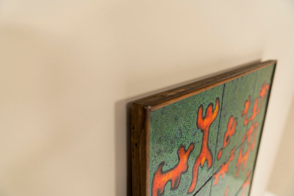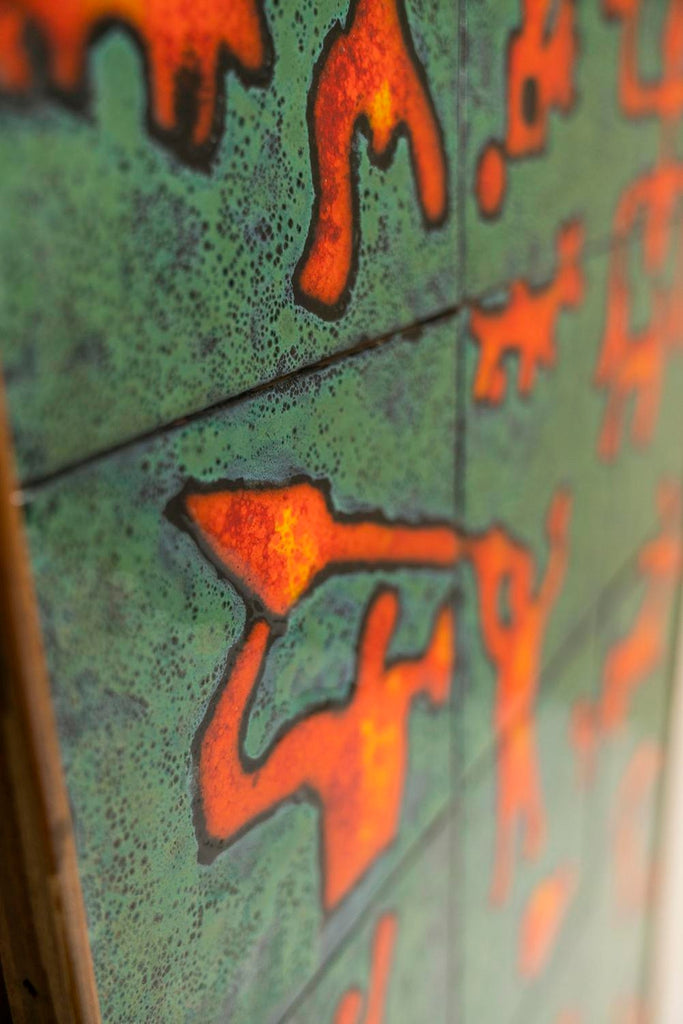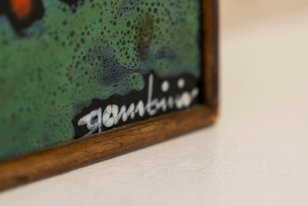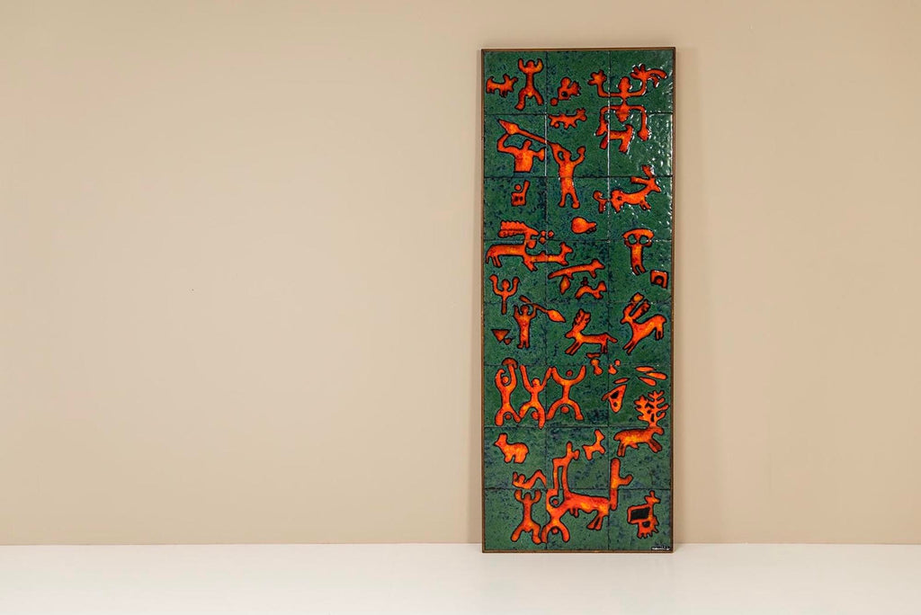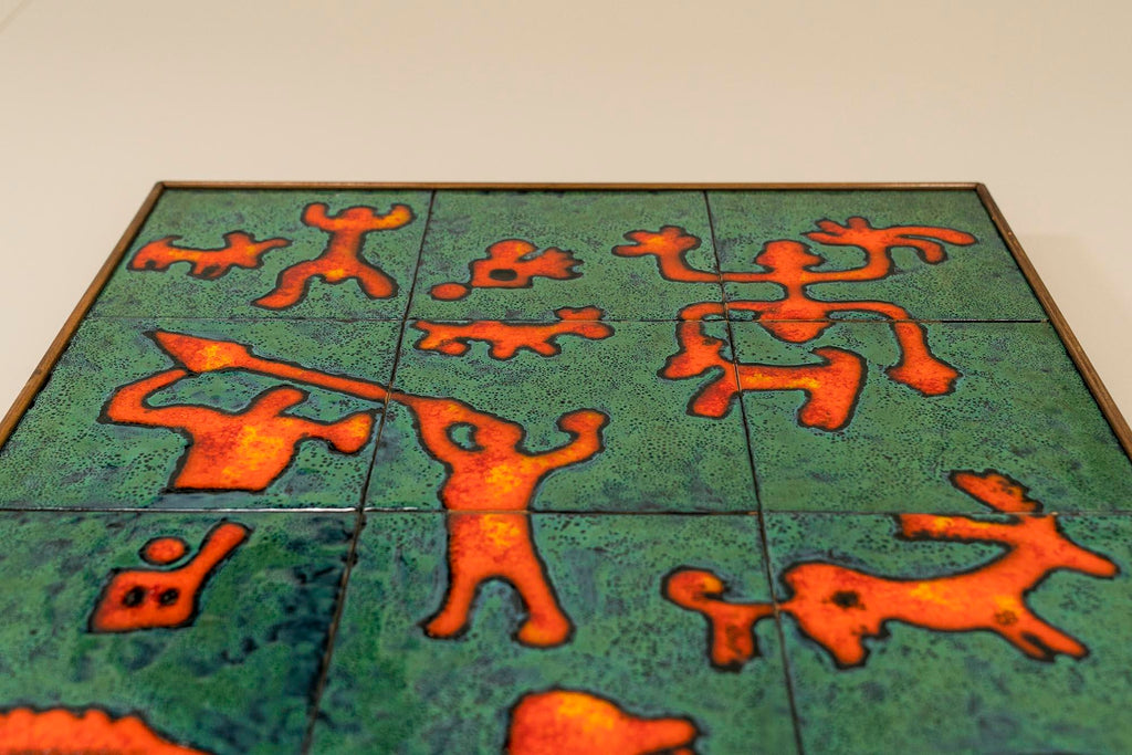 이 독특하고 화려한 예술 작품은 1940년대 고 이탈리아 예술가 Ivanhoé Gambini가 제작했습니다. 그는 1928년에 미래주의 운동에 참여한 건축가였습니다. 1936년까지 예술가는 더 이상 미래적인 내러티브에 기여하지 않고 대신 Busto Arsizio 시의 기술 부서에서 건축 렌더링에 집중했습니다. 이러한 맥락에서 그는 프로젝트의 혁신적인 품질, 그가 고안한 건축 솔루션 및 사용된 재료의 현대화를 강조했습니다. 그 후 그는 예술가로서 더 많이 등장하고 드러났으며 컬러 스프레이 및 에어 브러싱과 같은 기술 사용의 선구자 중 한 명이었습니다. 여기서 보여주는 작품은 감비니도 자신이 거장이라고 믿었던 전문 분야다. 즉, 도자기. 도자기법이 고도로 발달한 것으로 보아 이 그림은 1940년대에 제작된 것으로 추정된다. 나무 프레임도 거의 같은 나이입니다. 감비니는 이 작품을 통해 선사시대 동굴 그림을 예술적으로 재해석했다. 예를 들어 프랑스의 라스코(Lascaux) 동굴에서 우리가 알고 있는 인간의 최초의 소위 비유적 작품의 이미지가 이 작품에 표시됩니다. 사슴과 다른 동물의 실루엣도 보입니다. 황홀한 청록색 배경에서 창을 들고 있는 사람들과 춤을 추는 것처럼 보이는 사람들이 주황색-노란색으로 아름답게 렌더링됩니다. 모두 검은색으로 윤곽선이 그려져 있어 대비가 더욱 커집니다. 이 작품의 구성과 스타일은 일종의 Keith Haring avant la lettre입니다. 그 안에 움직임과 홈이 있고 색상이 정말 튀어나옵니다. 우측하단에 사인이 되어있고 상태가 아주 좋은 작품입니다. 아래쪽에서 세는 다섯 번째 타일의 모서리에 작은 칩이 표시되지만 이것이 이 매력적인 테이블의 모양을 손상시키지 않습니다.