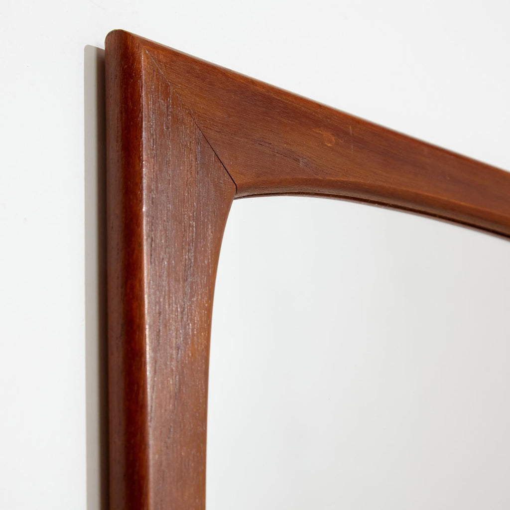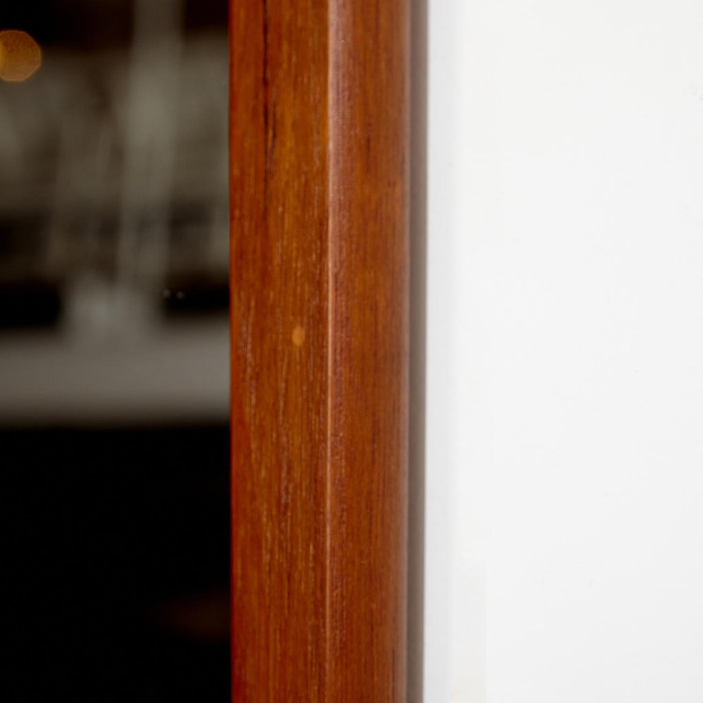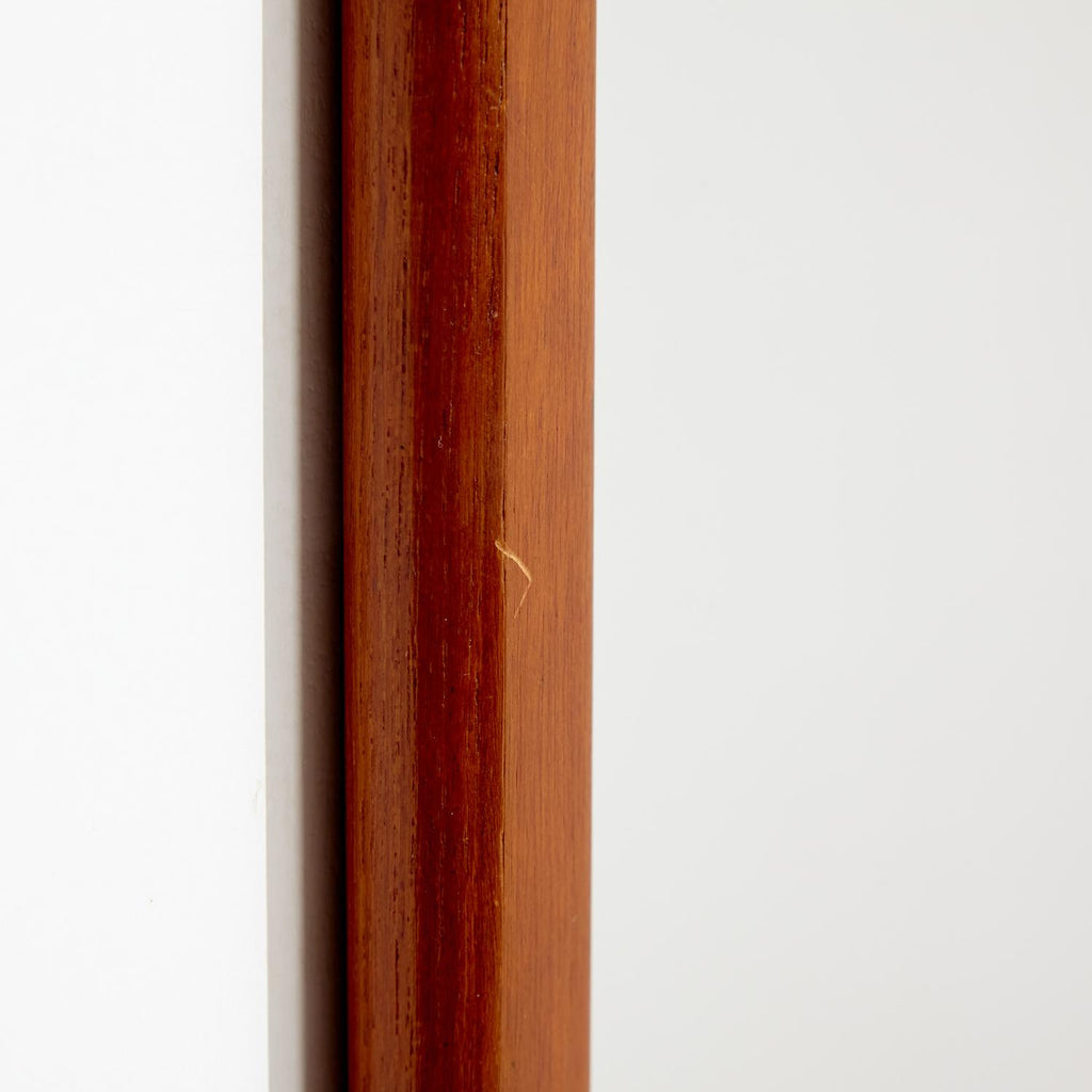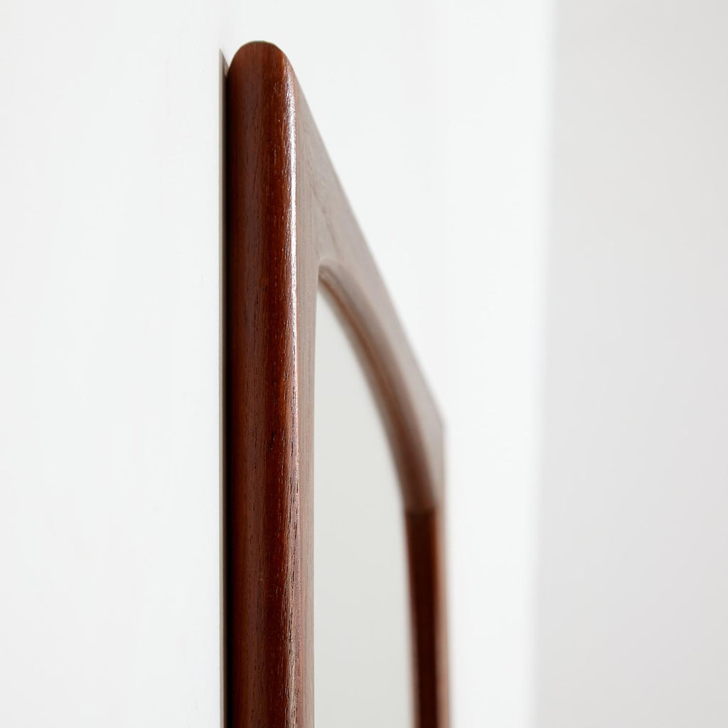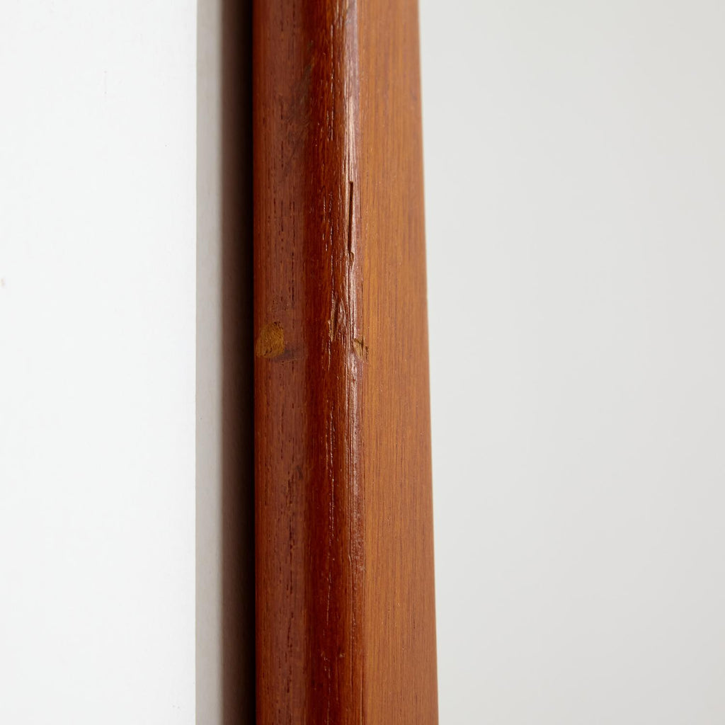 덴마크산 클래식 안감의 긴 티크 프레임 거울. 목제 부분에 약간의 표면 상처나 마모가 있습니다.