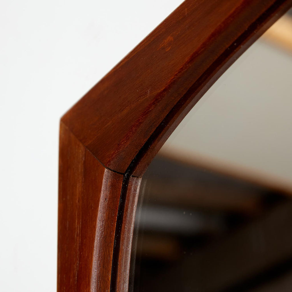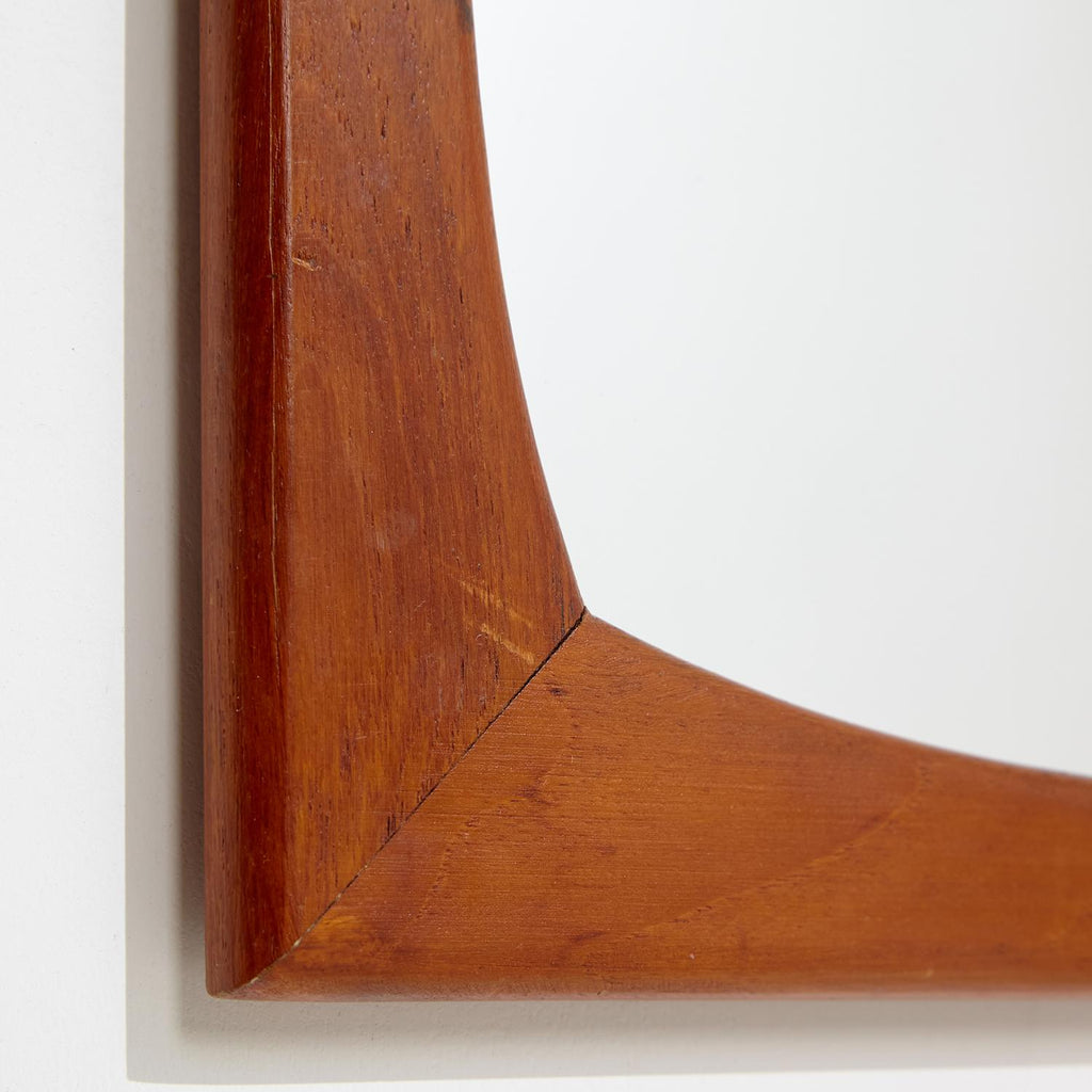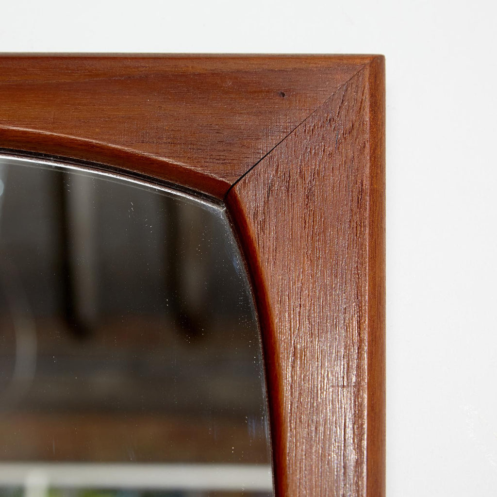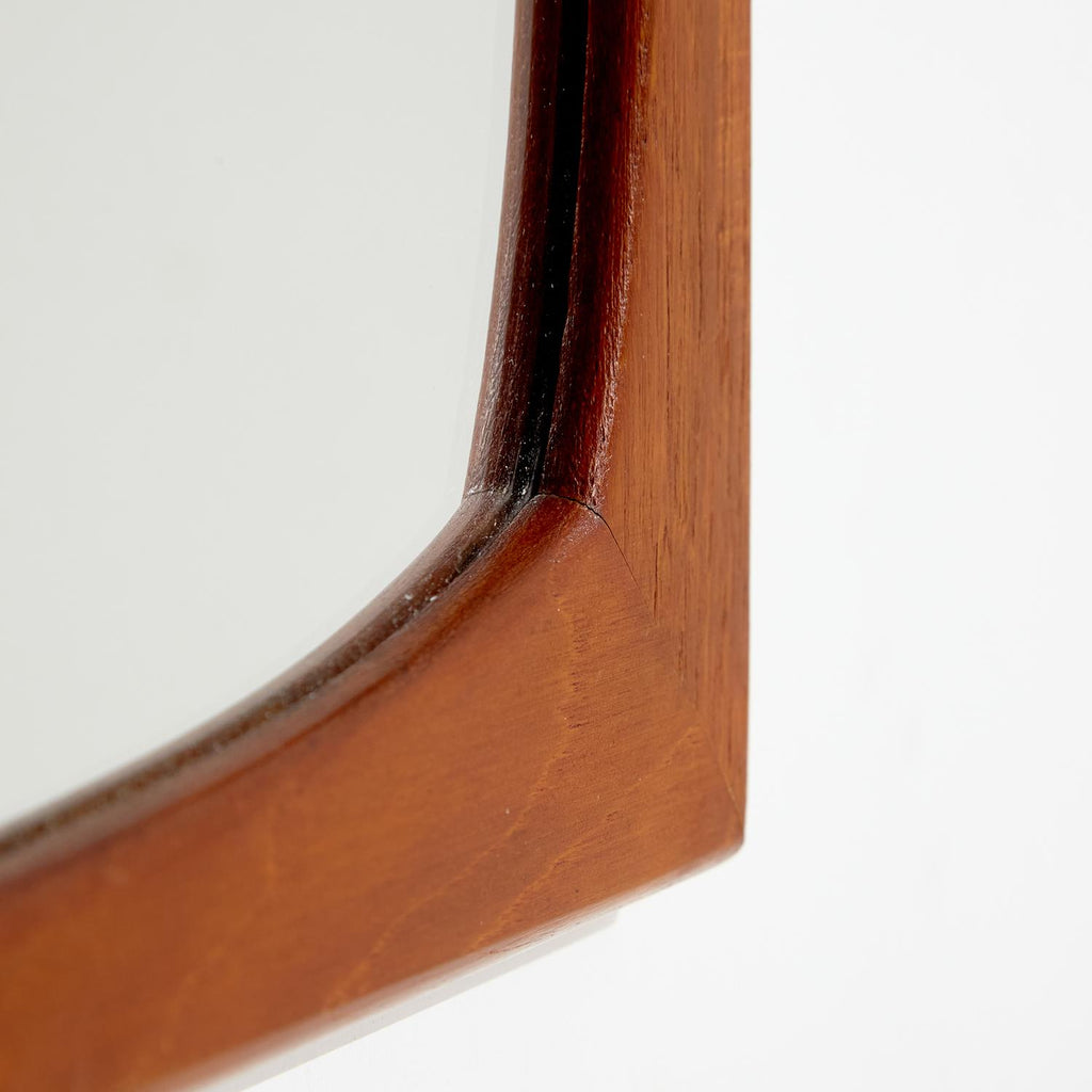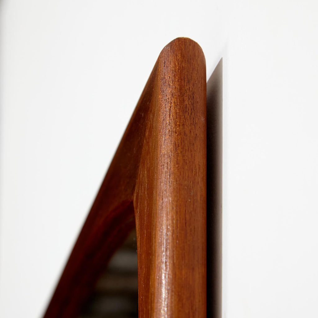 덴마크산 클래식 안감의 긴 티크 프레임 거울. 목제 부분에 약간의 표면 상처나 마모가 있습니다.