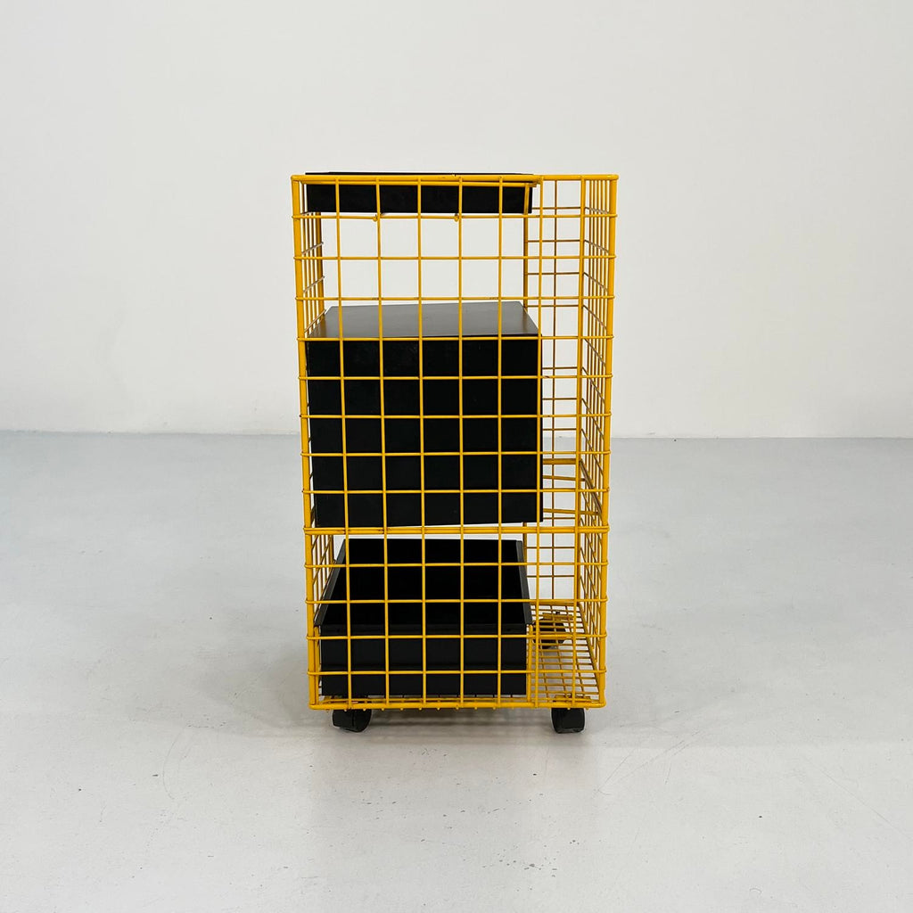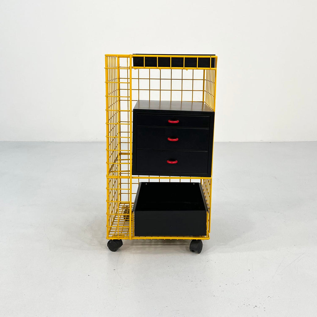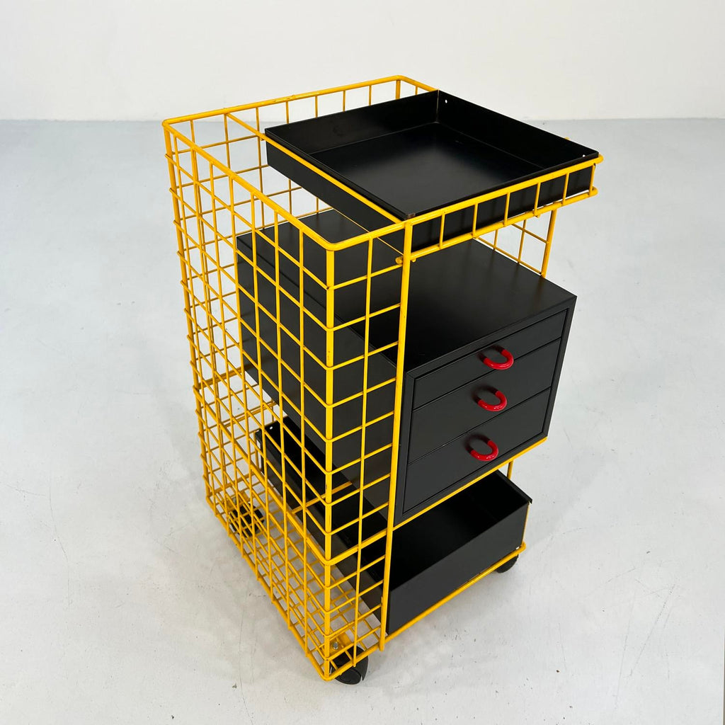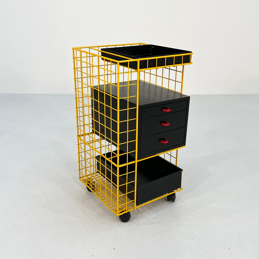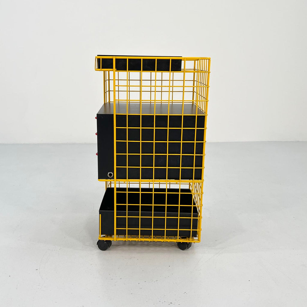 디자인 기간 - 80년대 치수 - 너비 42cm x 깊이 41cm x 높이 76cm 재료 - 금속 색상 - 블랙, 옐로우, 레드 경년 및 사용에 따른 가벼운 마모. 잠금 장치는 있지만 열쇠는 없으며, 서랍 1개를 잠그려면 시스템을 변경해야 합니다.