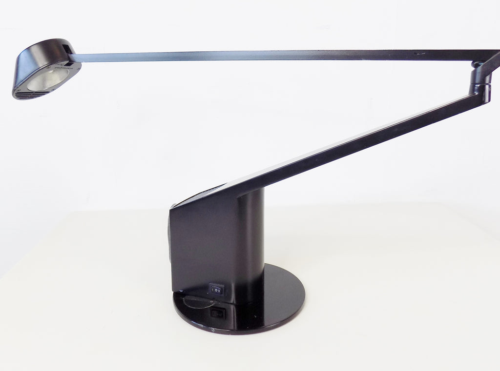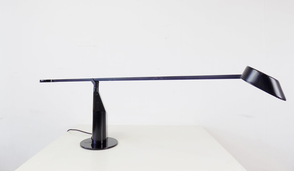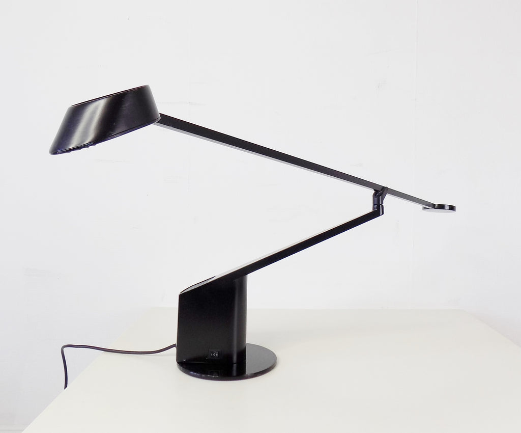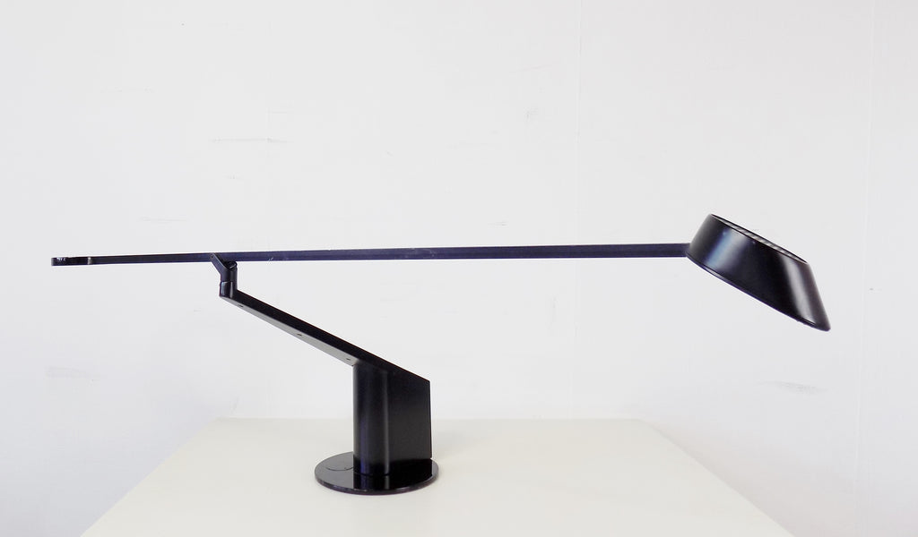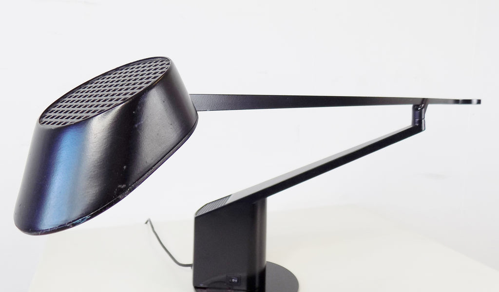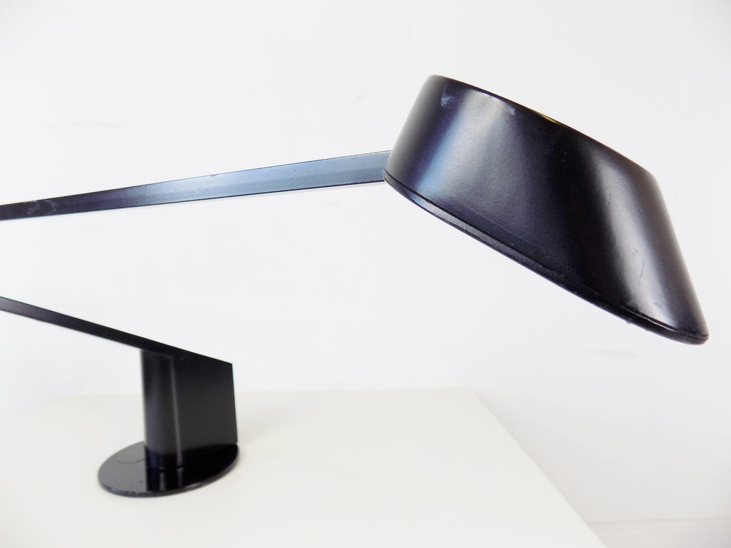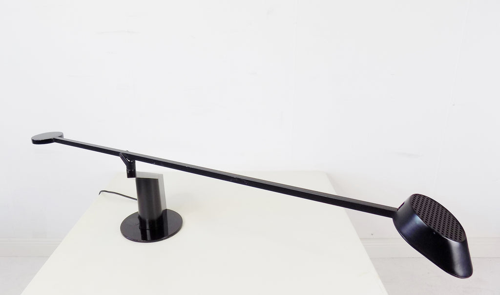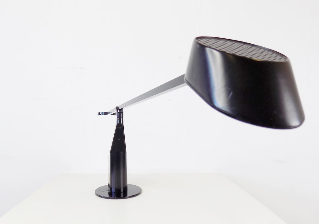 블랙코팅 알루미늄으로 제작된 알라 테이블램프는 사용감이 좋은 상태입니다. 코팅이 잘 보존되어 있으며 무게 측면에만 약간의 마모가 있습니다. 램프는 베이스와 암의 조인트에서 회전할 수 있어 엄청난 가변성을 제공합니다. 2단계의 조명 강도가 있습니다. Rodolfo Bonetto는 1959년부터 혁신적인 조명으로 유명한 이탈리아 Manufactory Guzzini를 위해 1983년에 이 램프를 디자인했습니다.
